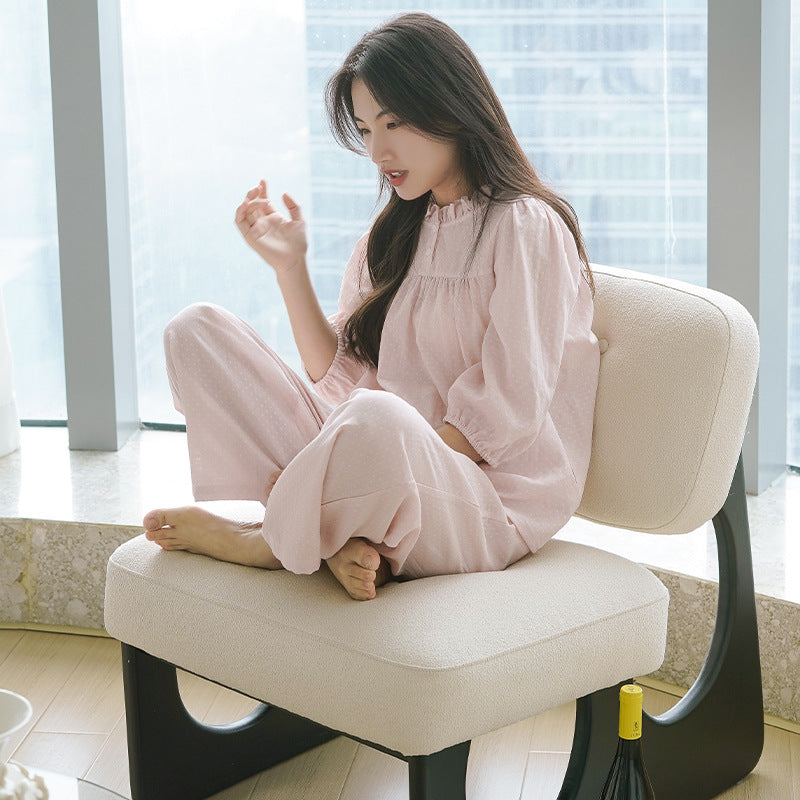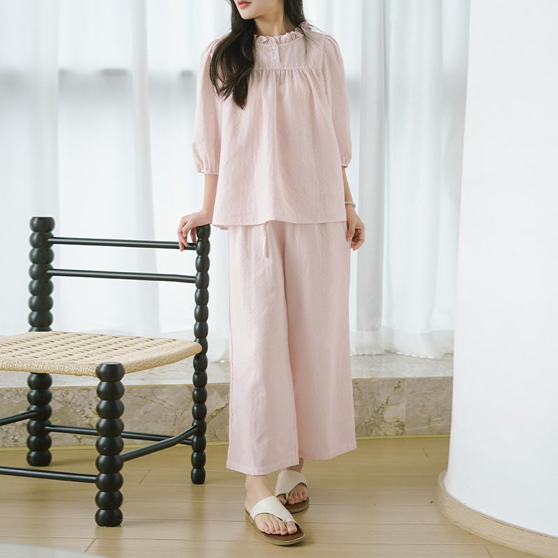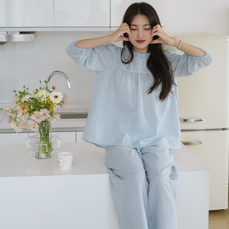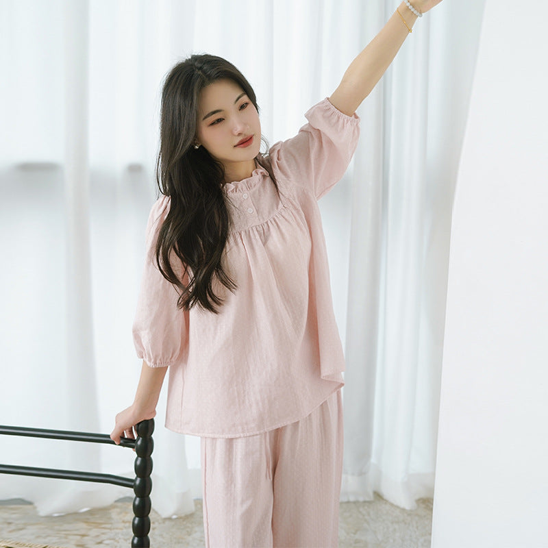 Japanese and Korean version of loose pullover pants set, sweet and cute lace pure cotton polka dot jacquard loose and casual two-piece set
