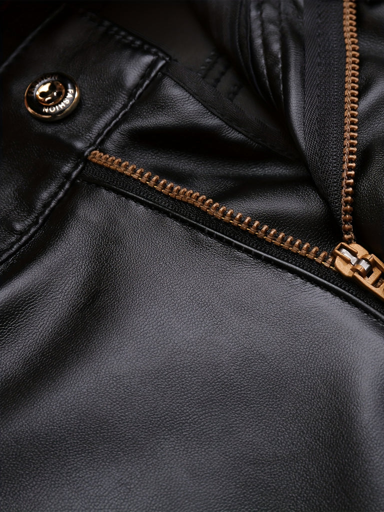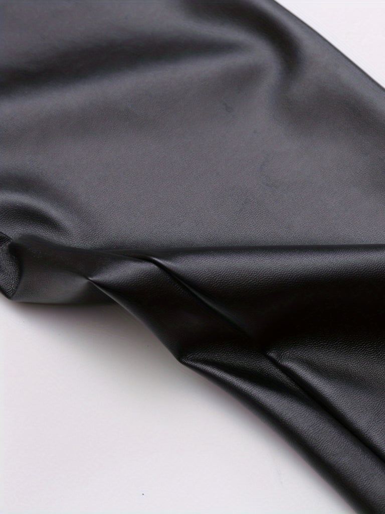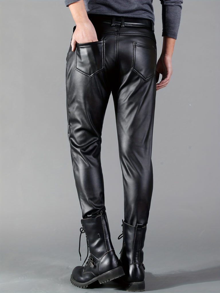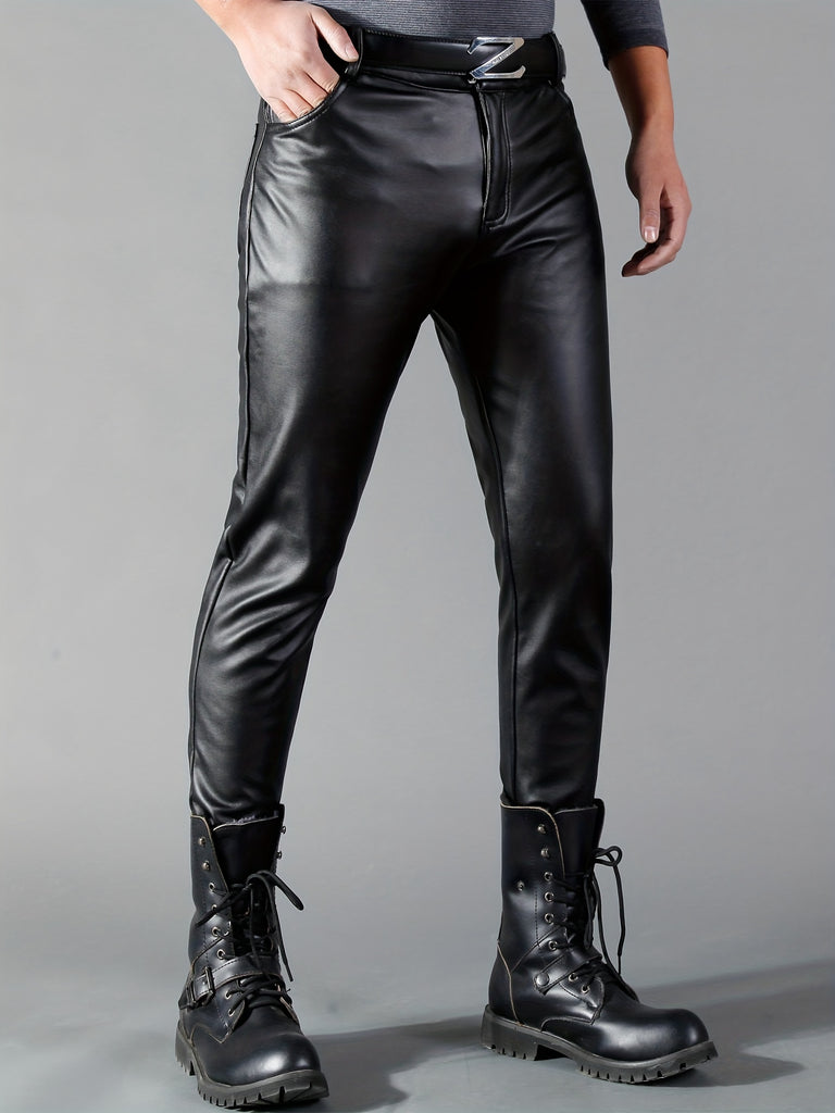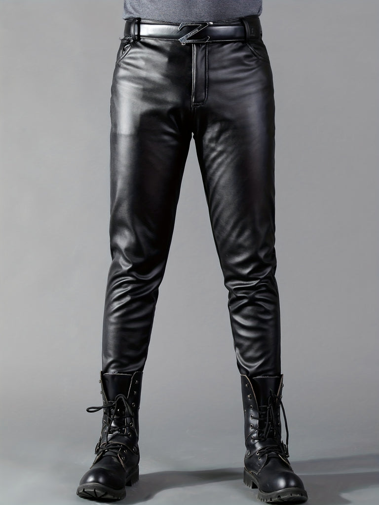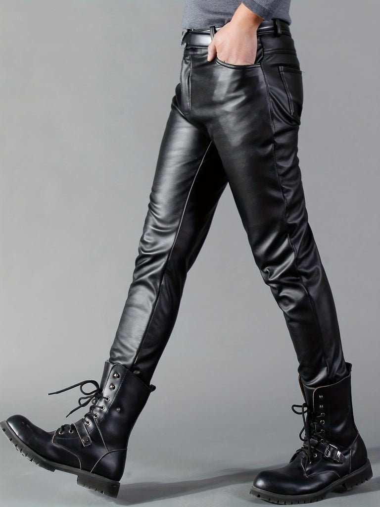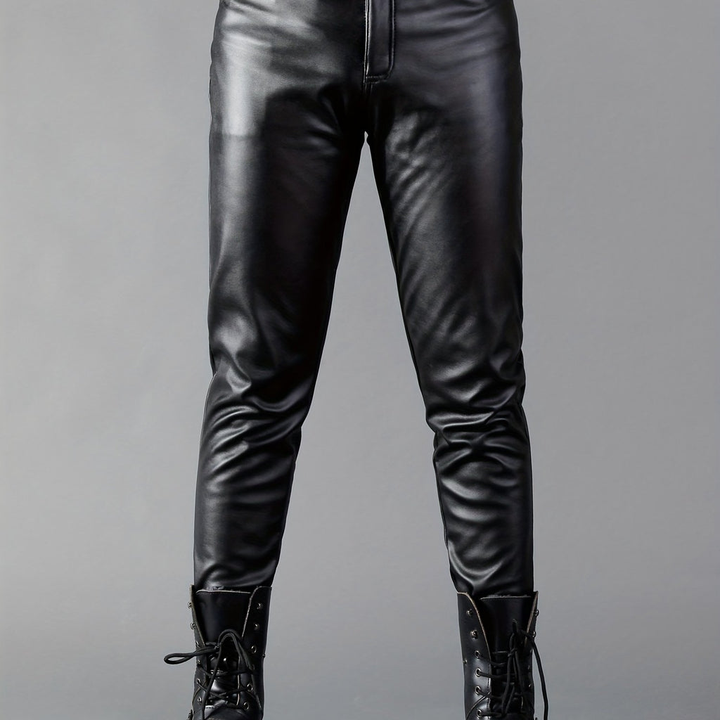 kkboxly Men's Chic PU Pants, Casual Slim Fit Medium Stretch Faux Leather Biker Pants For Spring Fall