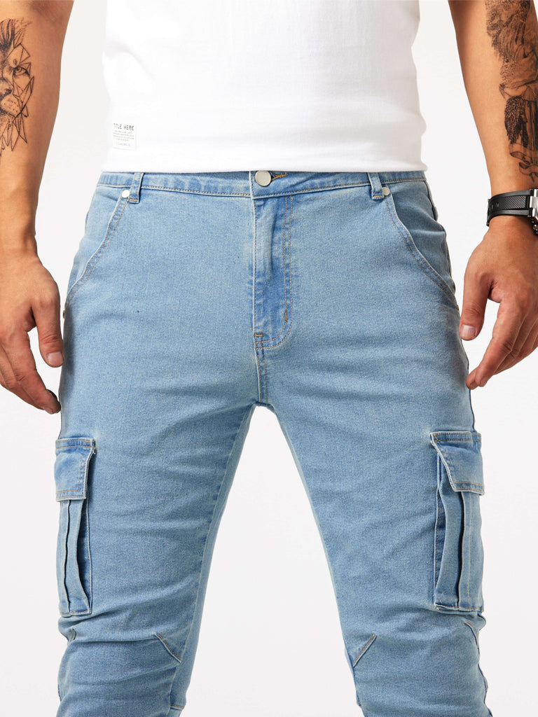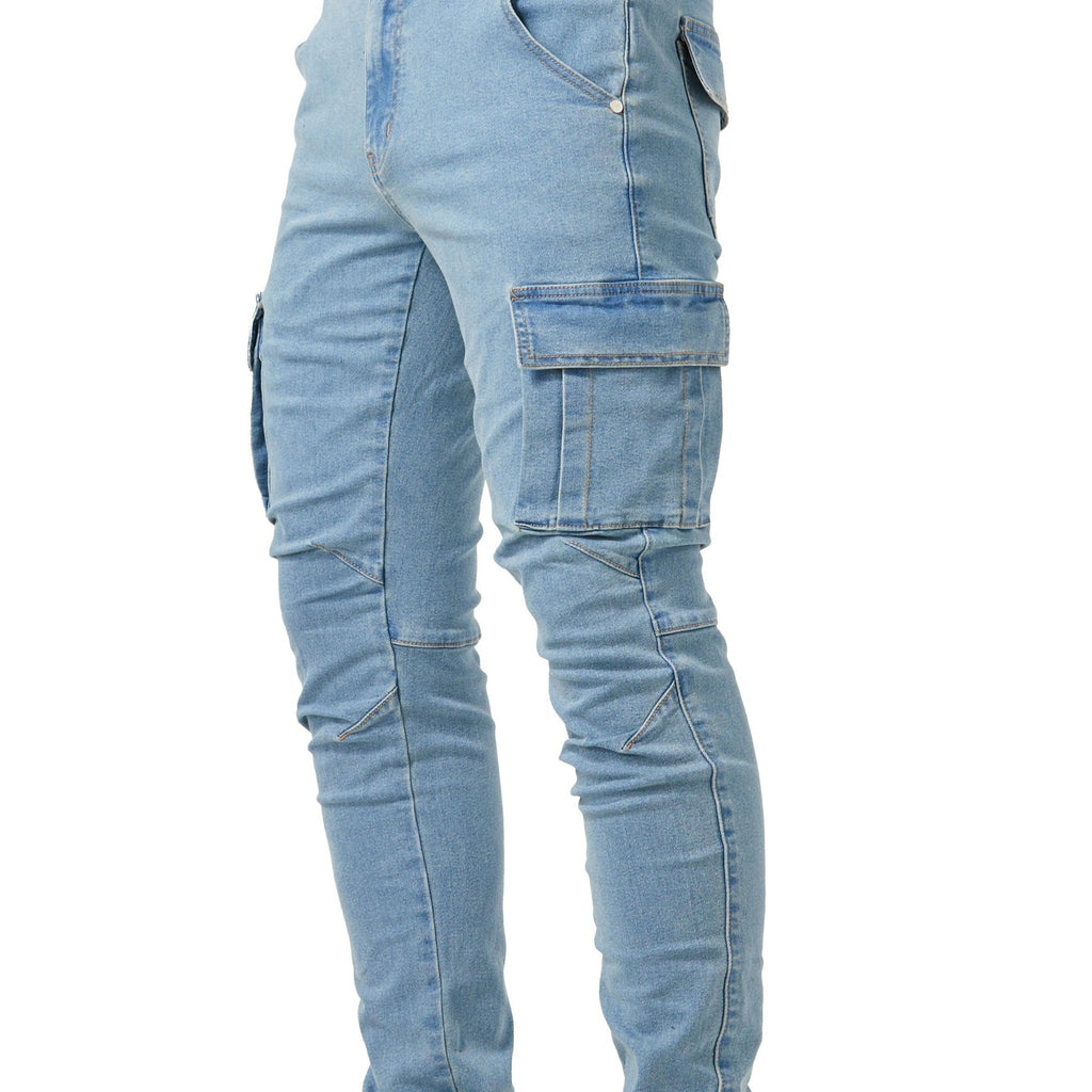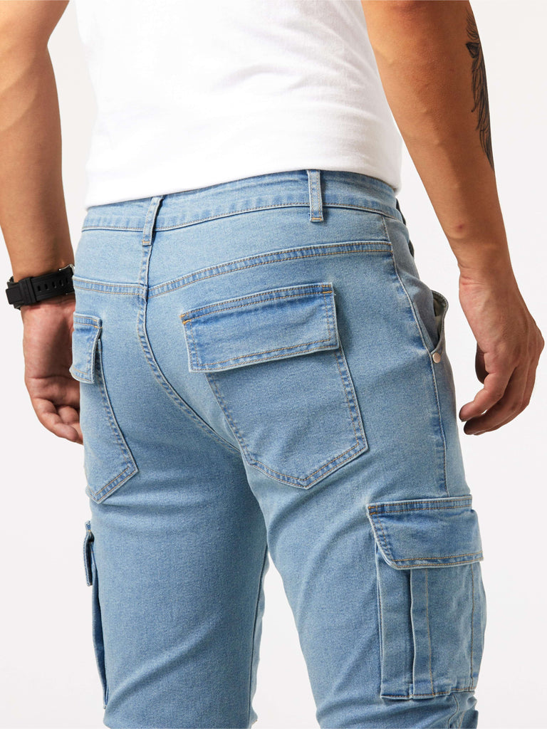 kkboxly Slim Fit Multi Pocket Jeans, Men's Casual Street Style Medium Stretch Denim Cargo Pants