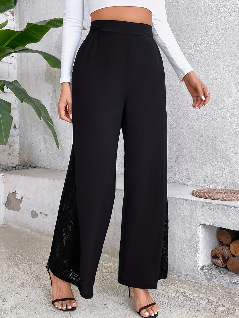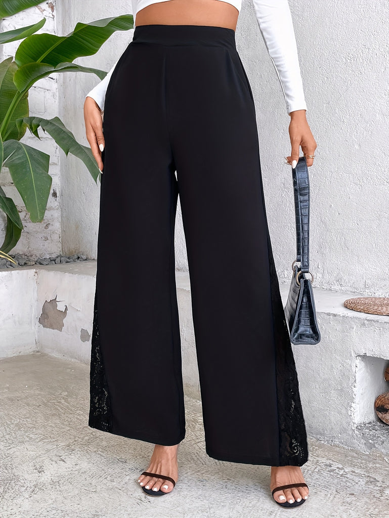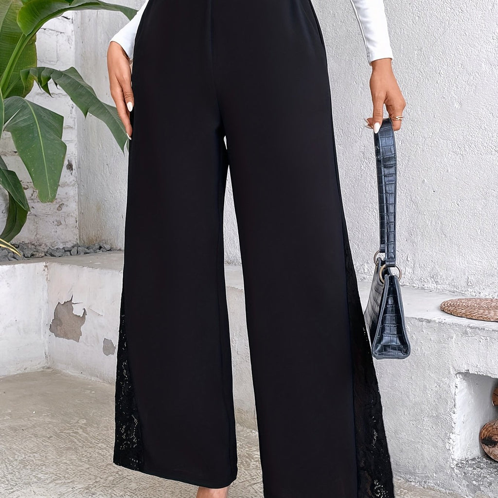kkboxly Solid Color Wide Leg Pants, Elegant Contrast Lace Loose Pants For Every Day, Women's Clothing
