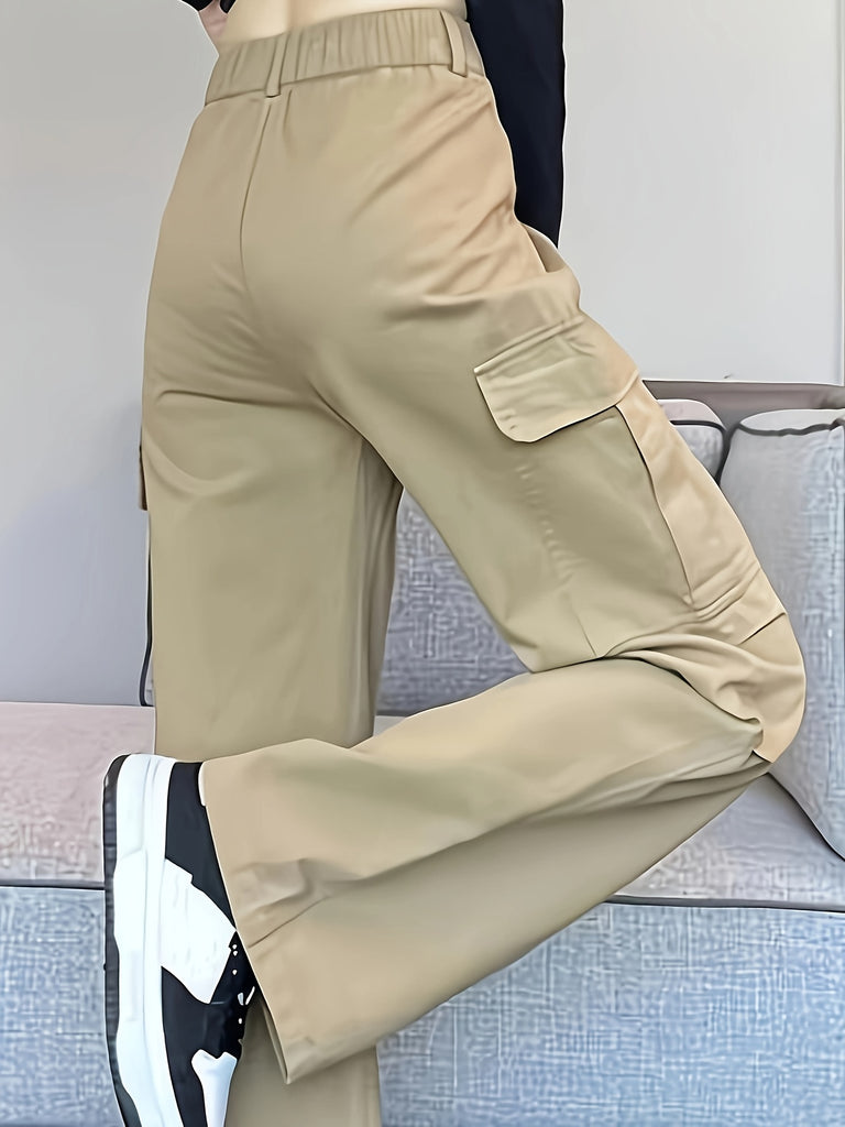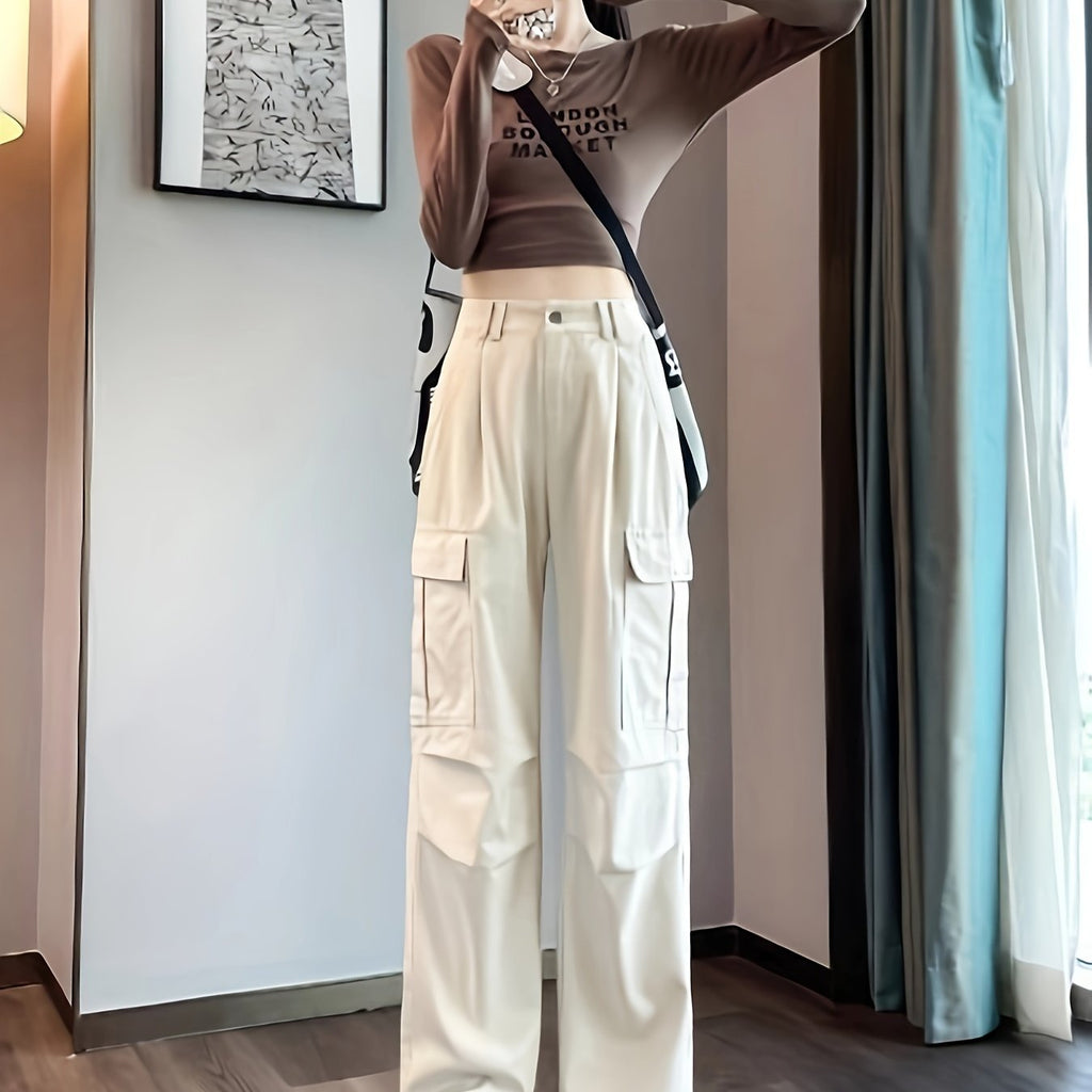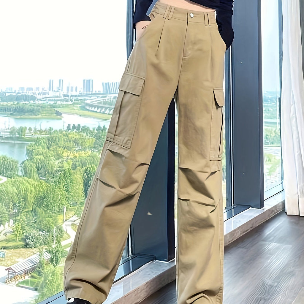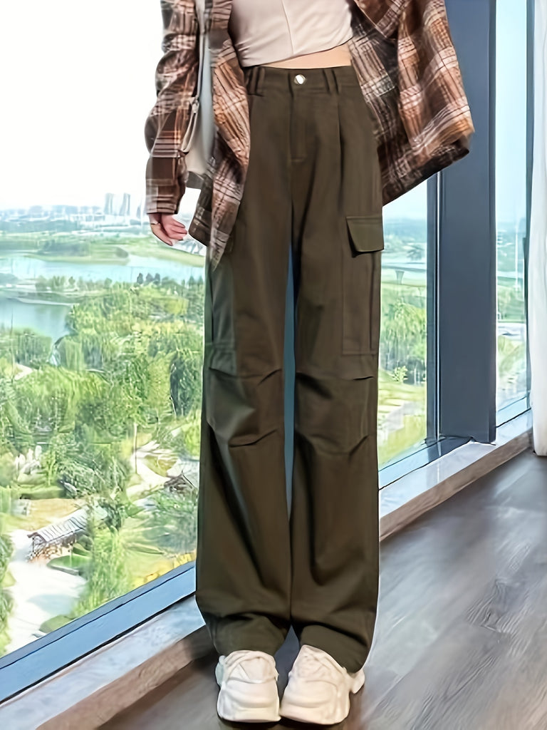 kkboxly Solid Straight Leg Cargo Pants, Y2K Flap Pocket High Waist Loose Pants, Women's Clothing