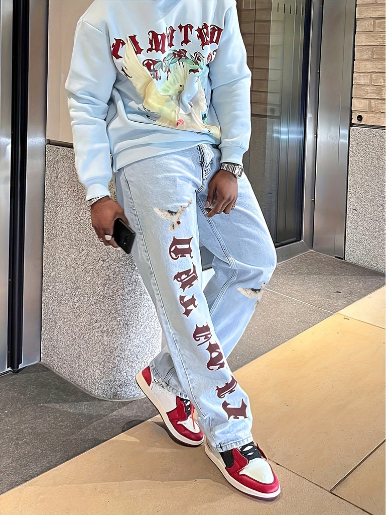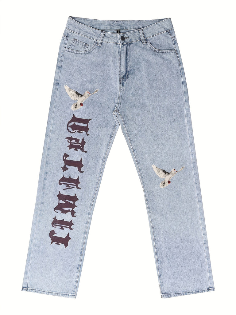 kkboxly Y2K Baggy Dove Letter Print Jeans, Men's Casual Street Style Solid Color Slightly Stretch Denim Pants For Spring Summer