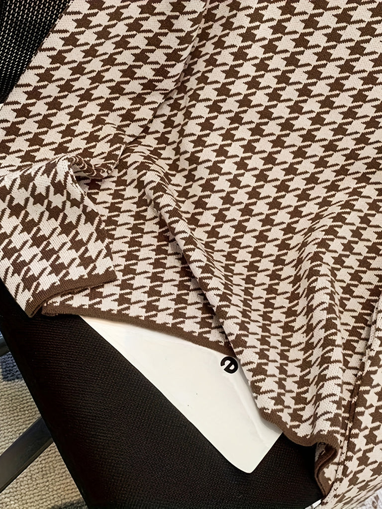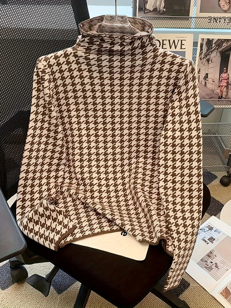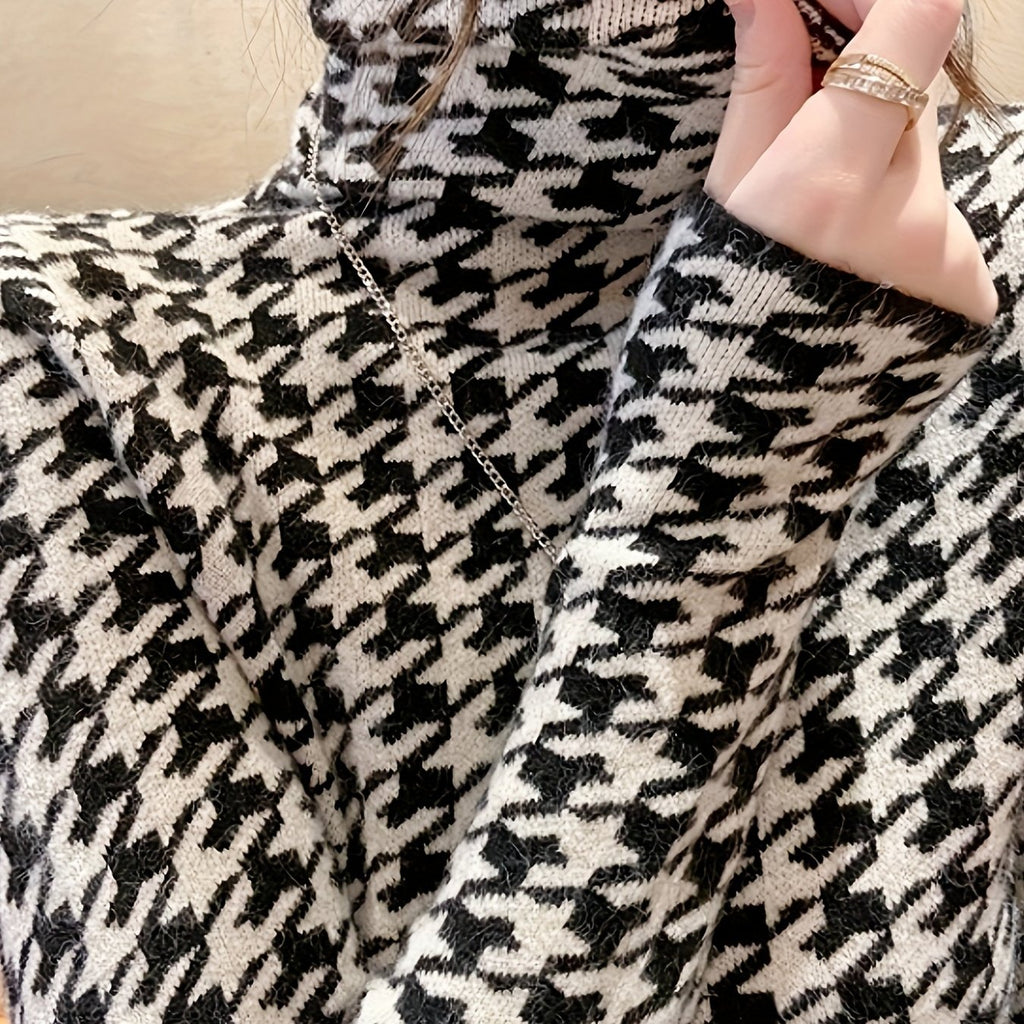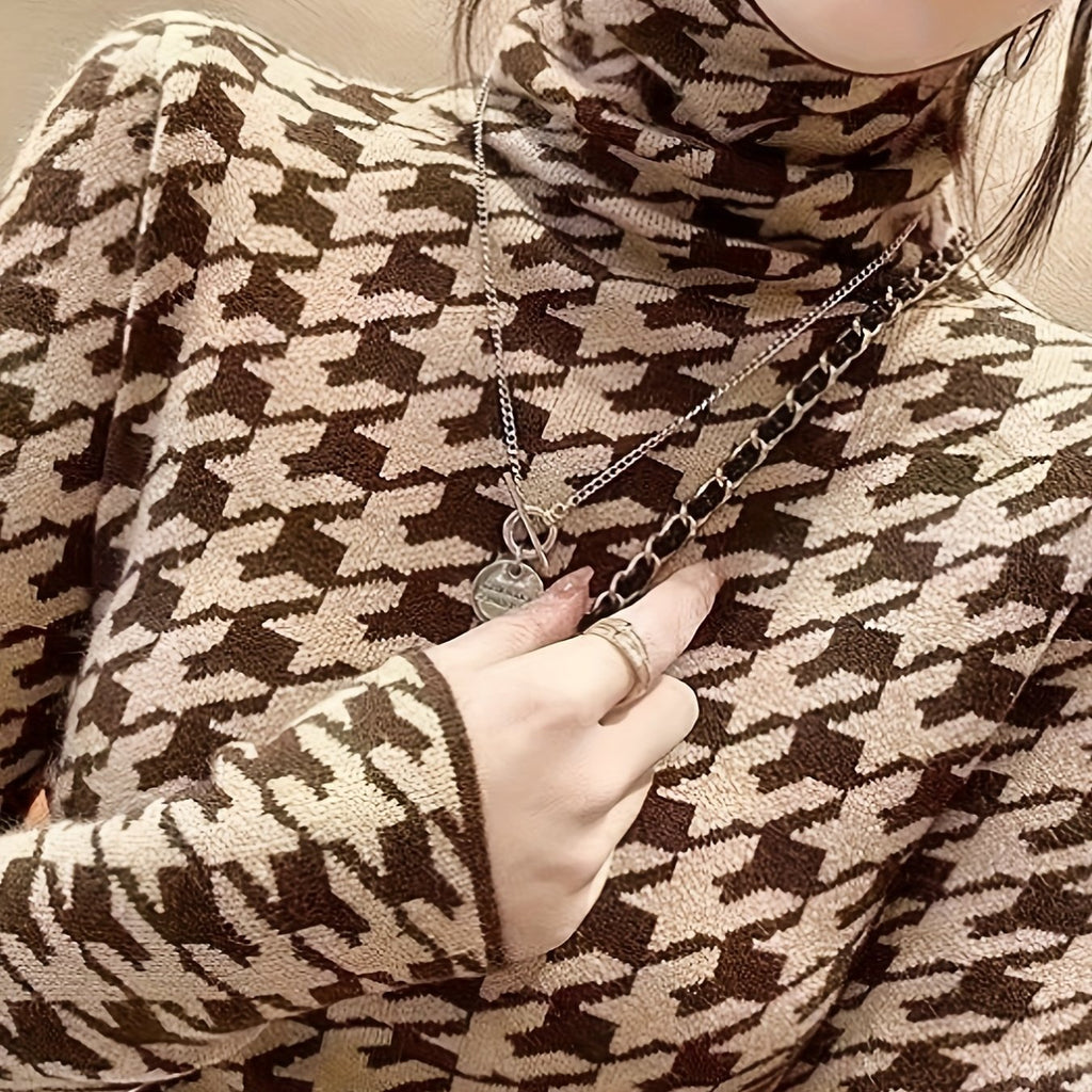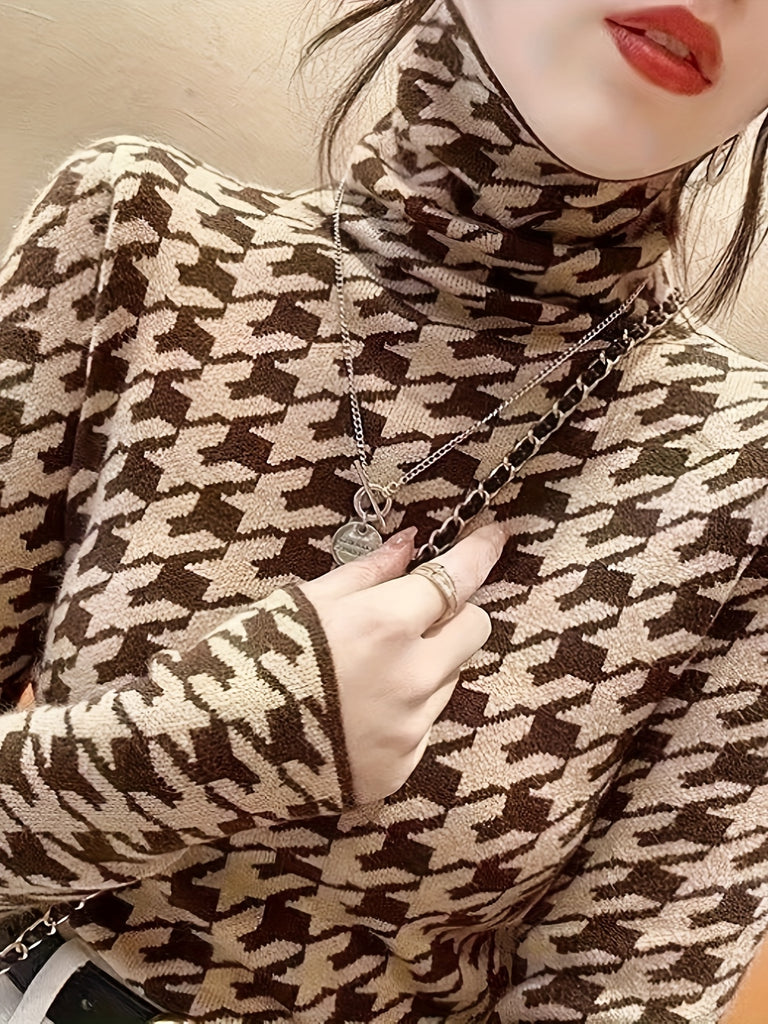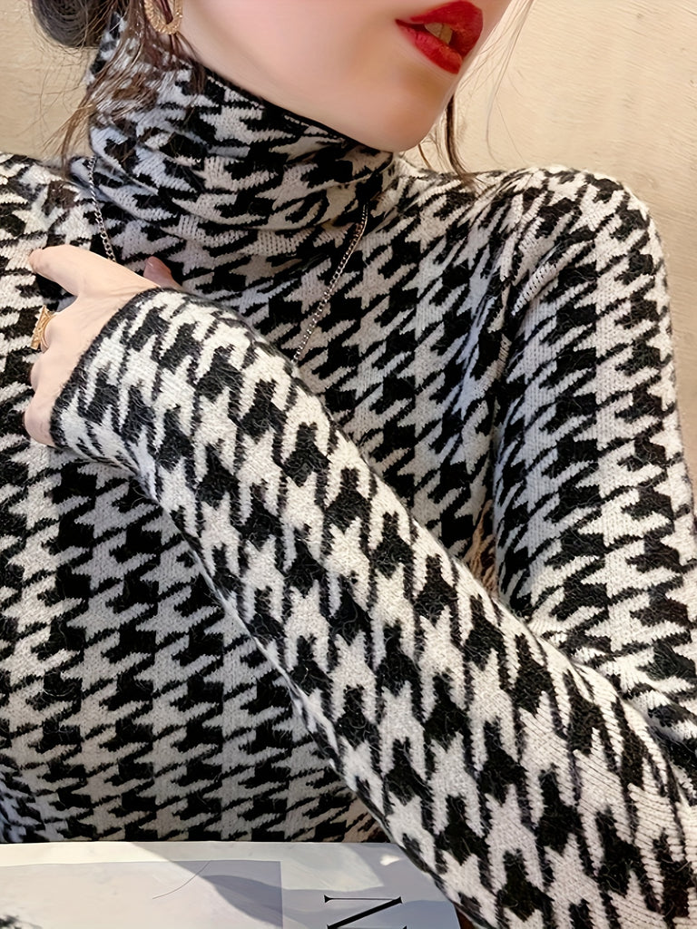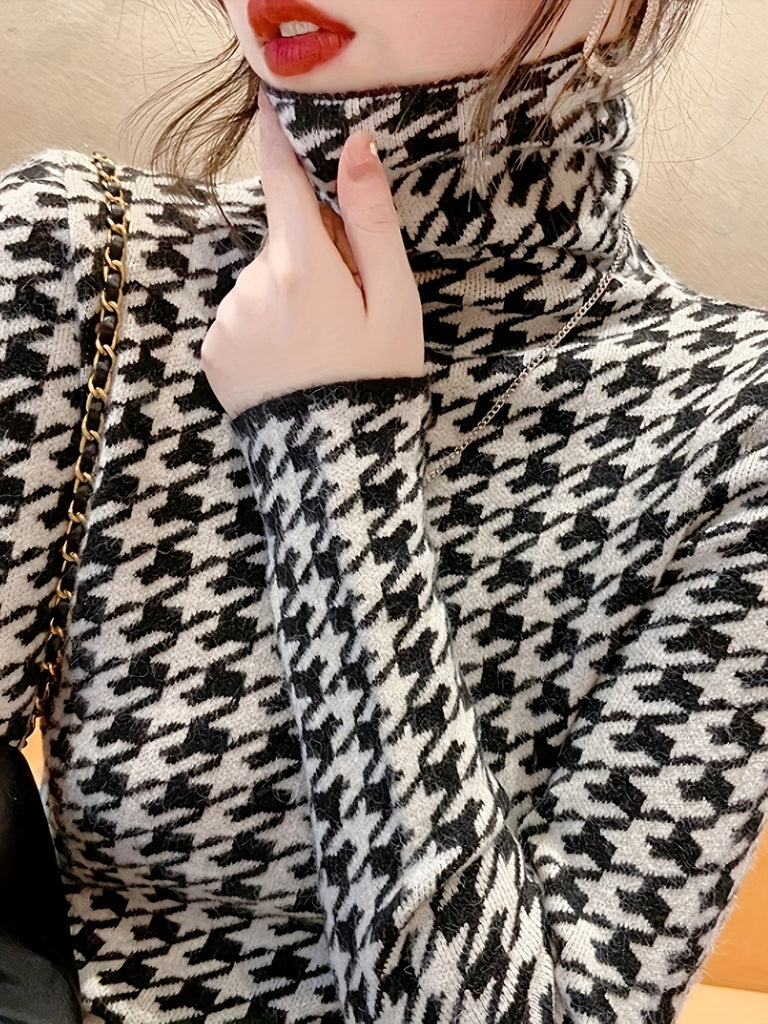 kkboxly Houndstooth Pattern Turtle Neck Pullover Sweater, Elegant Long Sleeve Slim Versatile Sweater, Women's Clothing
