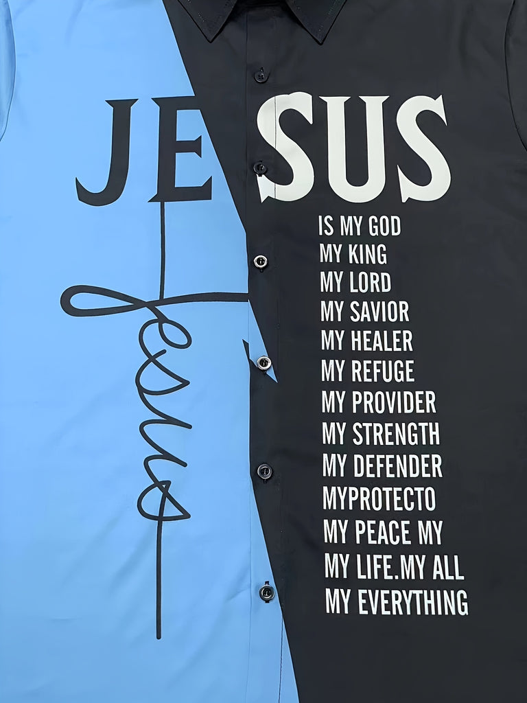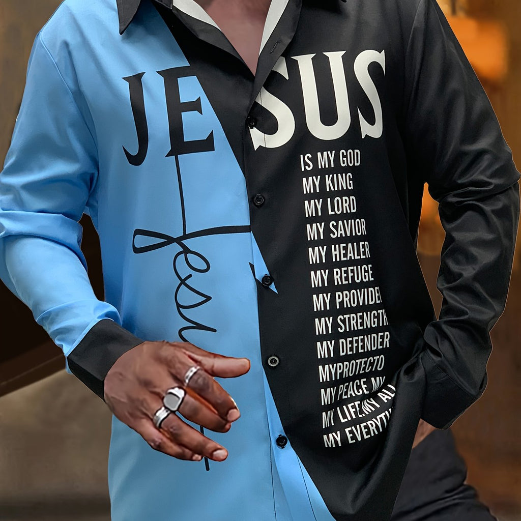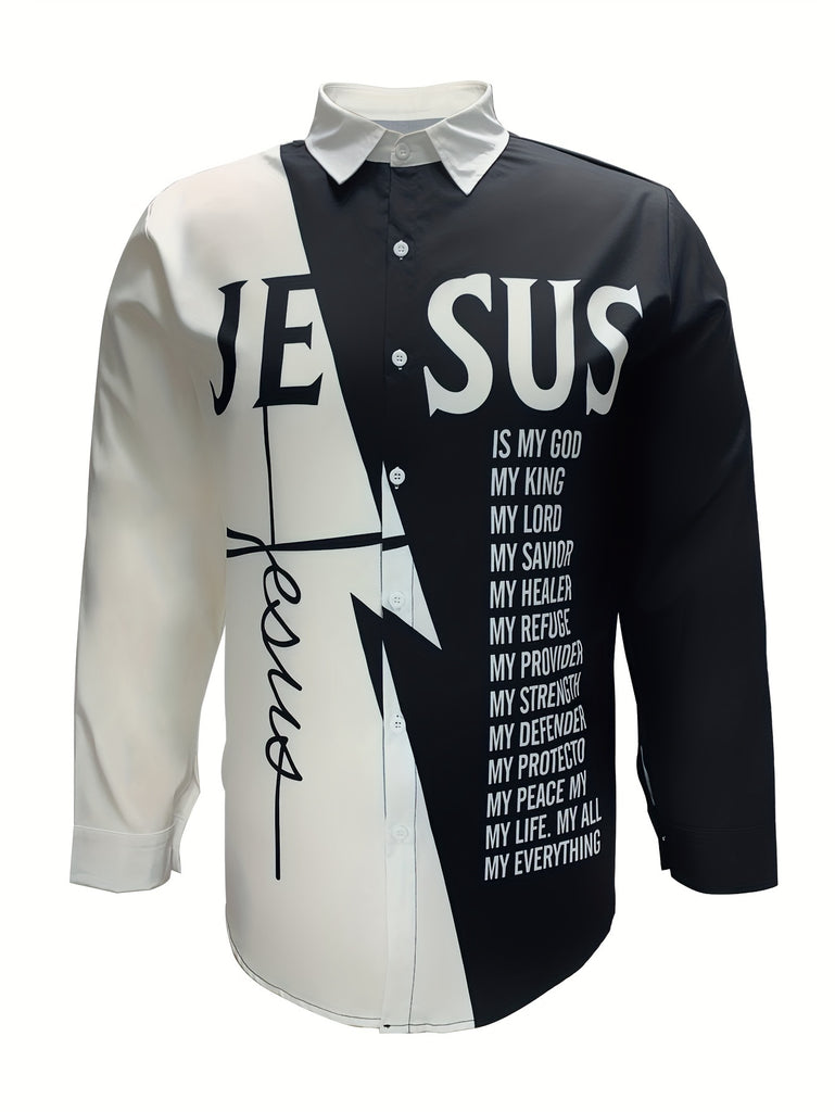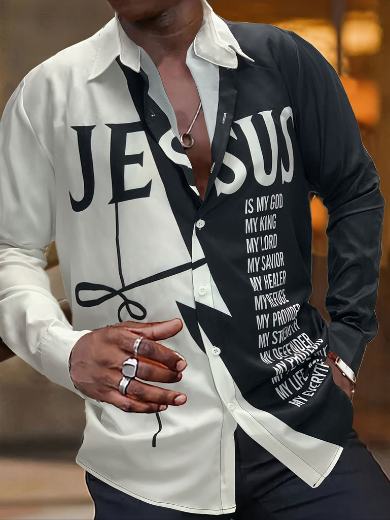 kkboxly Plus Size Jesus Pattern Men's Shirt Top Turn-Down Collar Long Sleeve Closure Male Casual Shirt For Men Daily Vacation Streetwear, Men's Clothing
