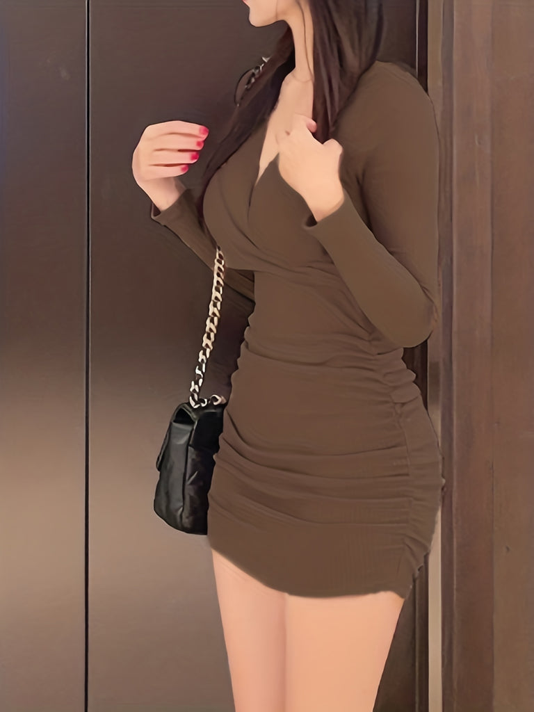 kkboxly Solid Bodycon Mini Dress, Party Wear V Neck Long Sleeve Dress, Women's Clothing