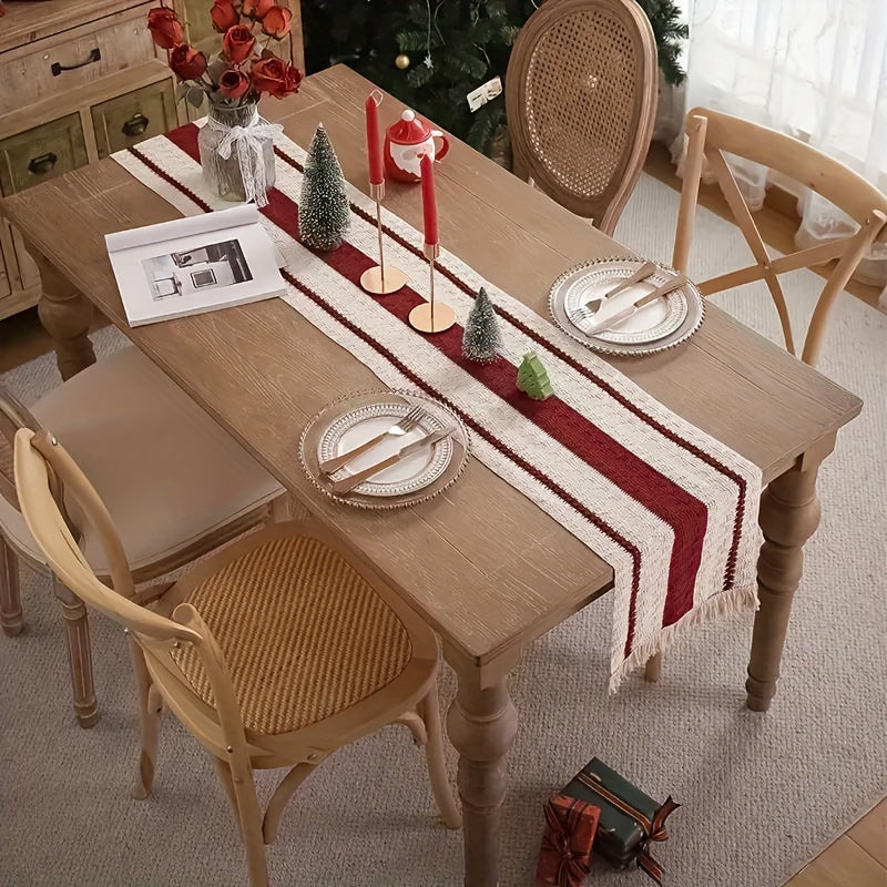 1pc Rustic Linen-Cotton Blend Table Runner with Tassels - Handwoven Design Striped Polyester Rectangle for Christmas & Everyday Gatherings