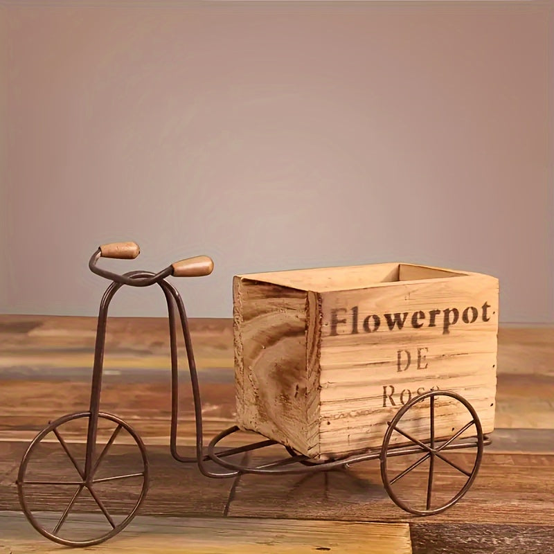 1pc Rustic Wooden Tricycle Planter - Vintage Iron Bicycle Flower Pot Holder with Farmhouse Decor - Ideal for Indoor/Outdoor Garden Display, Home & Office Desk, and Holiday Gift Decorations