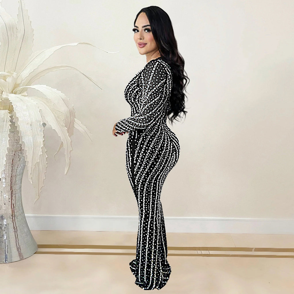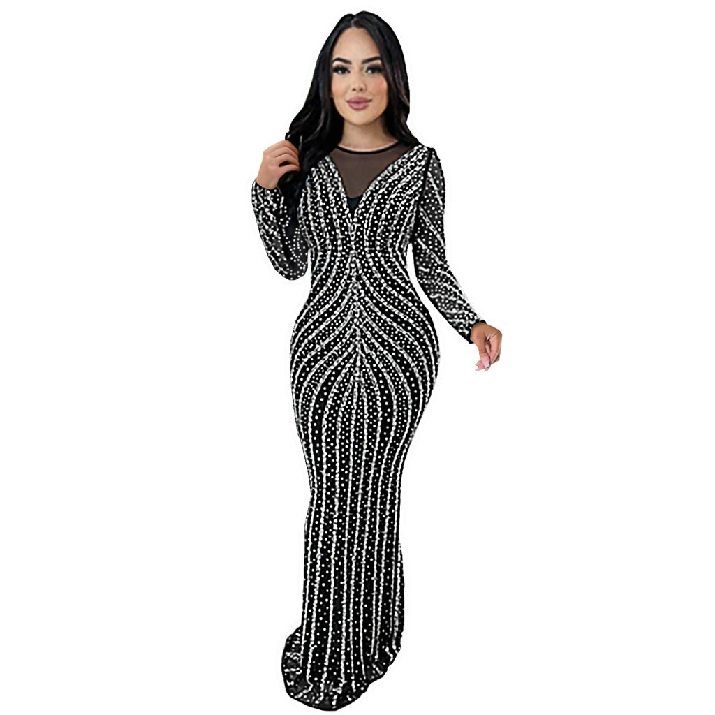 2025 C7176 Popular and Fashion Women's Clothing Hot Diamond Slim-fit Long Dress Long Sleeve Mesh Dress