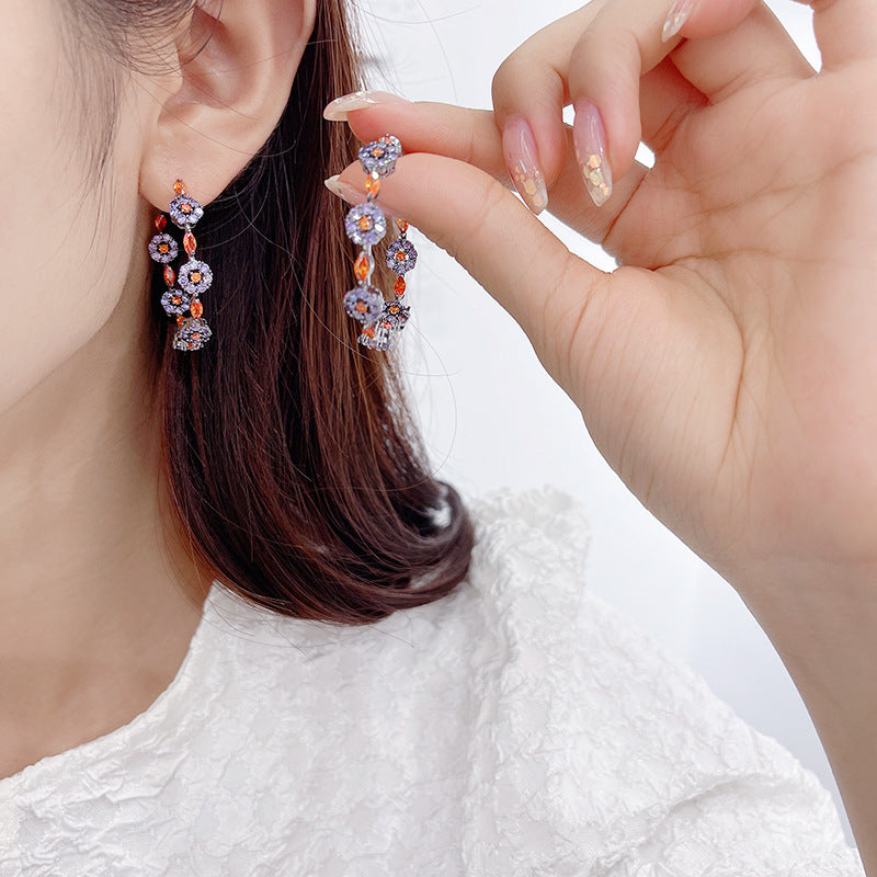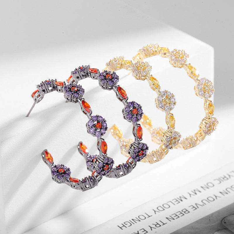 2025 Korean version of fashionable retro earrings, cold wind personality, black bottom circle, colored zircon silver needle earrings, flower earrings.