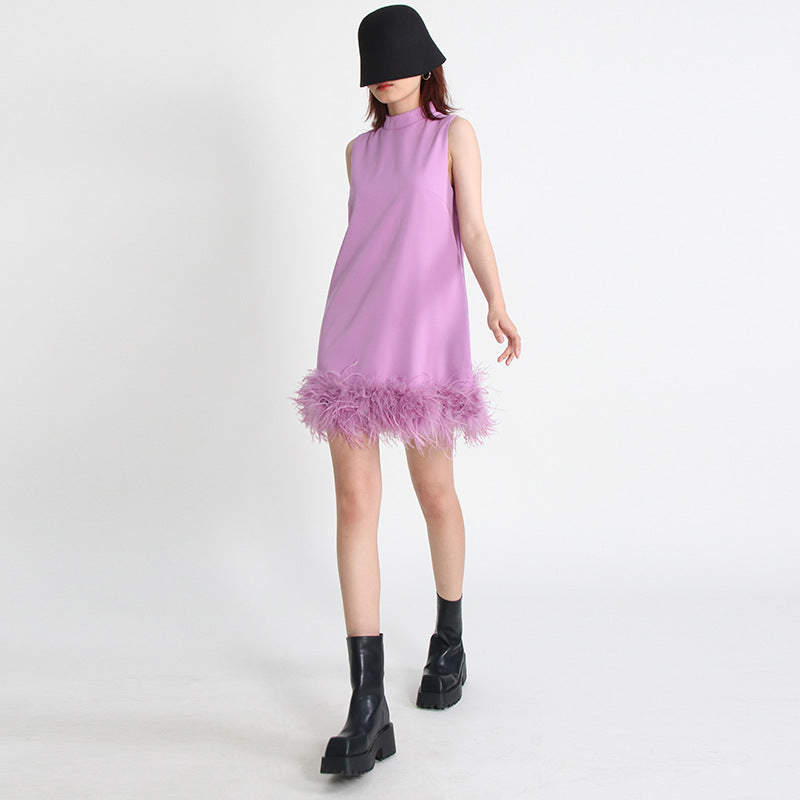 2025 Niche design sense solid color A-shaped skirt spring round neck sleeveless hem ostrich hair decorative loose dress