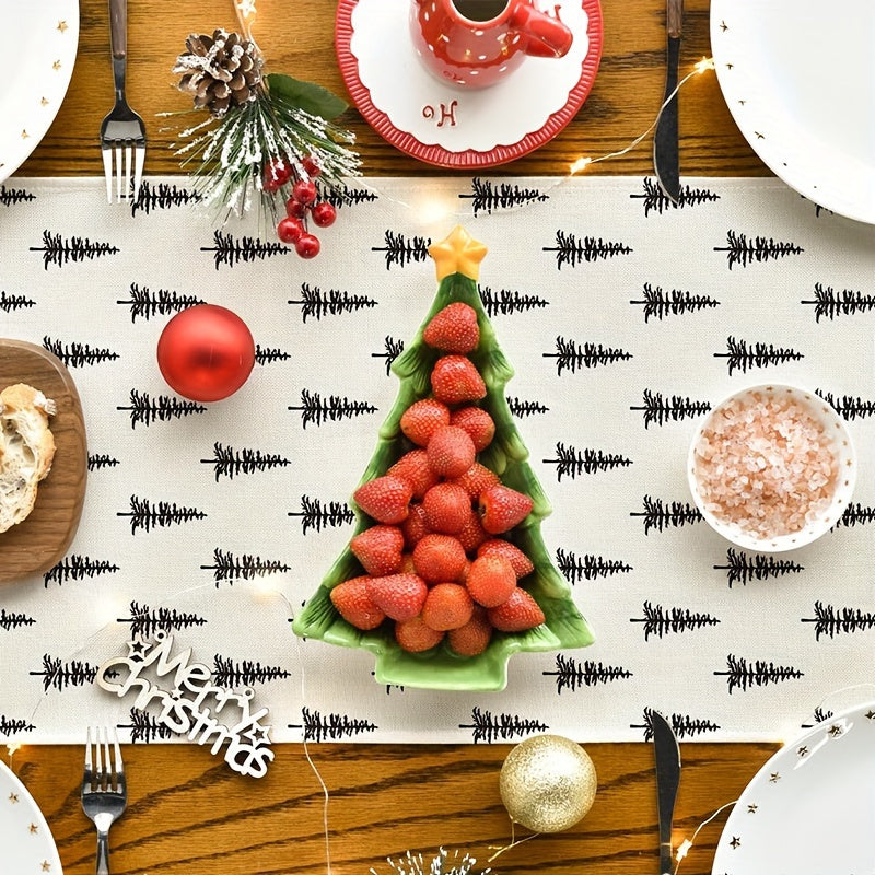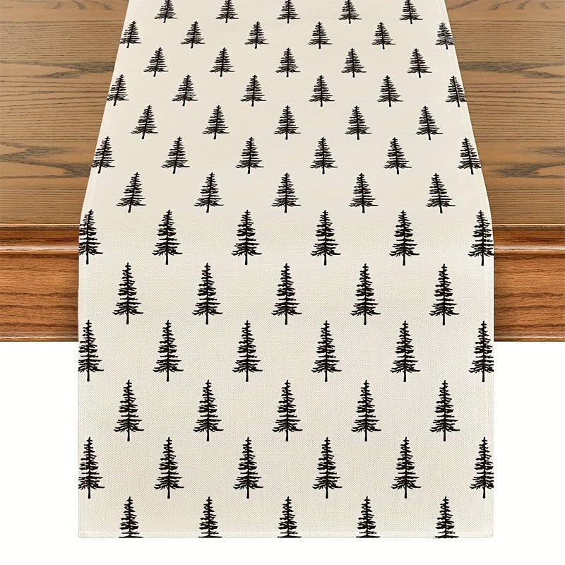 Christmas Tree Linen Table Runner - Woven Rectangular Holiday Table Decoration, Solid Beige with Tree Design, 100% Linen Christmas Dining Decor for Home & Party - 1pc