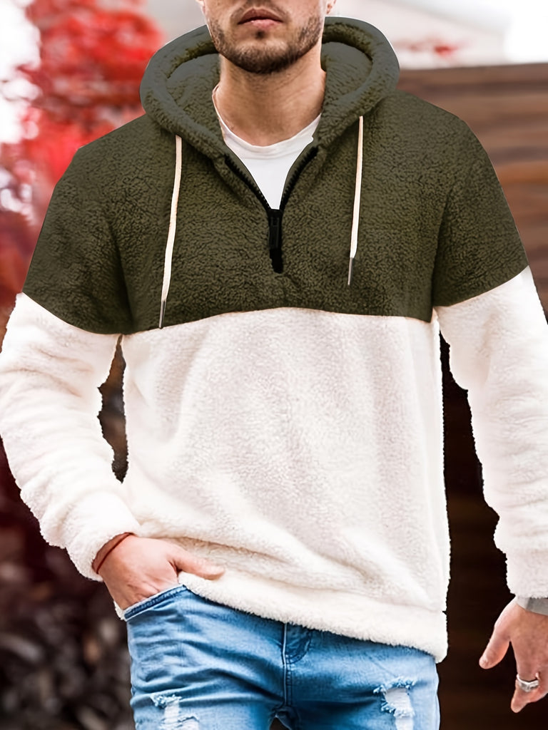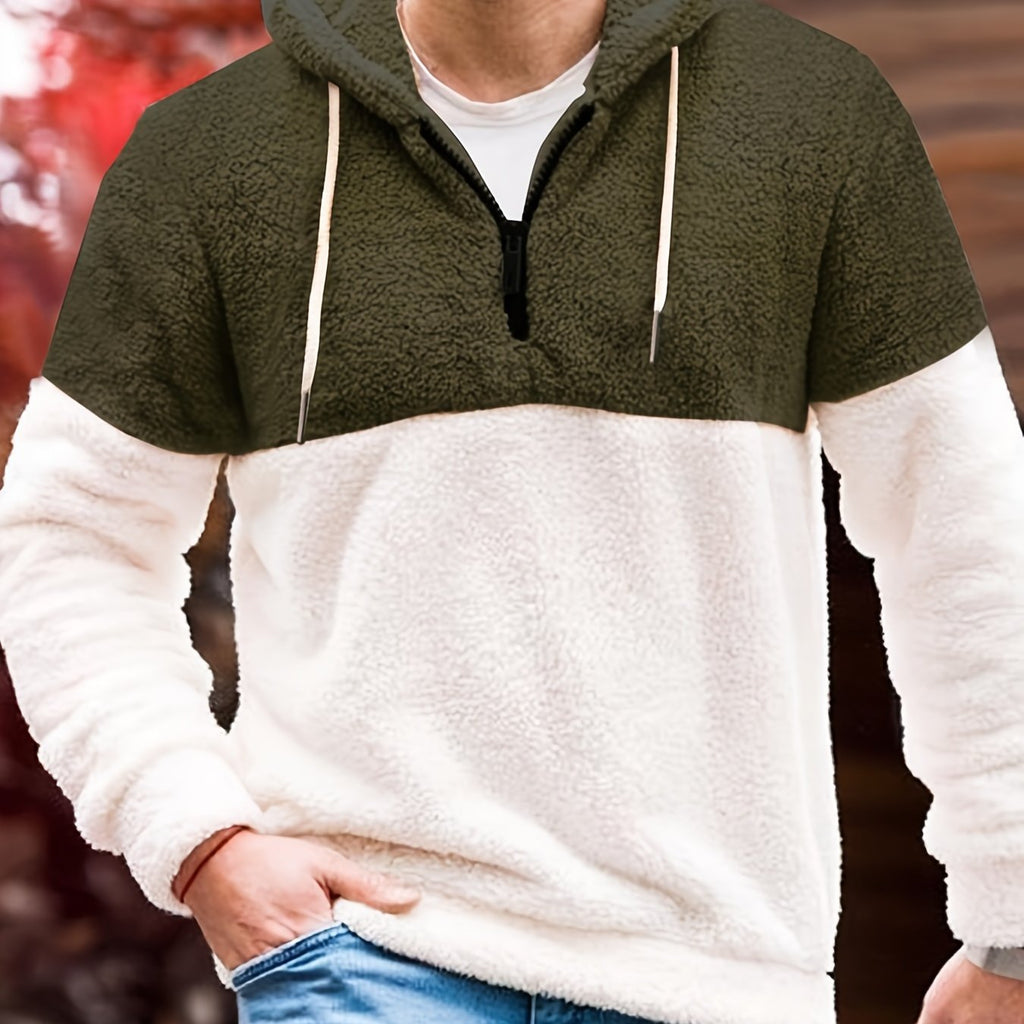 Cool Fluffy Thermal Hoodies For Men, Men's Casual Color Block Polar Fleece Pullover Hooded Sweatshirt With Kangaroo Pocket Streetwear For Winter Fall, As Gifts