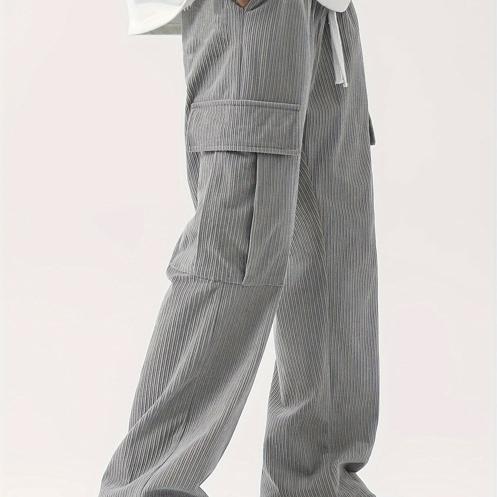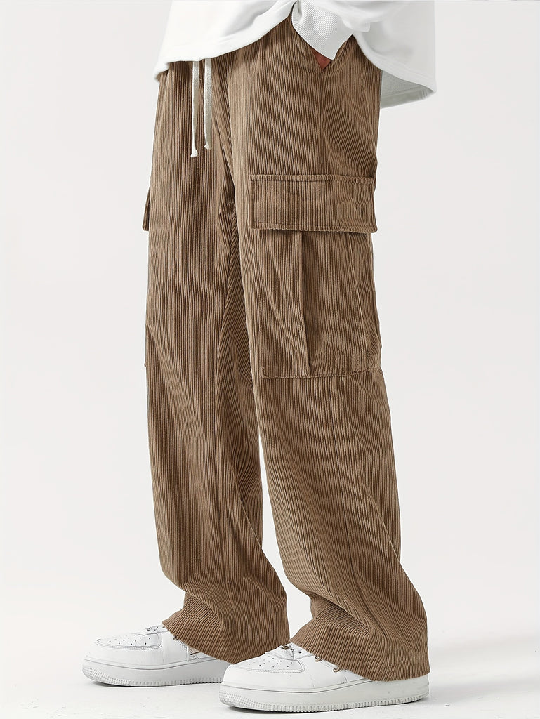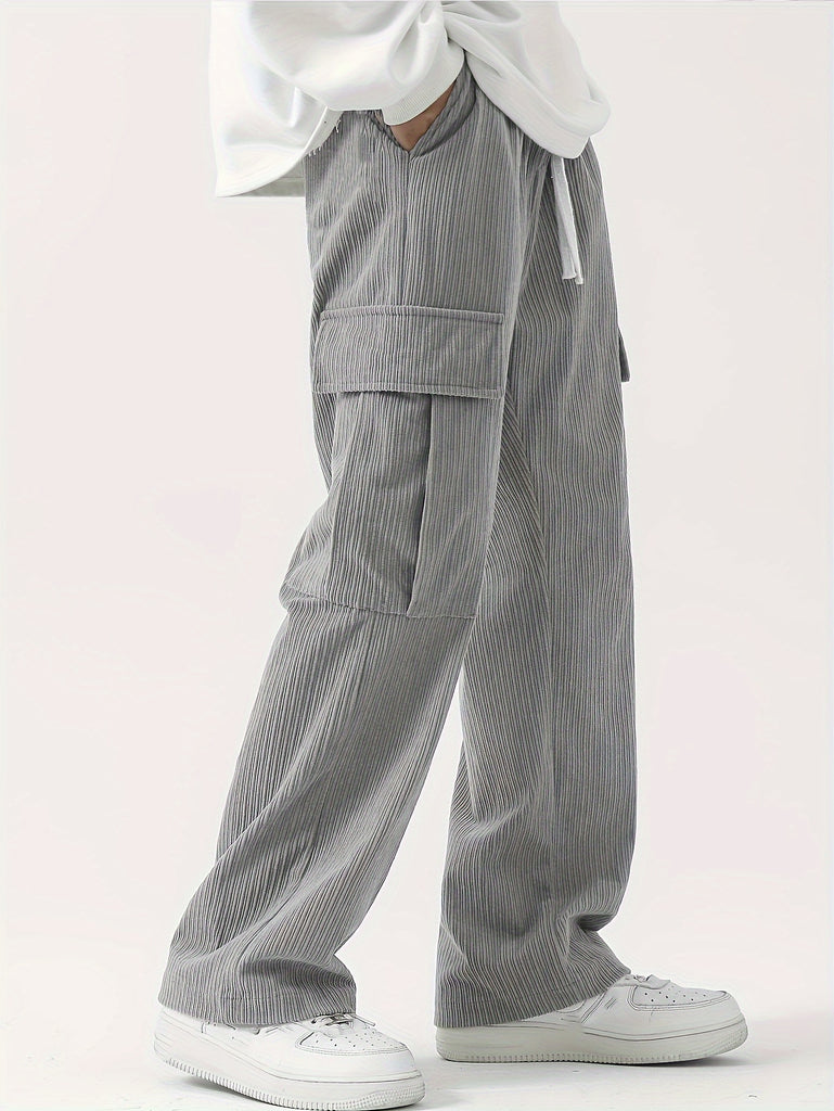 Corduroy Multi Flap Pockets Men's Straight Leg Cargo Pants, Loose Baggy Pant Casual Outdoor Pants, Men's Work Pants For Hiking Fishing Angling