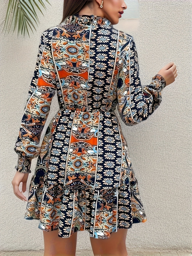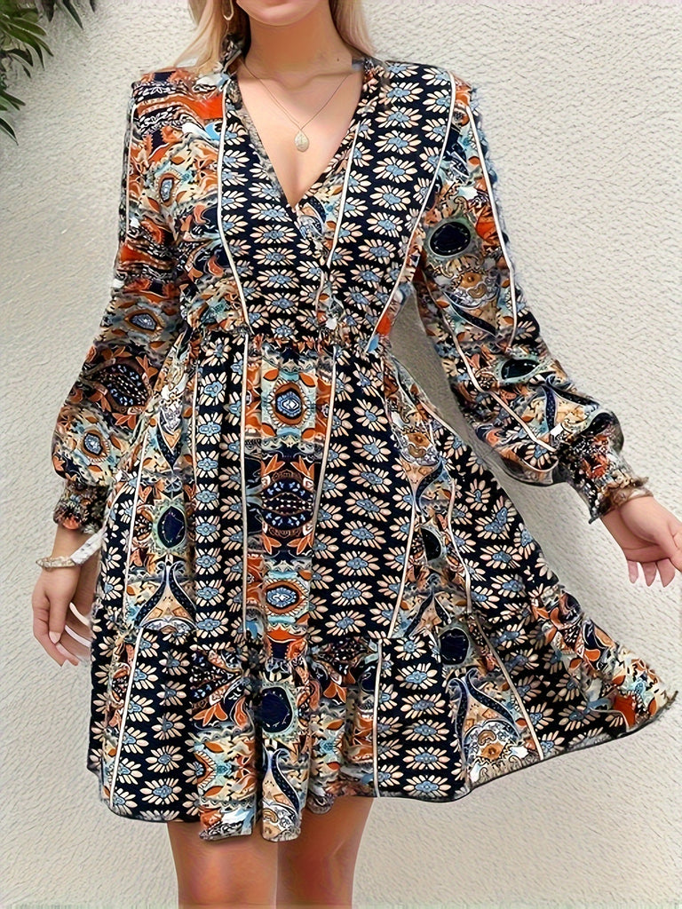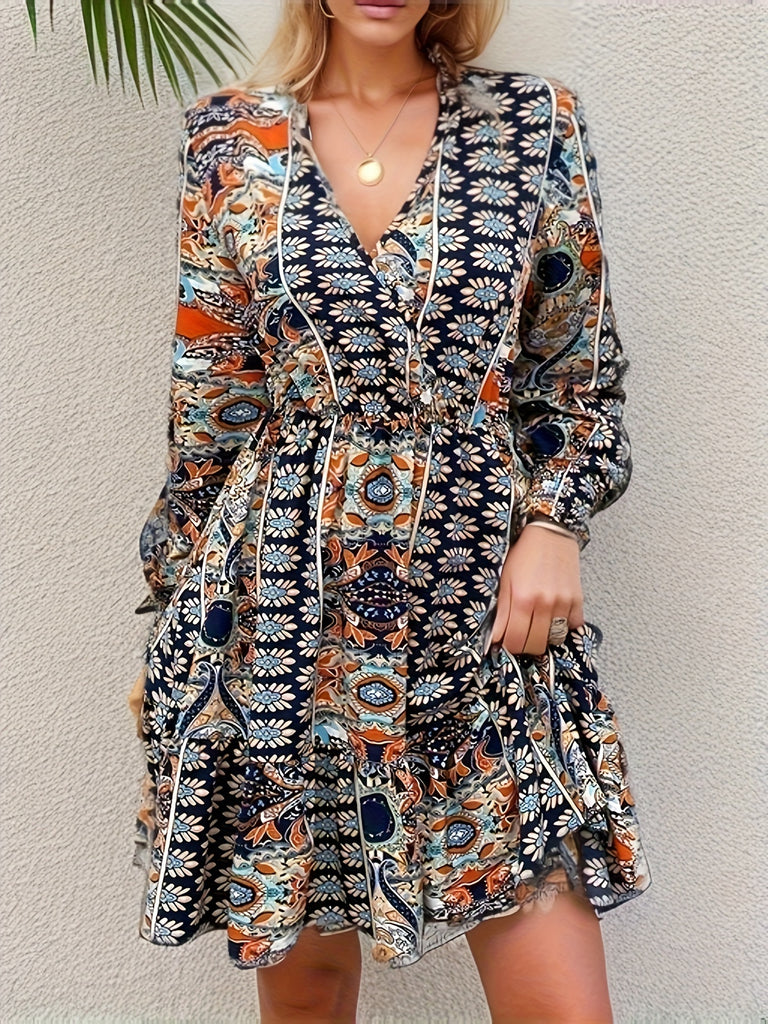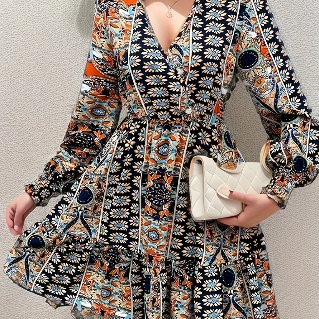 Ethnic Print Ruffle Hem Dress, Elegant V Neck Long Sleeve Dress, Women's Clothing