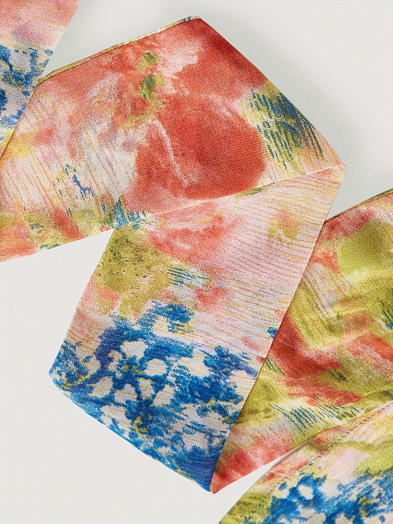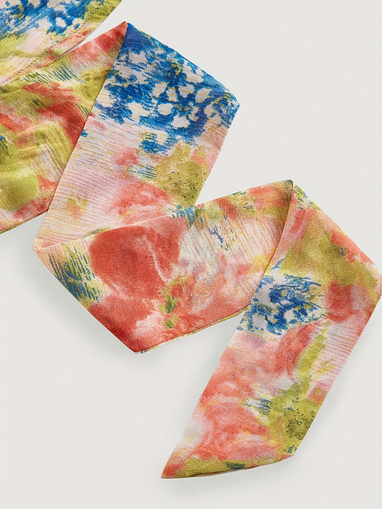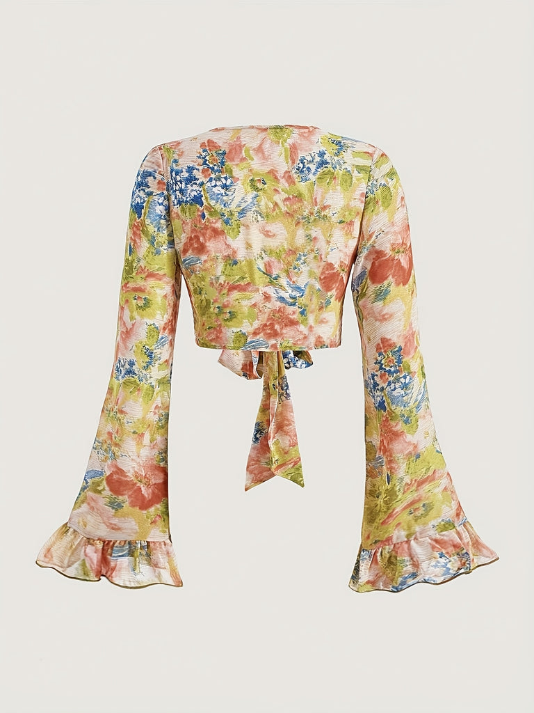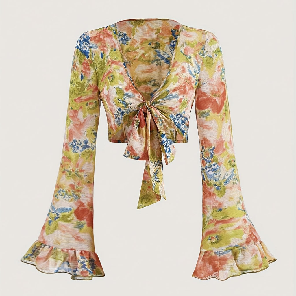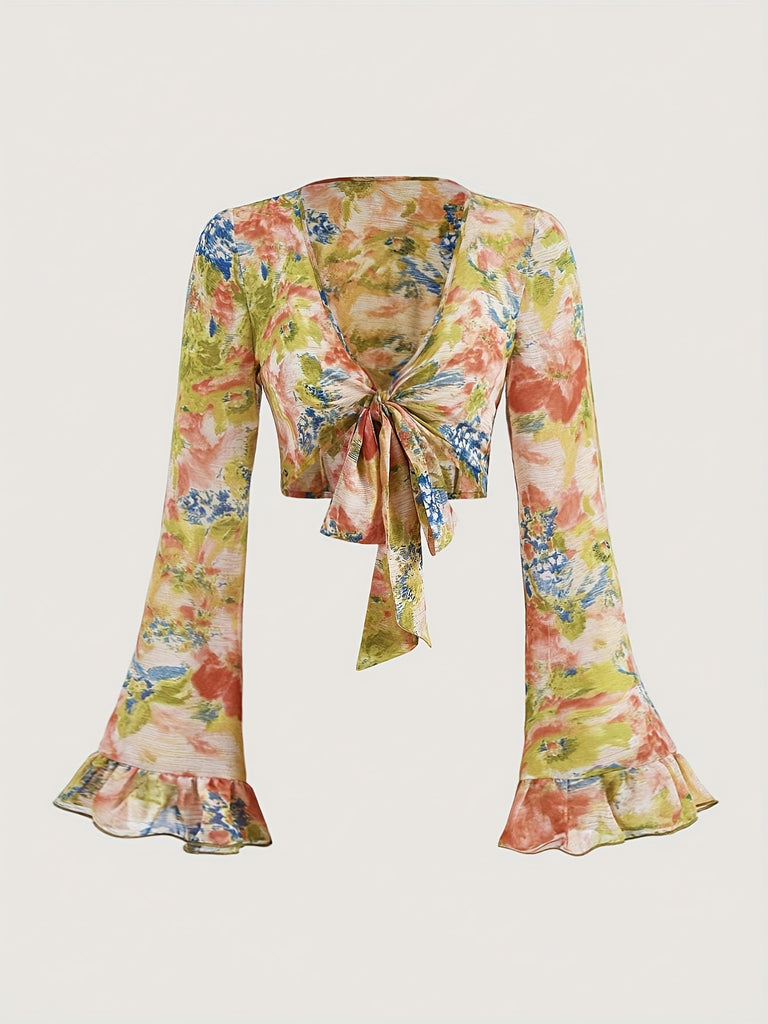 Floral Print Knotted Blouse, Vintage Flared Sleeve V Neck Blouse, Women's Clothing