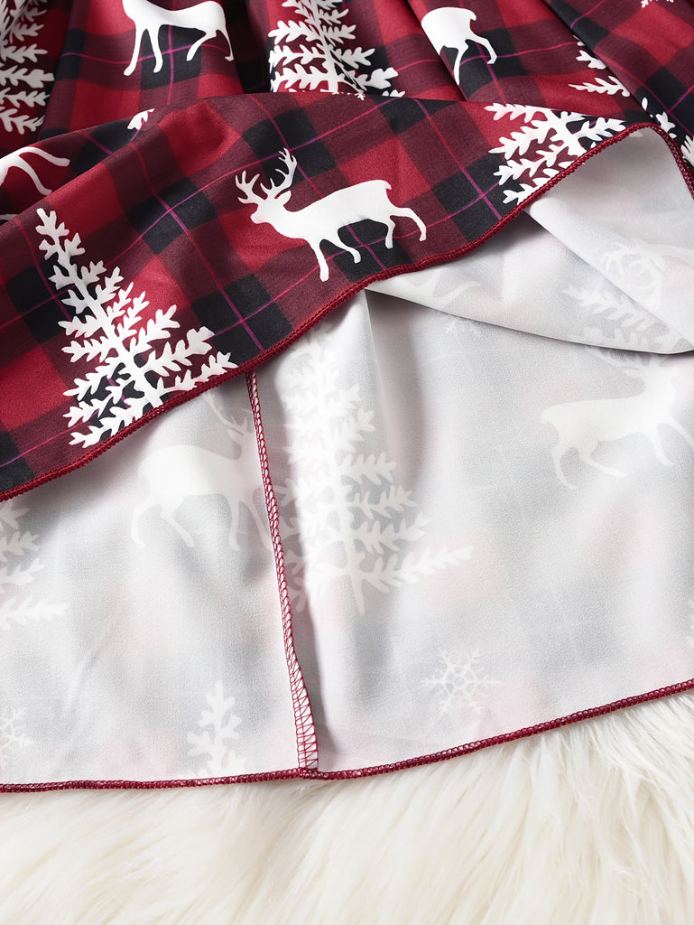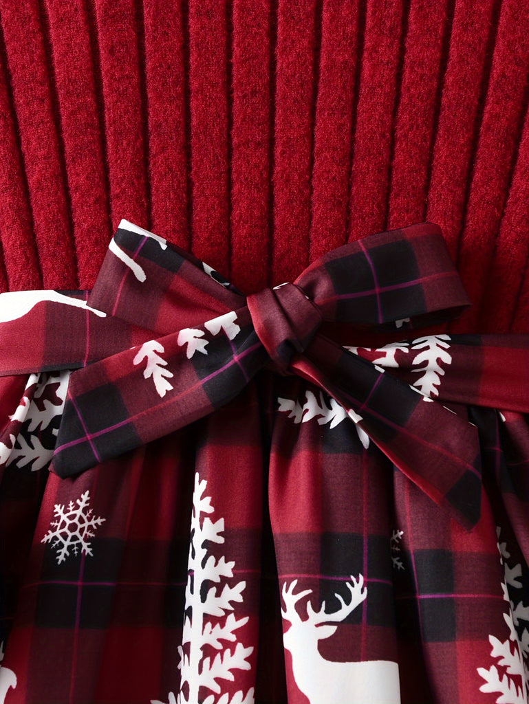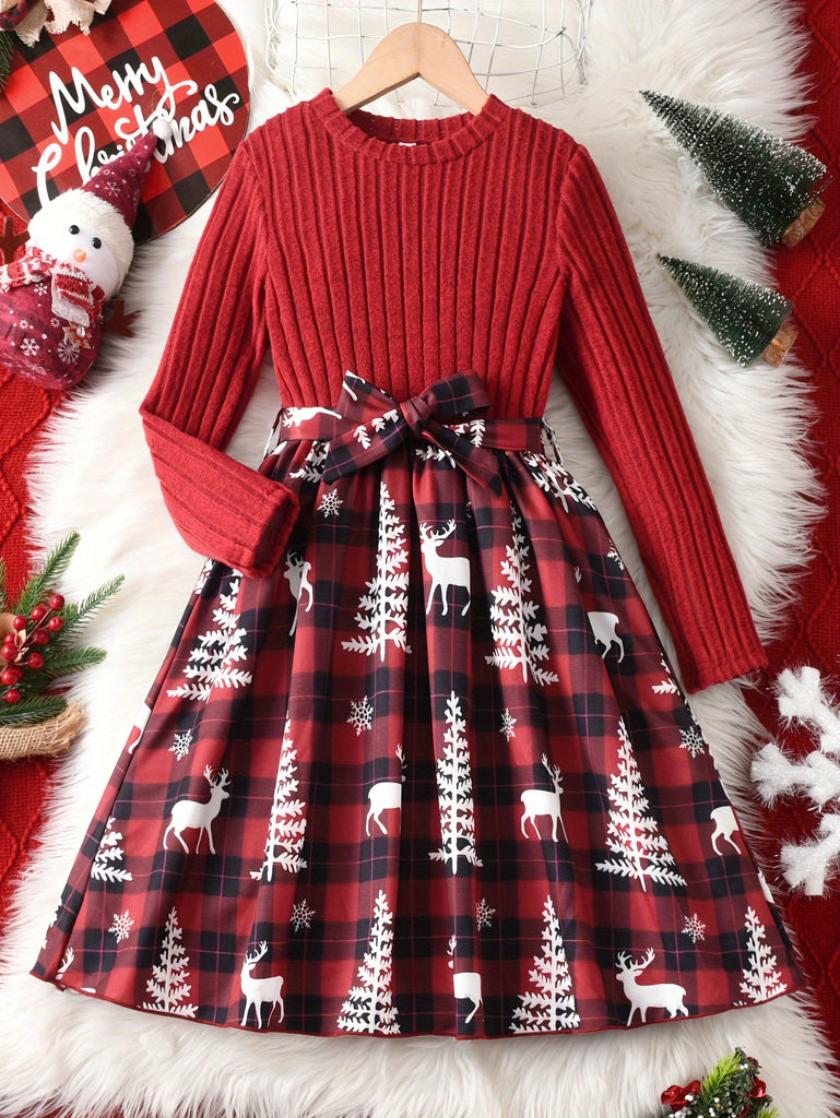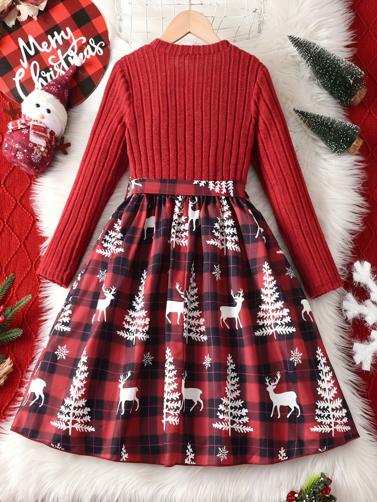 GOKISTOTR Girls' Christmas Dress, Elegant Fashion, Long Sleeve, Polyester, Round Neck, Mid-Length, A-Line, Ribbon Waist, No Padding, Festive Plaid & Reindeer Print, Party Style, Youth Size