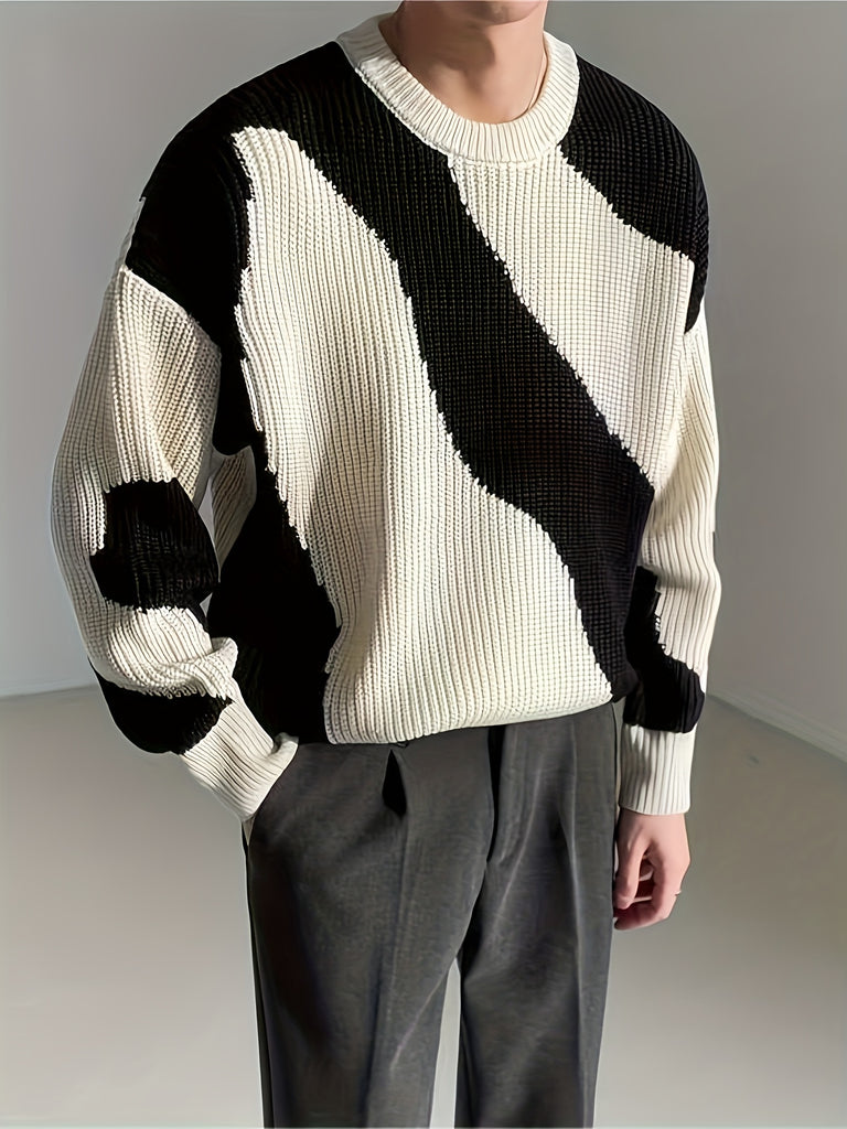 kkboxly kkboxly All Match Knitted Color Block Wave Pattern Cable Sweater, Men's Casual Warm Slightly Stretch Crew Neck Pullover Sweater For Fall Winter