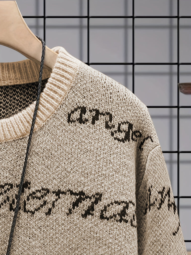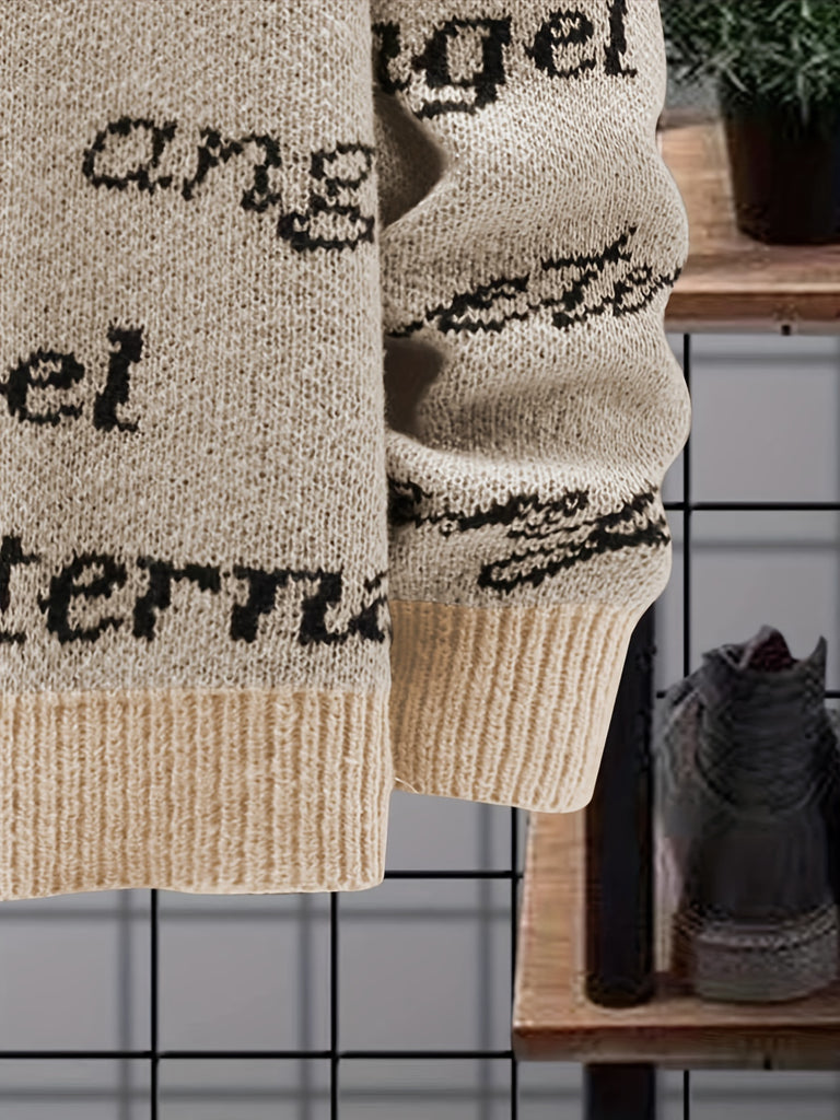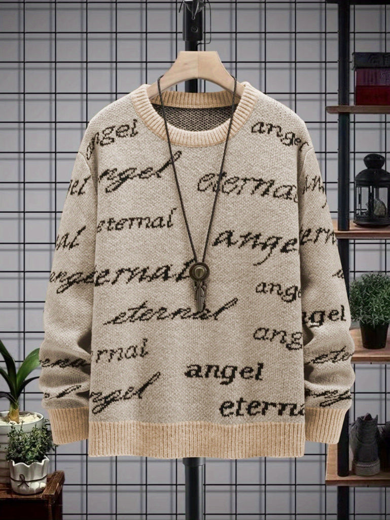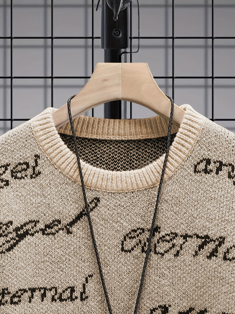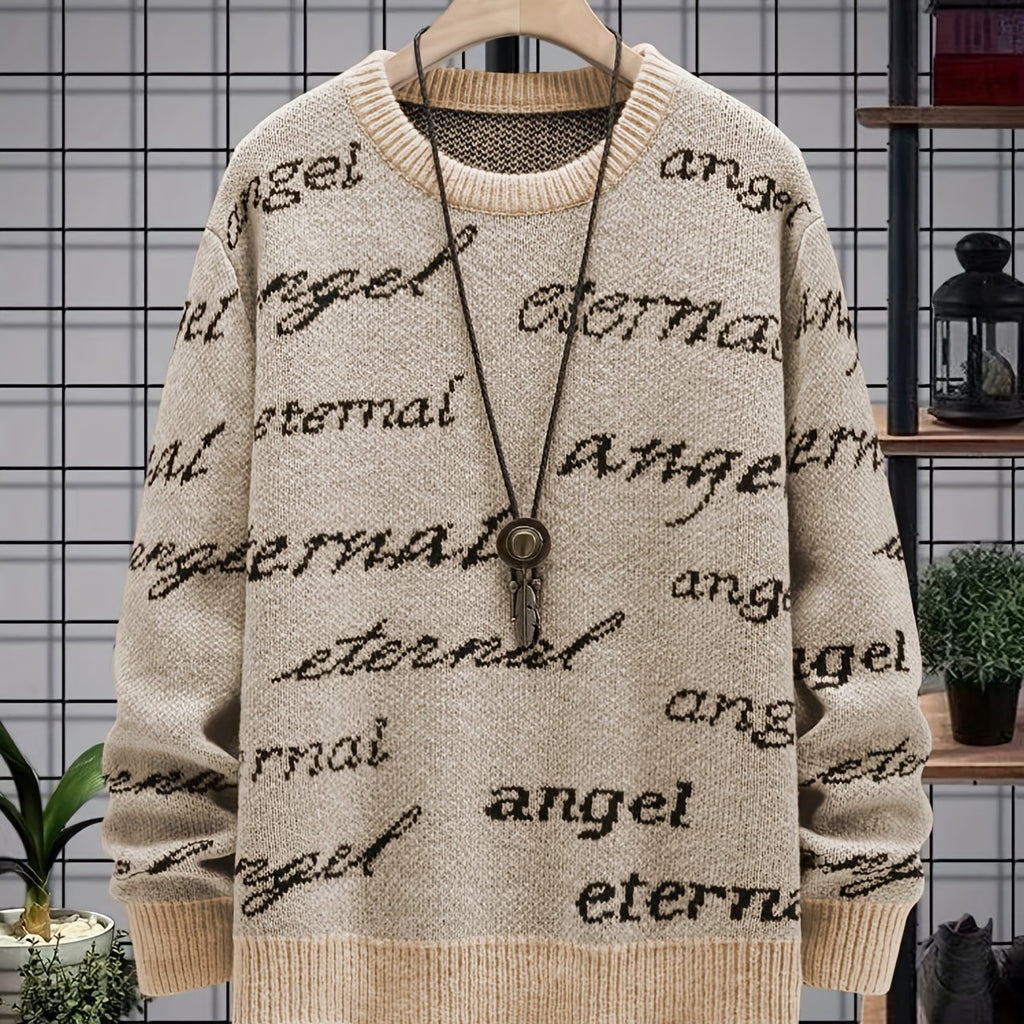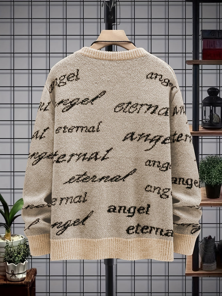 kkboxly All Match Knitted Sweater, Angel & Eternal Print Men's Casual Warm Slightly Stretch Crew Neck Pullover Sweater For Fall Winter