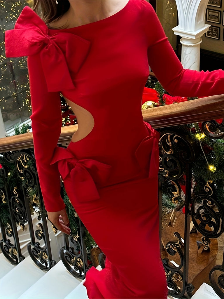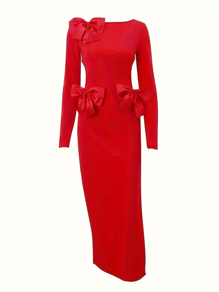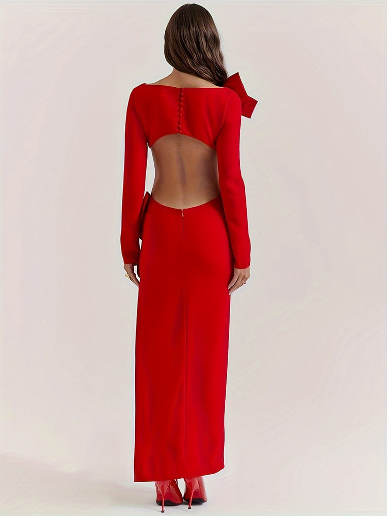 kkboxly Bow Decorate Backless Dress, Elegant Split Hem Long Sleeve Dress For Spring & Fall, Women's Clothing