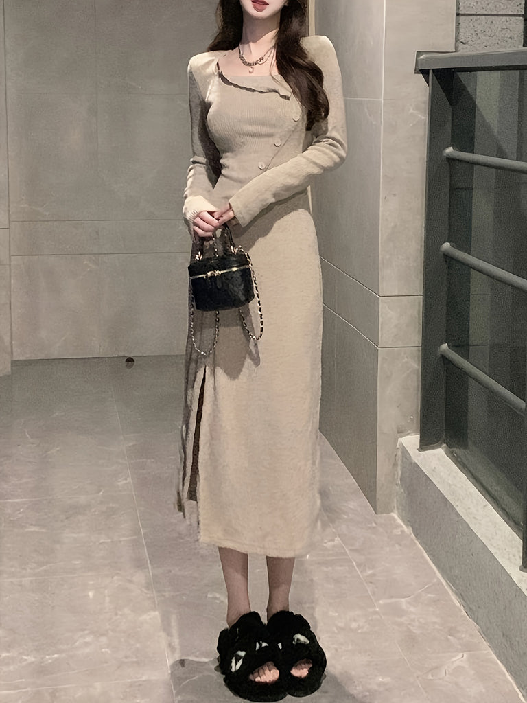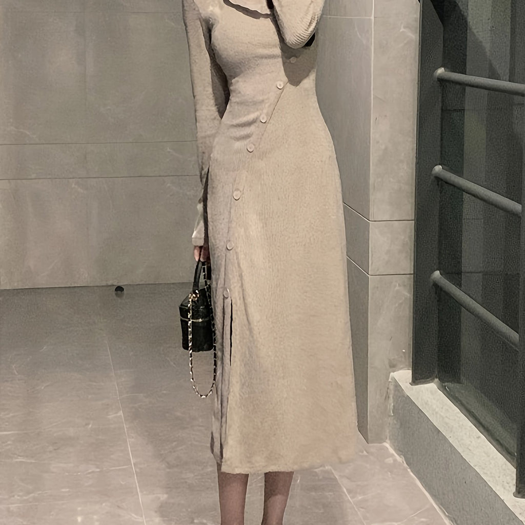 kkboxly Button Front Skew Neck Split Dress, Casual Long Sleeve Knit A-line Dress For Spring & Fall, Women's Clothing