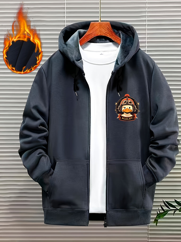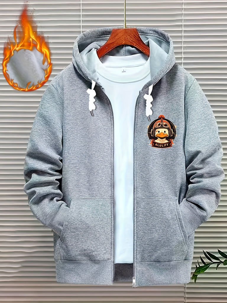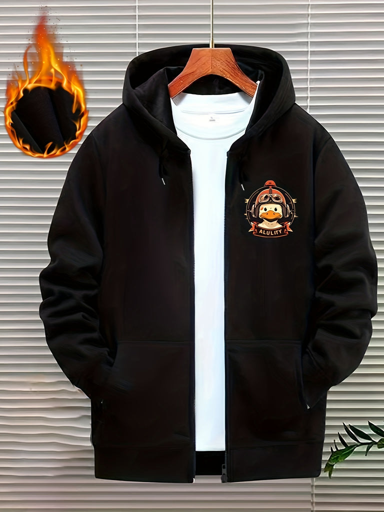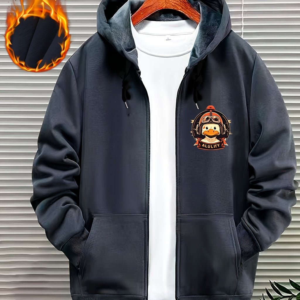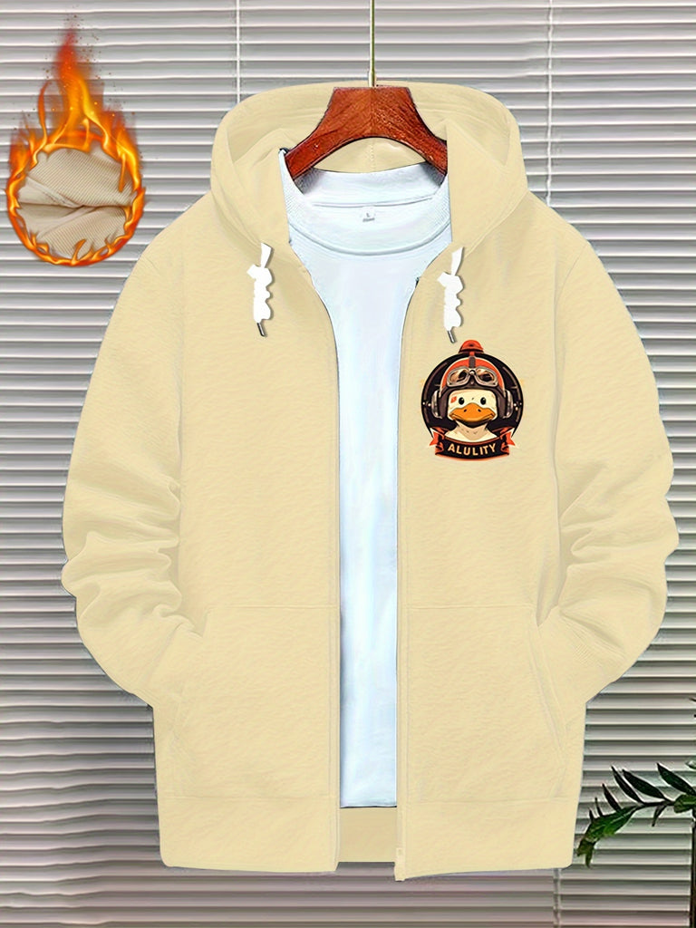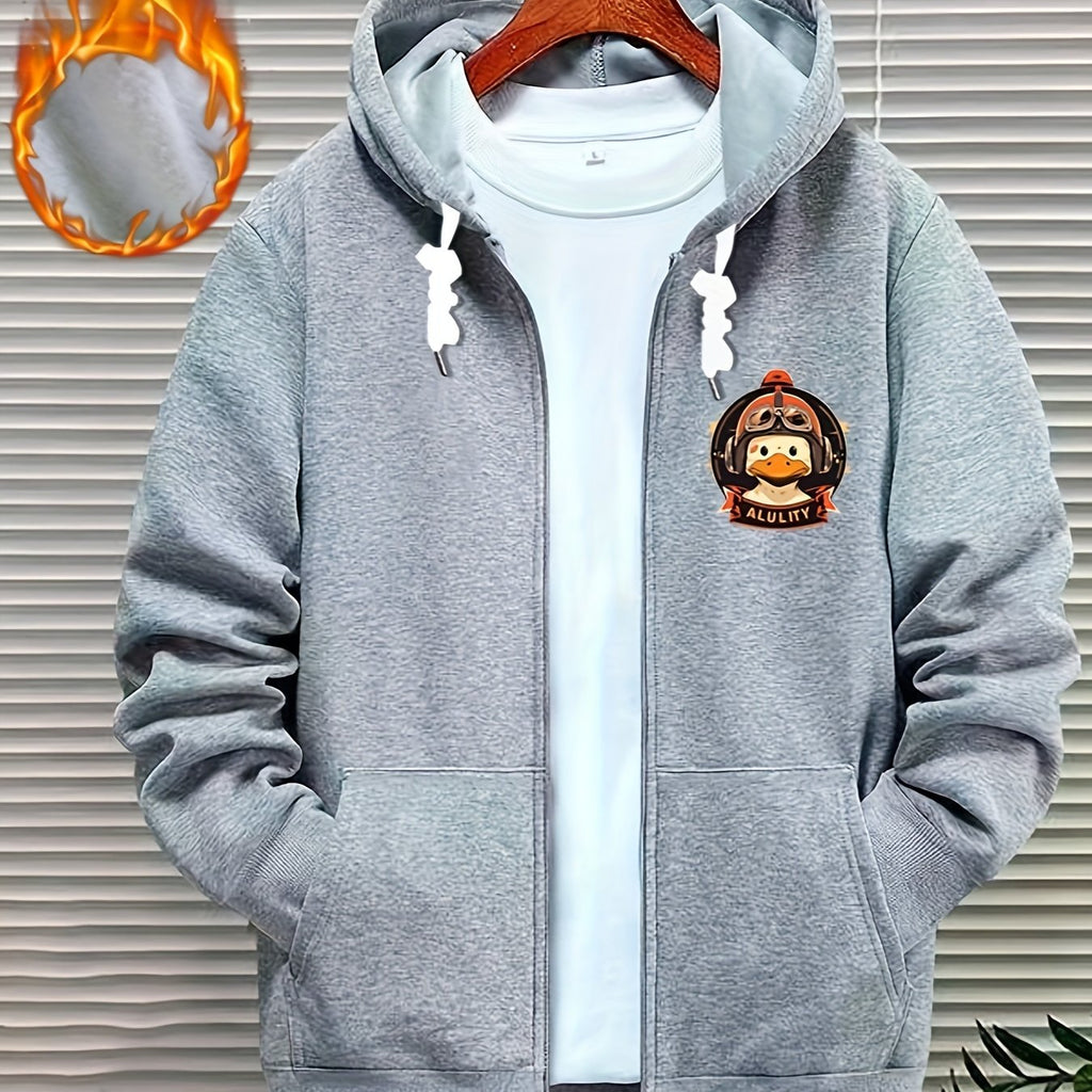 kkboxly Cartoon Duck Print Zip Up Hoodie, Men's Casual Stretch Hooded Sweatshirt Jacket, Men's Sportswear
