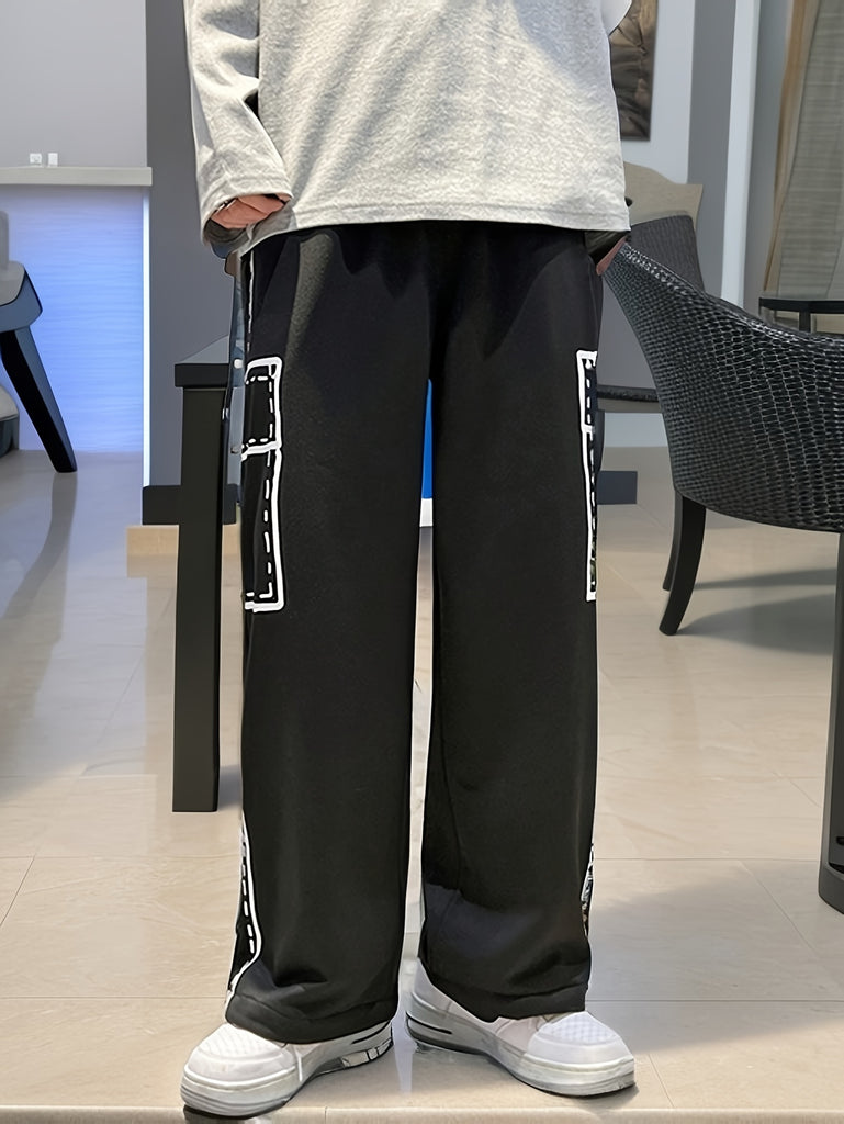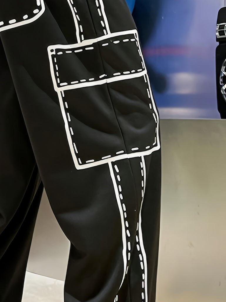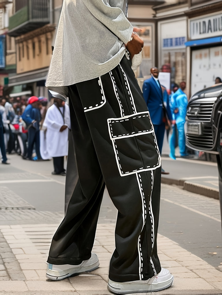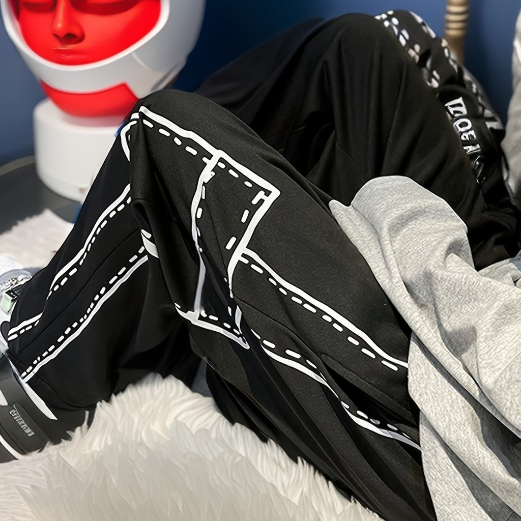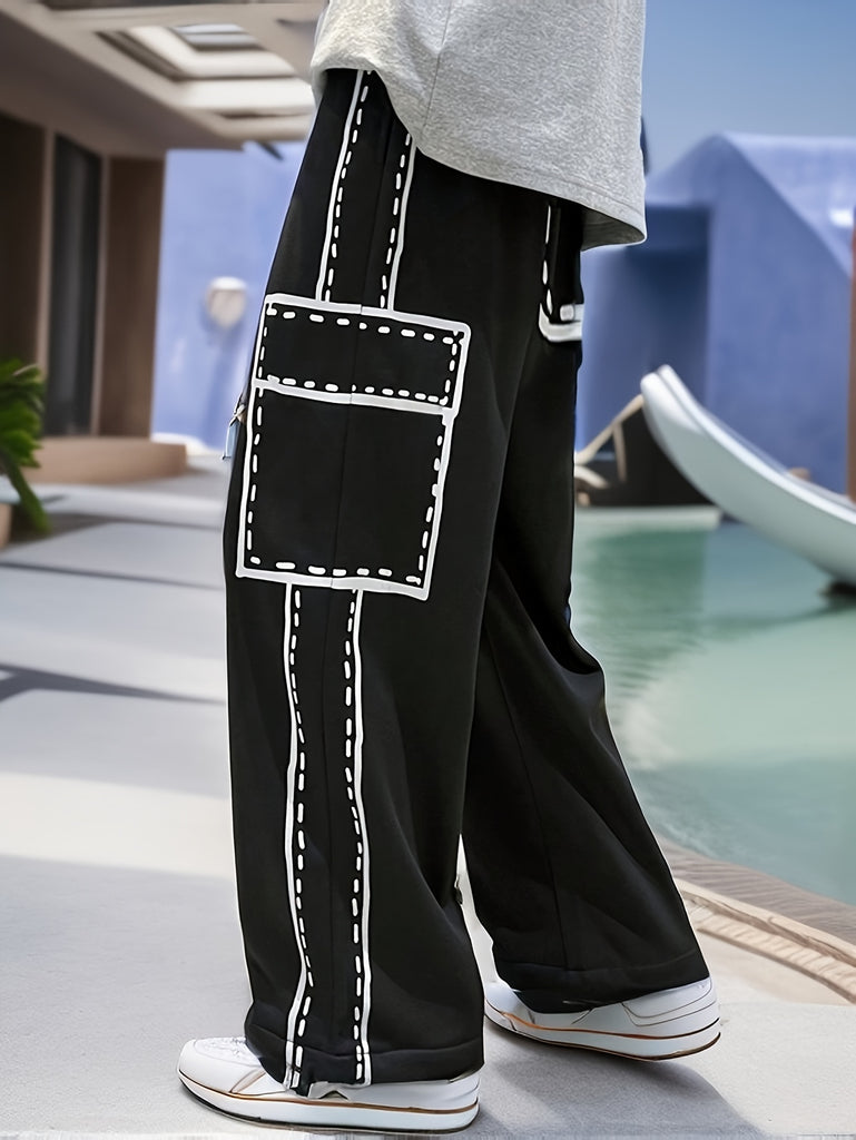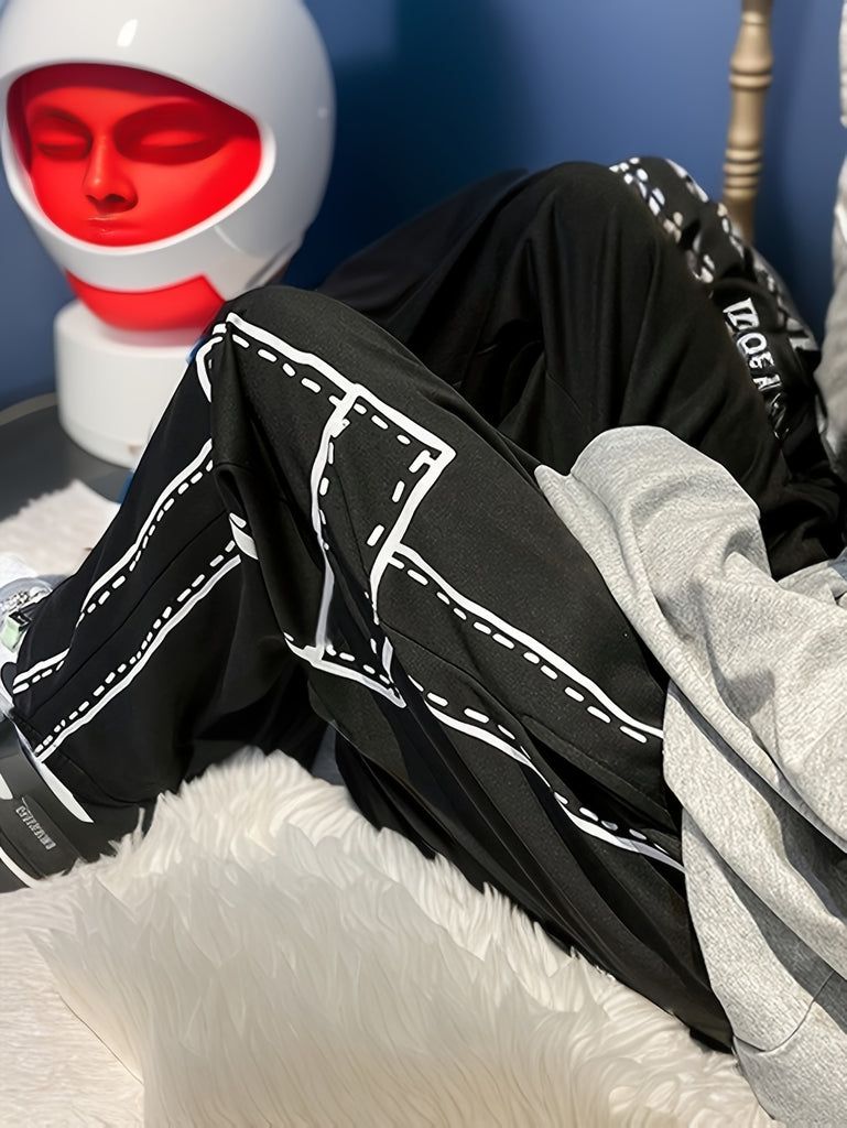 kkboxly Cartoon Lines Print Men's Fashion Long Loose Pants With Fake Pockets Design, Creative Pants For All Seasons Outdoor, As Gift