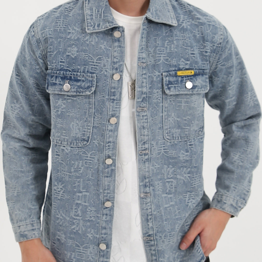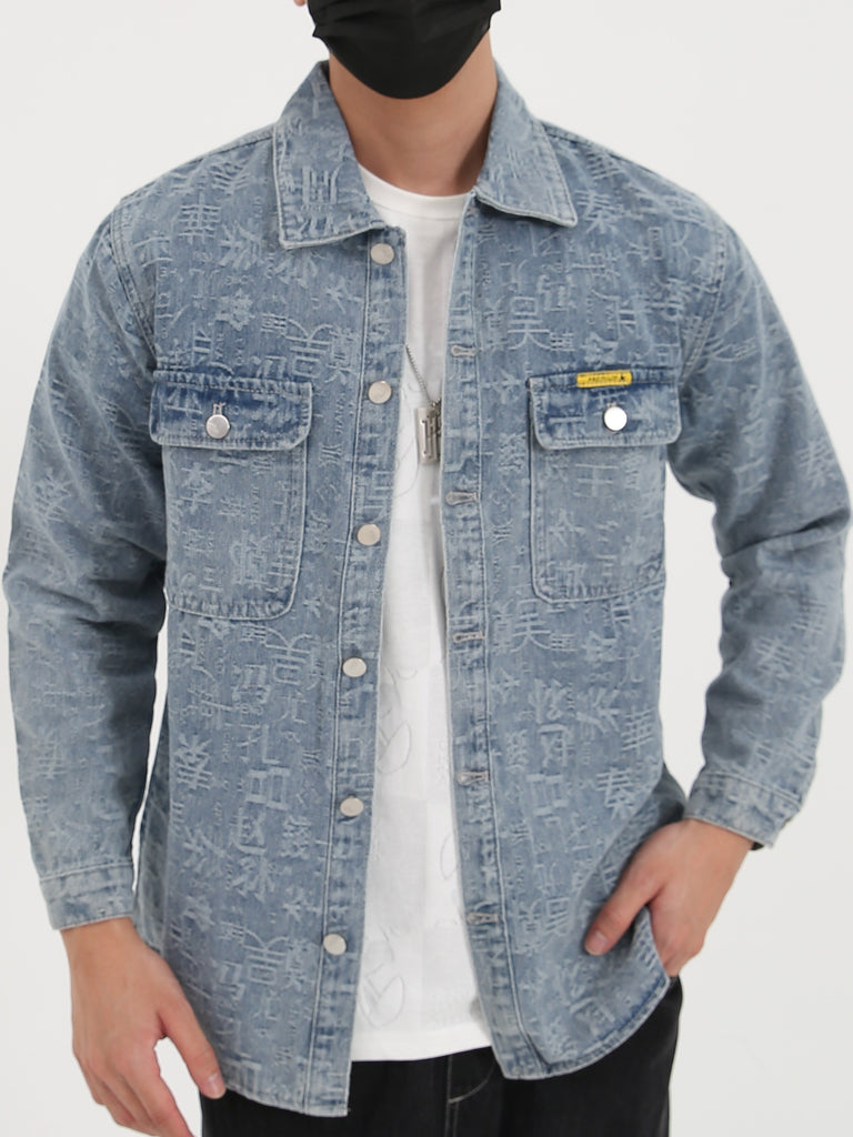 kkboxly Chinese Character Print Denim Jacket, Casual Street Style Lapel Button Up Jacket