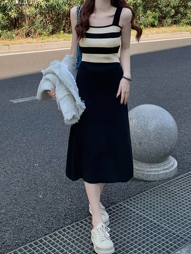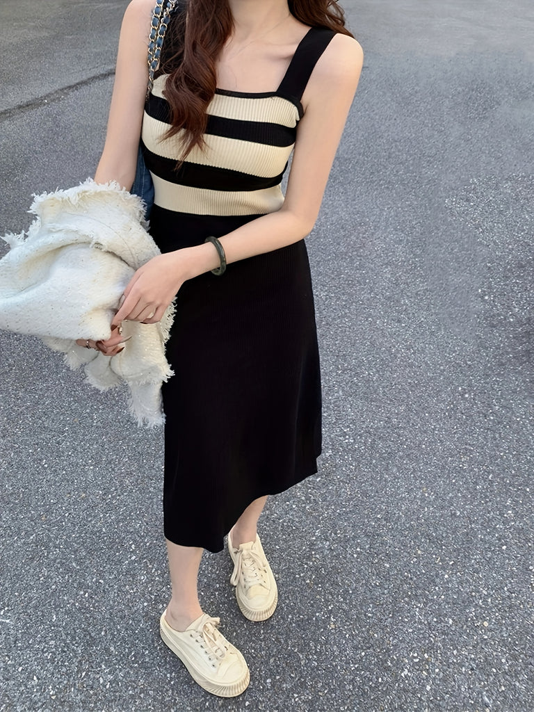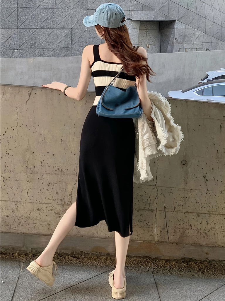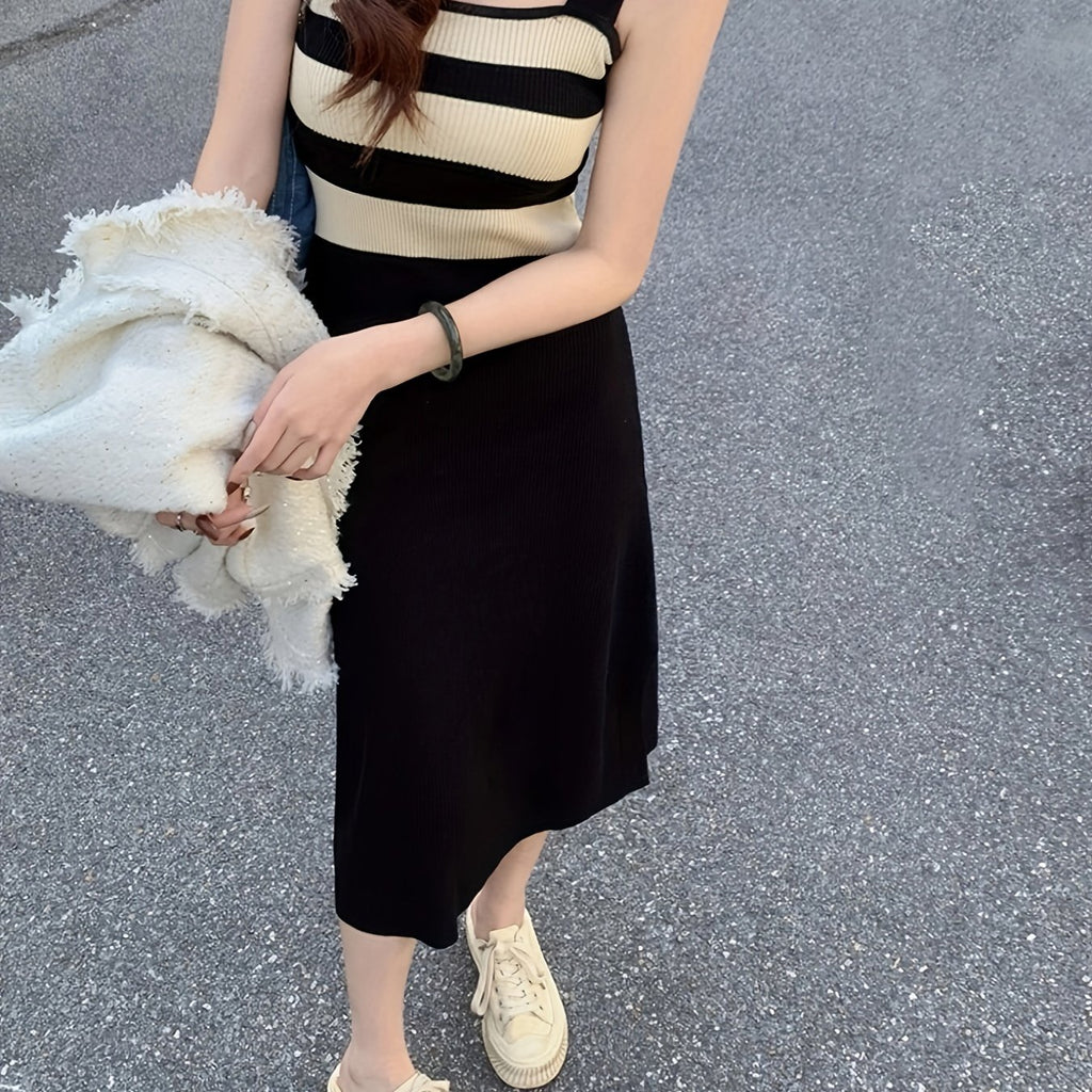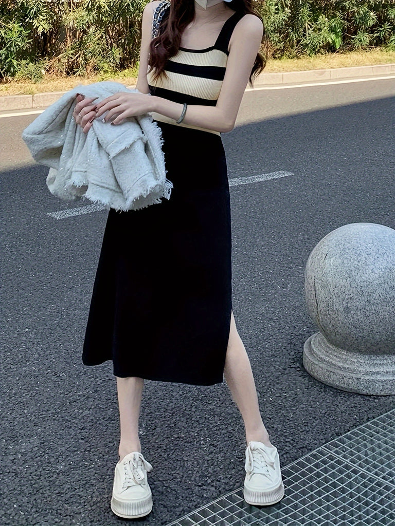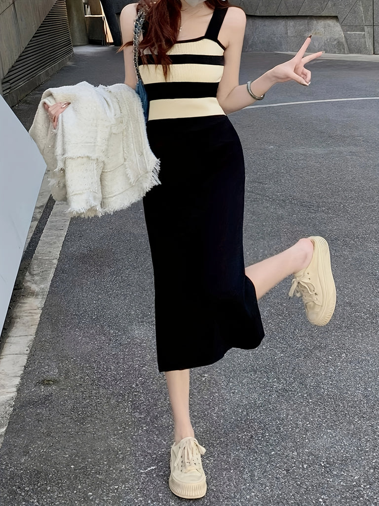 kkboxly Color Block Sleeveless Knit Dress, Chic Split Hem Slim Strap Dress, Women's Clothing