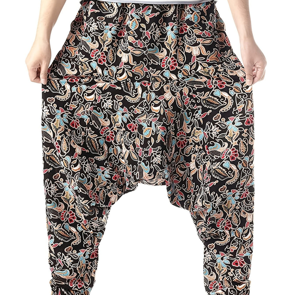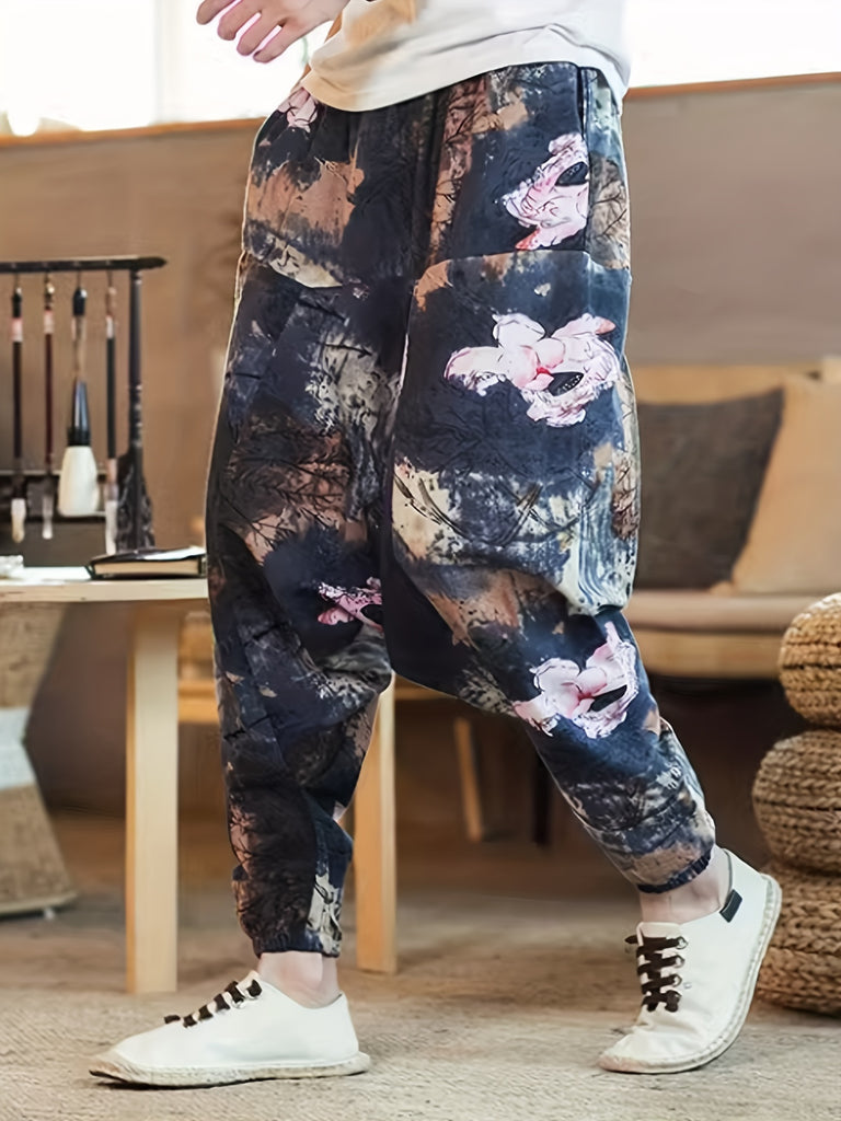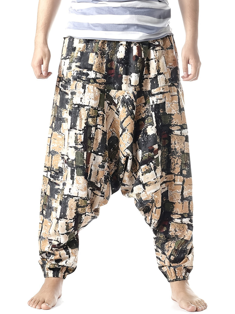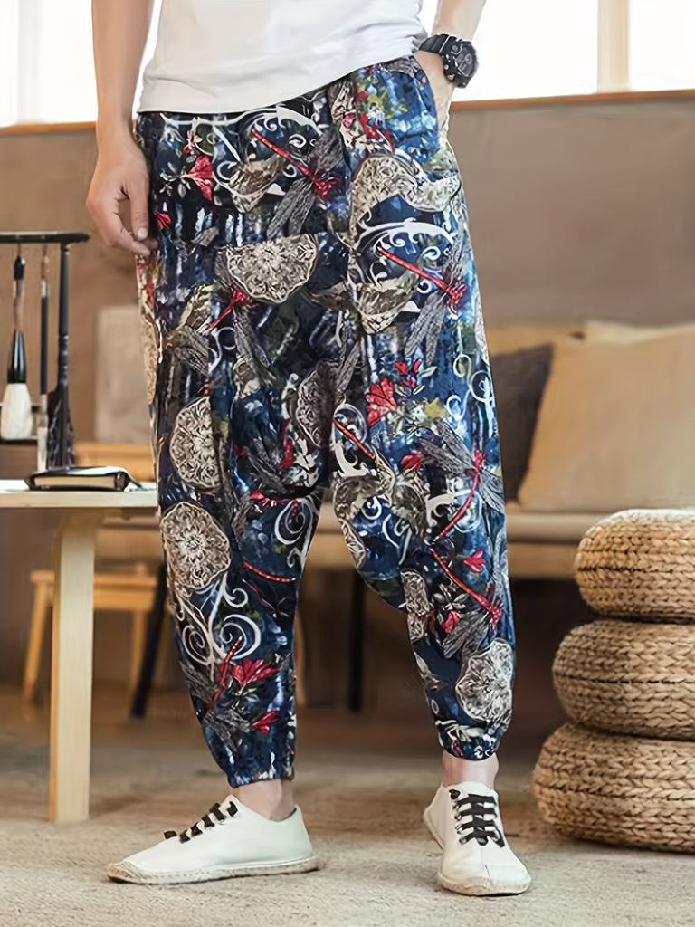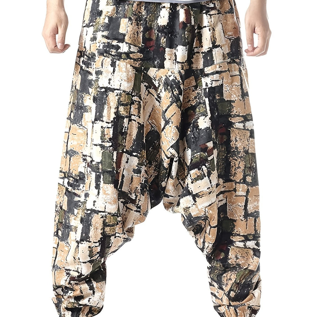 kkboxly Ethnic Pattern Vintage Cotton Harem Pants, Men's Casual Drop Crotch Jogging Harem Pants For Spring Summer