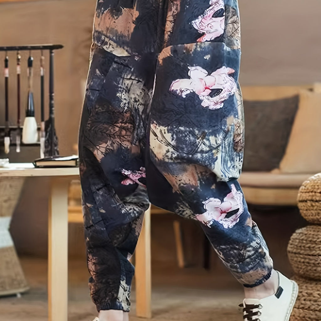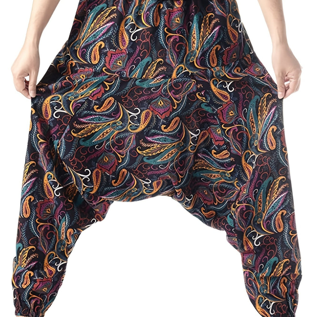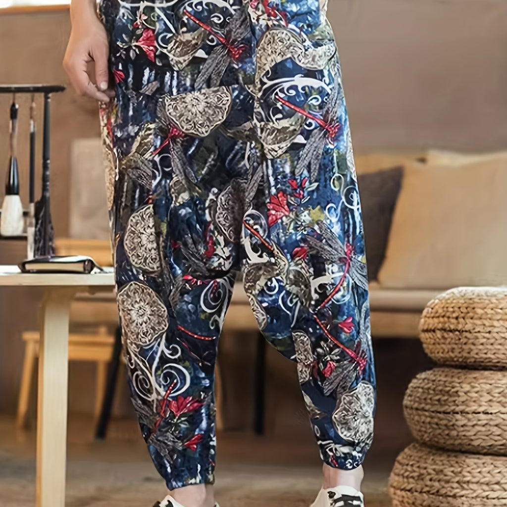 kkboxly kkboxly Ethnic Pattern Vintage Cotton Harem Pants, Men's Casual Drop Crotch Jogging Harem Pants For Spring Summer