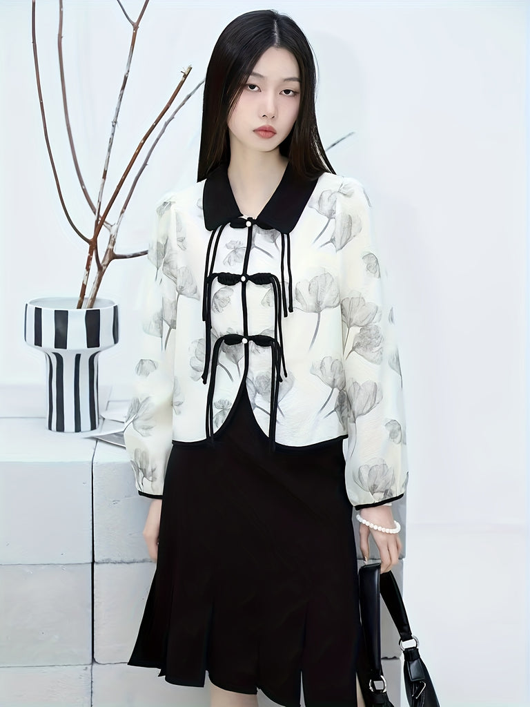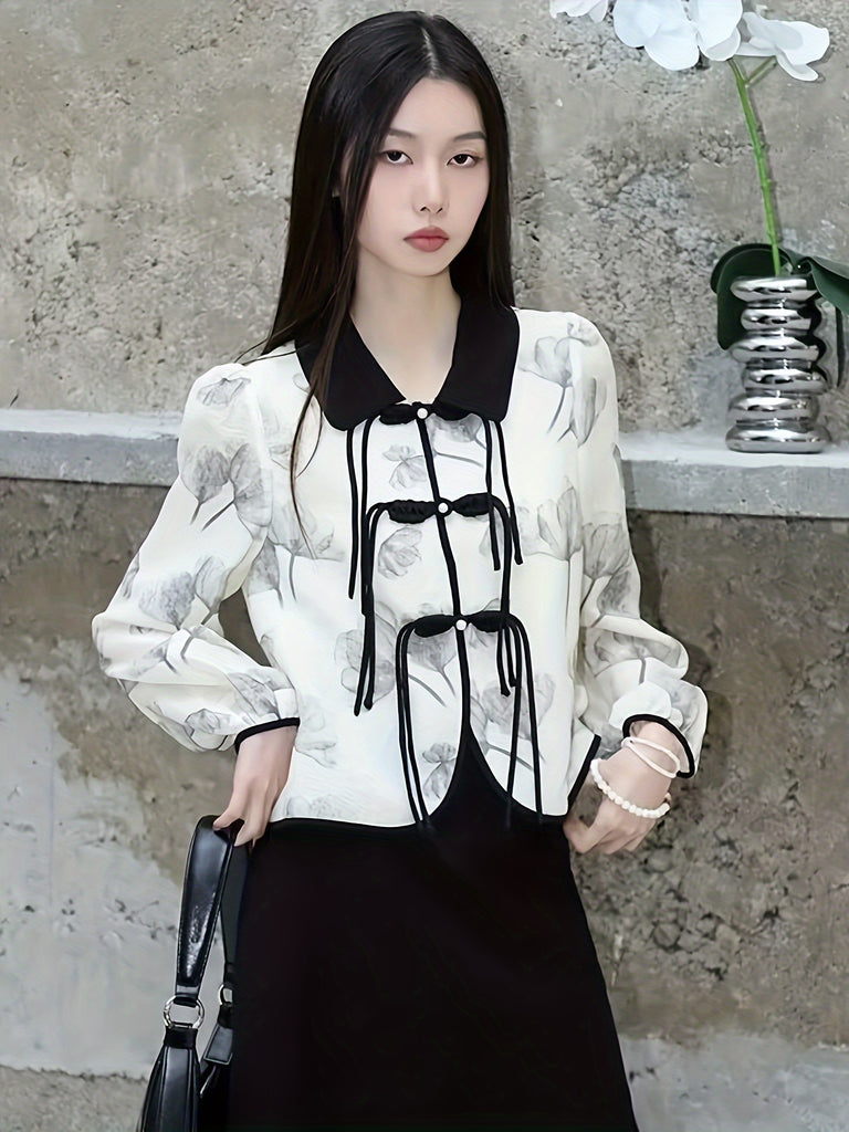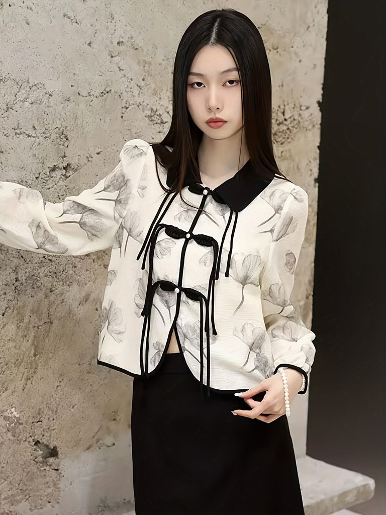 kkboxly Fringe Button Front Floral Print Top, Stylish Chinese Vintage Long Sleeve Lapel Top For Spring & Fall, Women's Clothing
