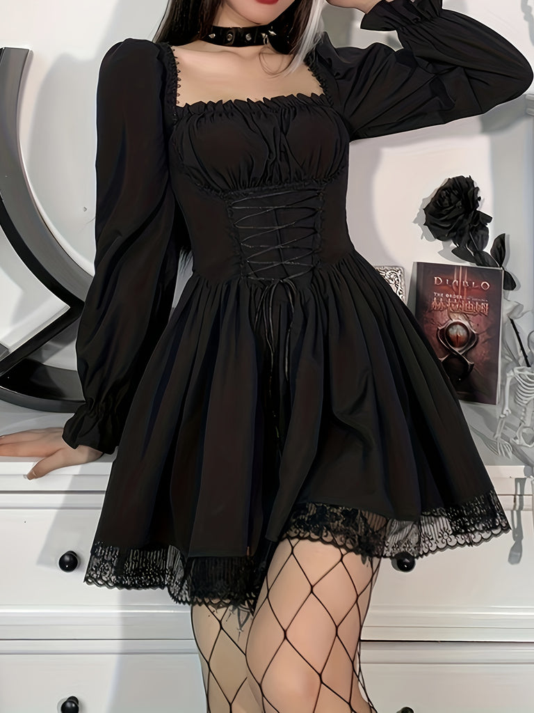 kkboxly Lace Up Square Neck Flared Dress, Gothic Lolita Ruffle Trim Lantern Dress, Women's Clothing