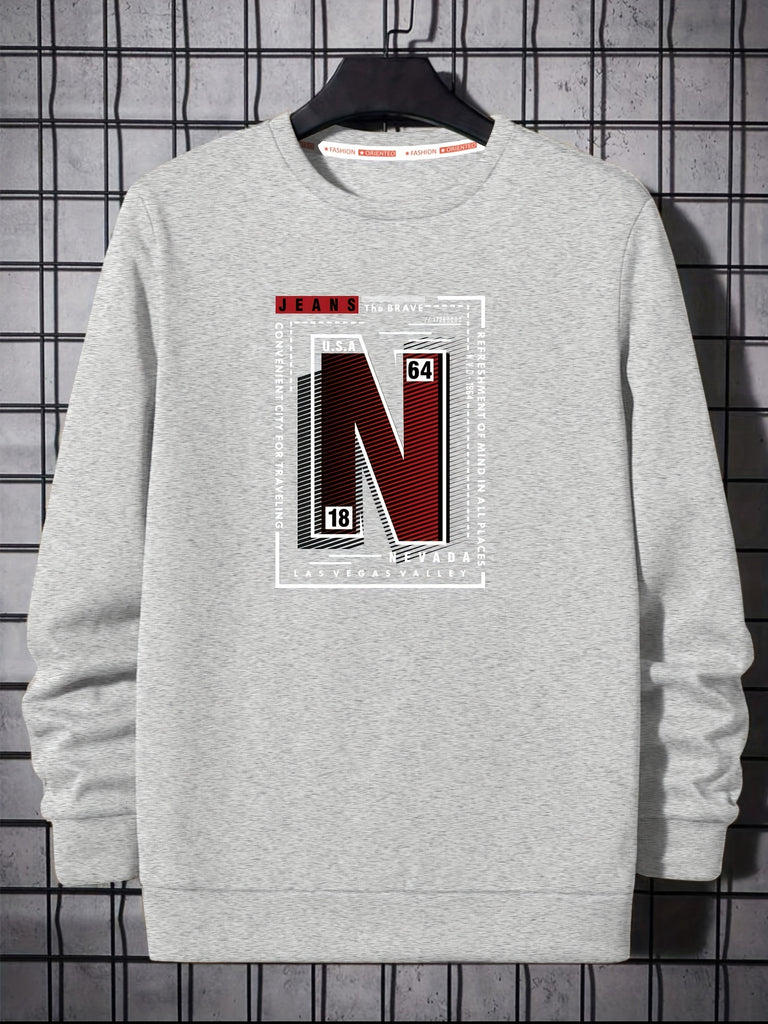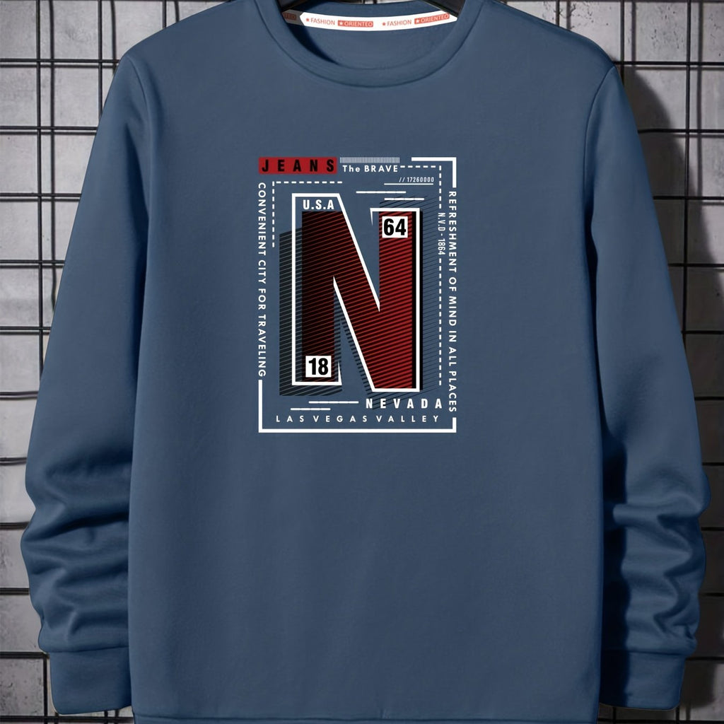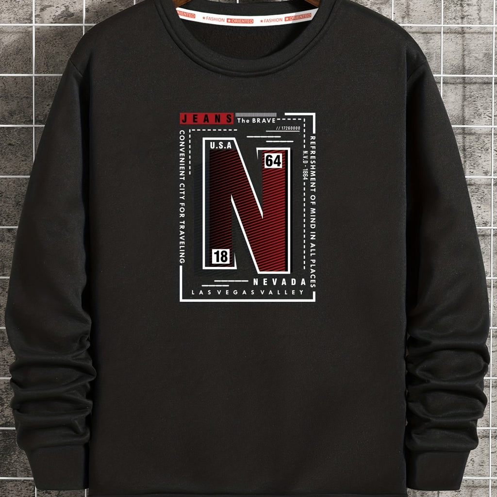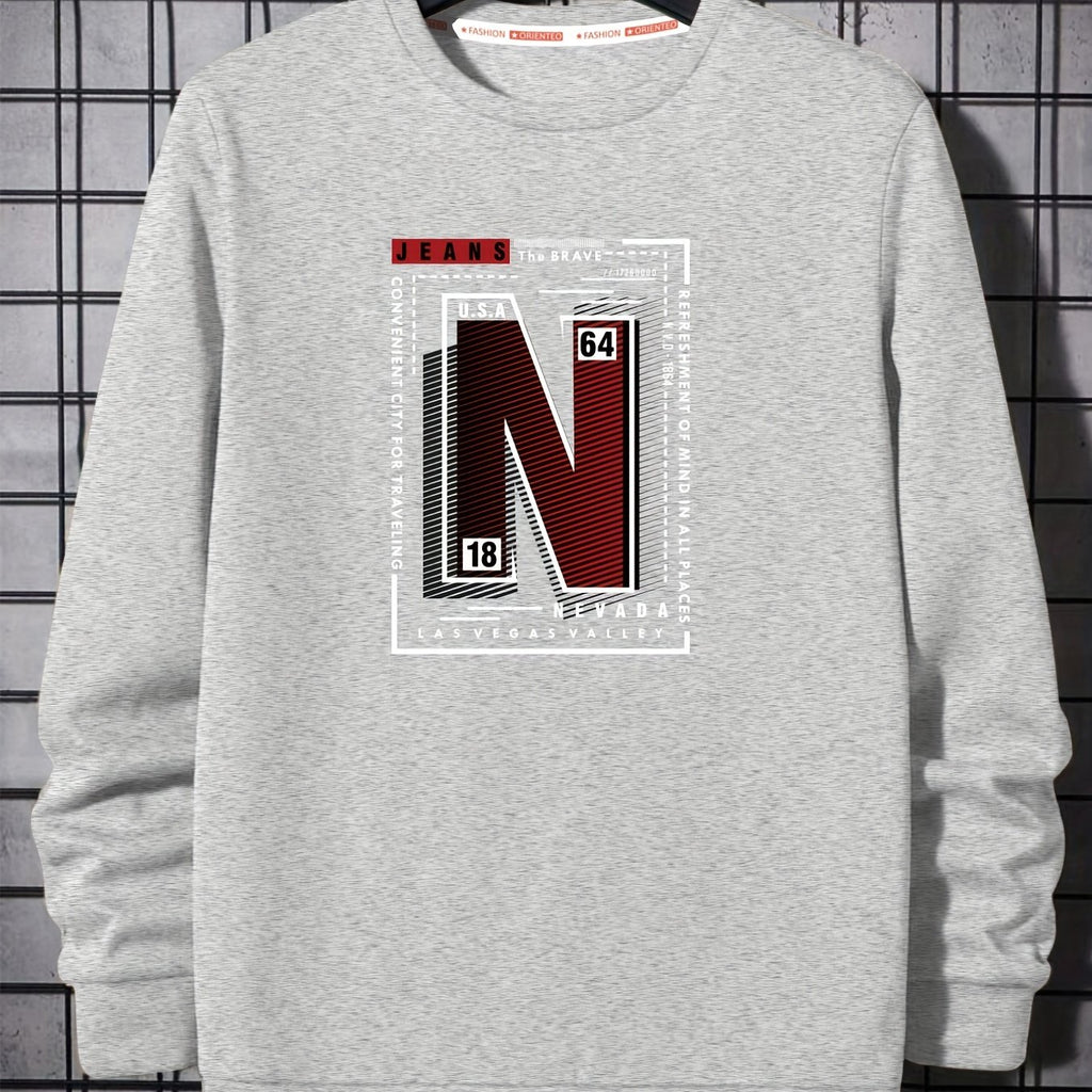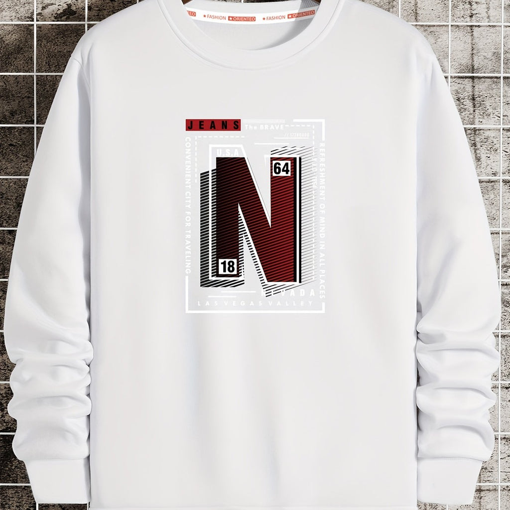 kkboxly Letter N Graphic Print Men's Casual Creative Pullover Sweatshirt, Long Sleeve Crew Neck Tops, Men's Clothes Outdoor