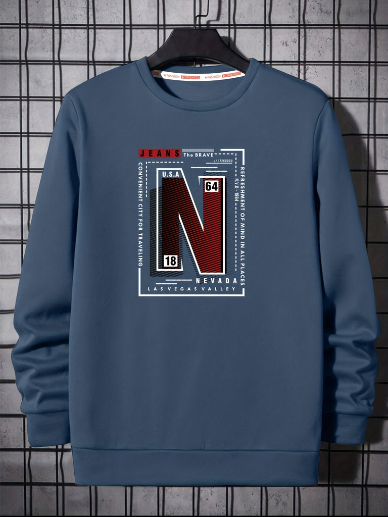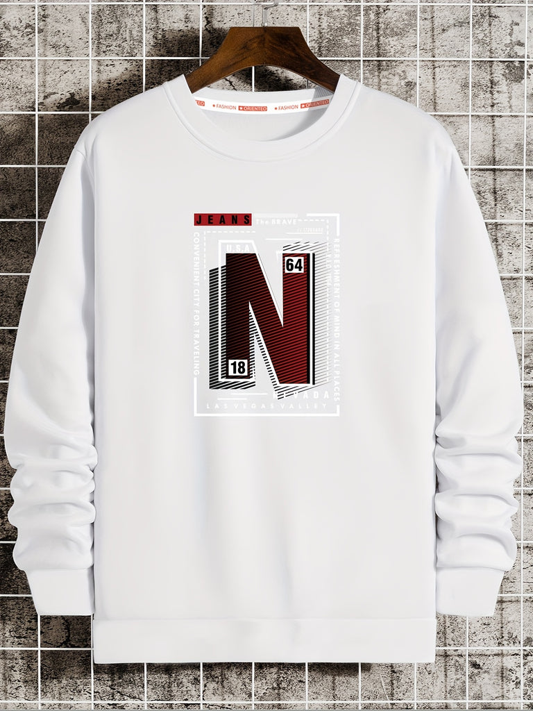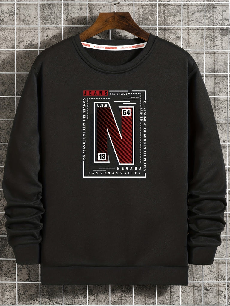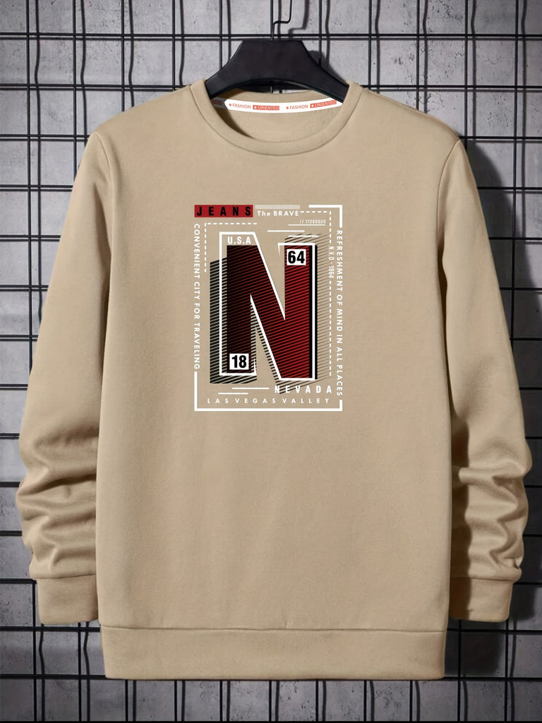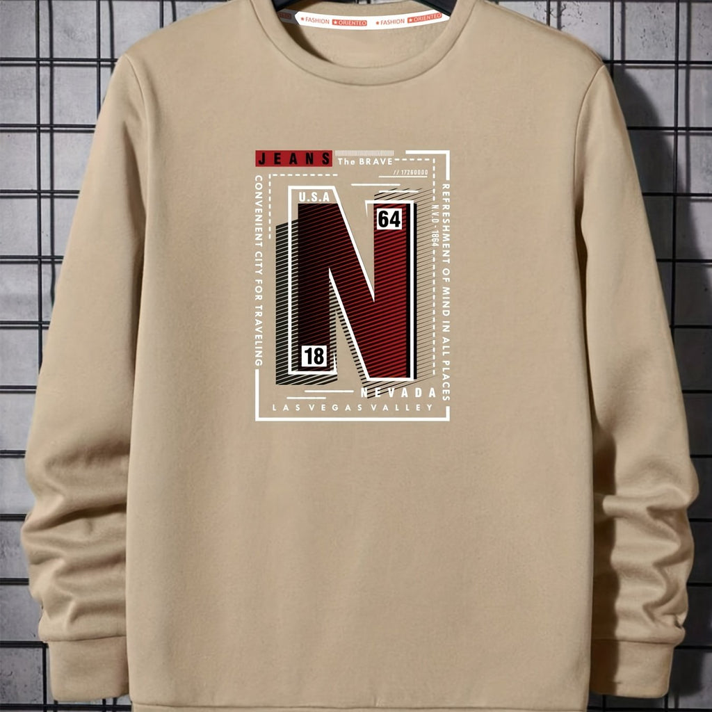 kkboxly Letter N Graphic Print Men's Casual Creative Pullover Sweatshirt, Long Sleeve Crew Neck Tops, Men's Clothes Outdoor