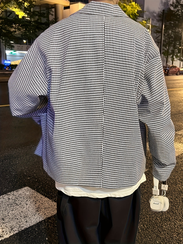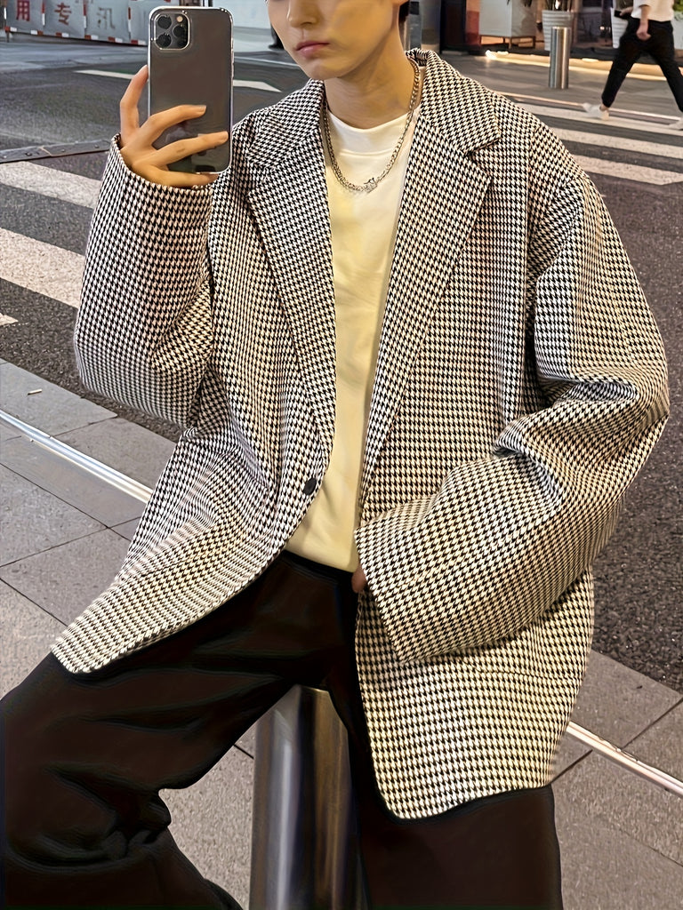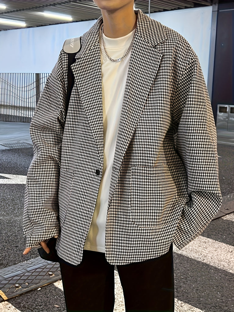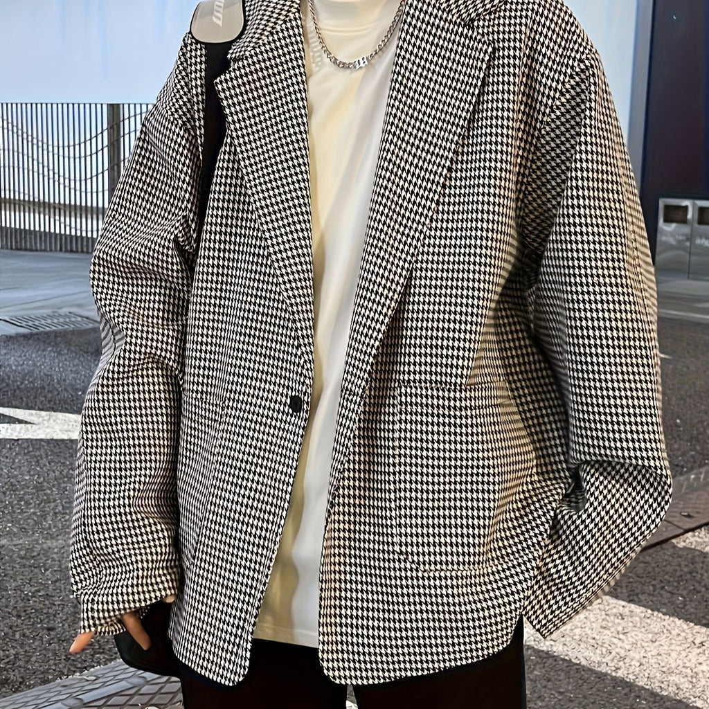 kkboxly Men's Chic Houndstooth Print Blazer, Men's Casual Shawl Collar Suit Jacket For Business Banquet Party Dinner