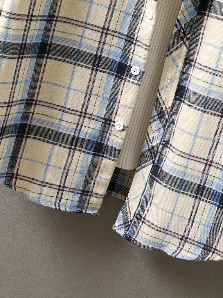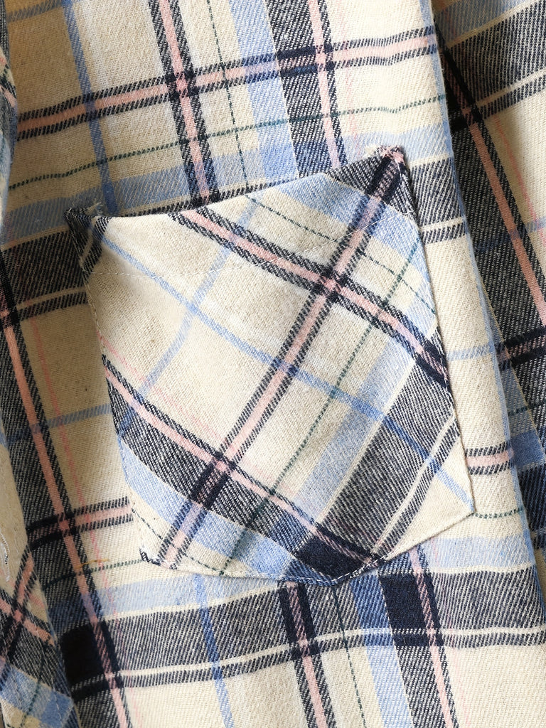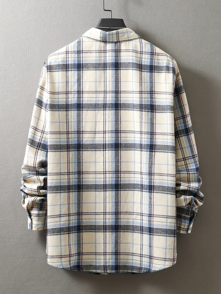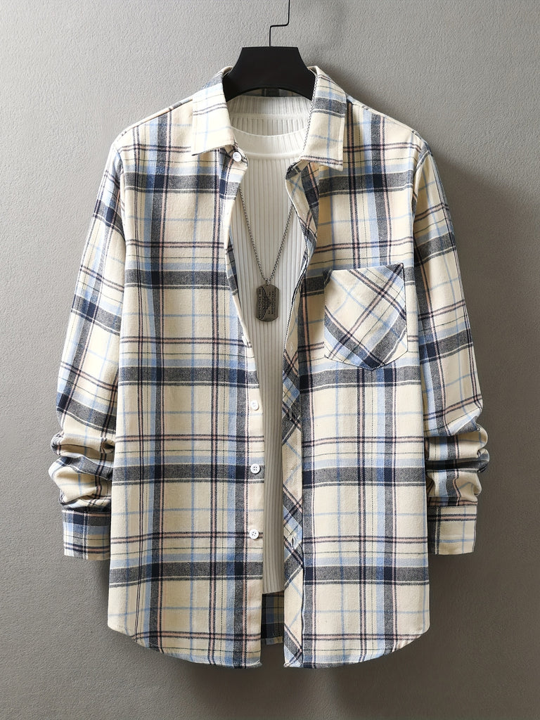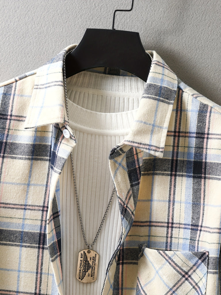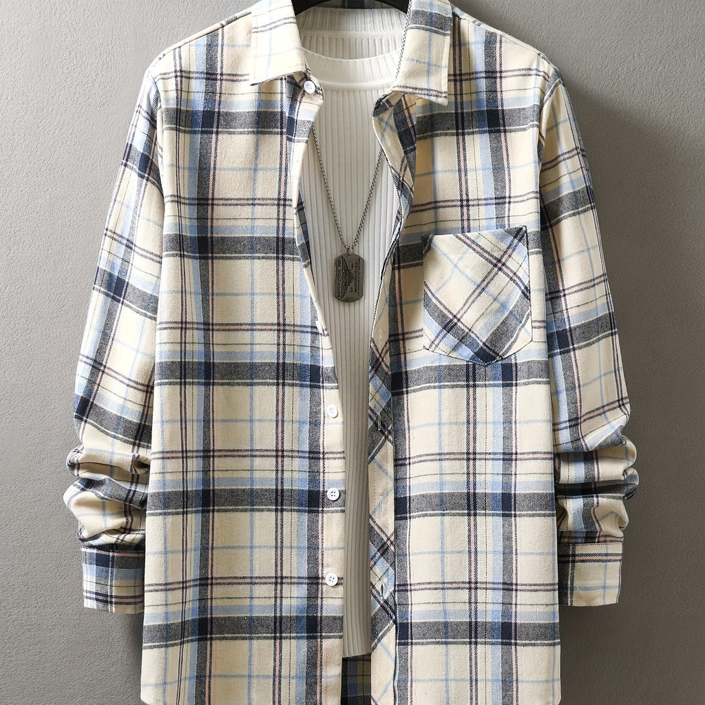 kkboxly Men's Plaid Turndown Collar Chest Collar Long Sleeve Shirt, Trendy Comfy Shirt For Spring Autumn