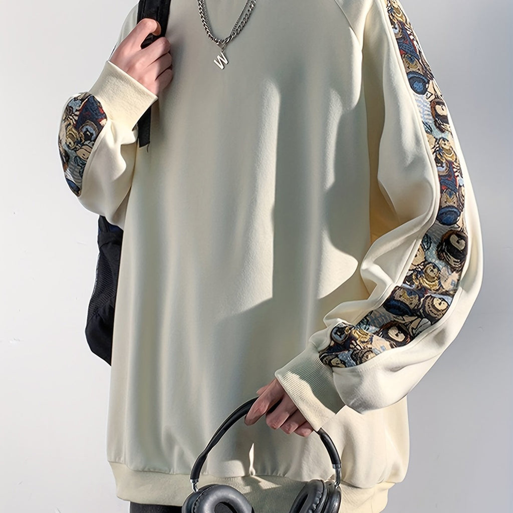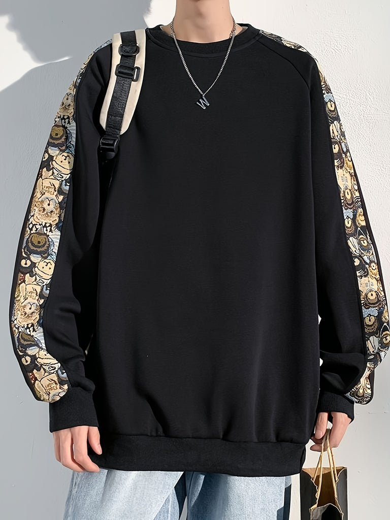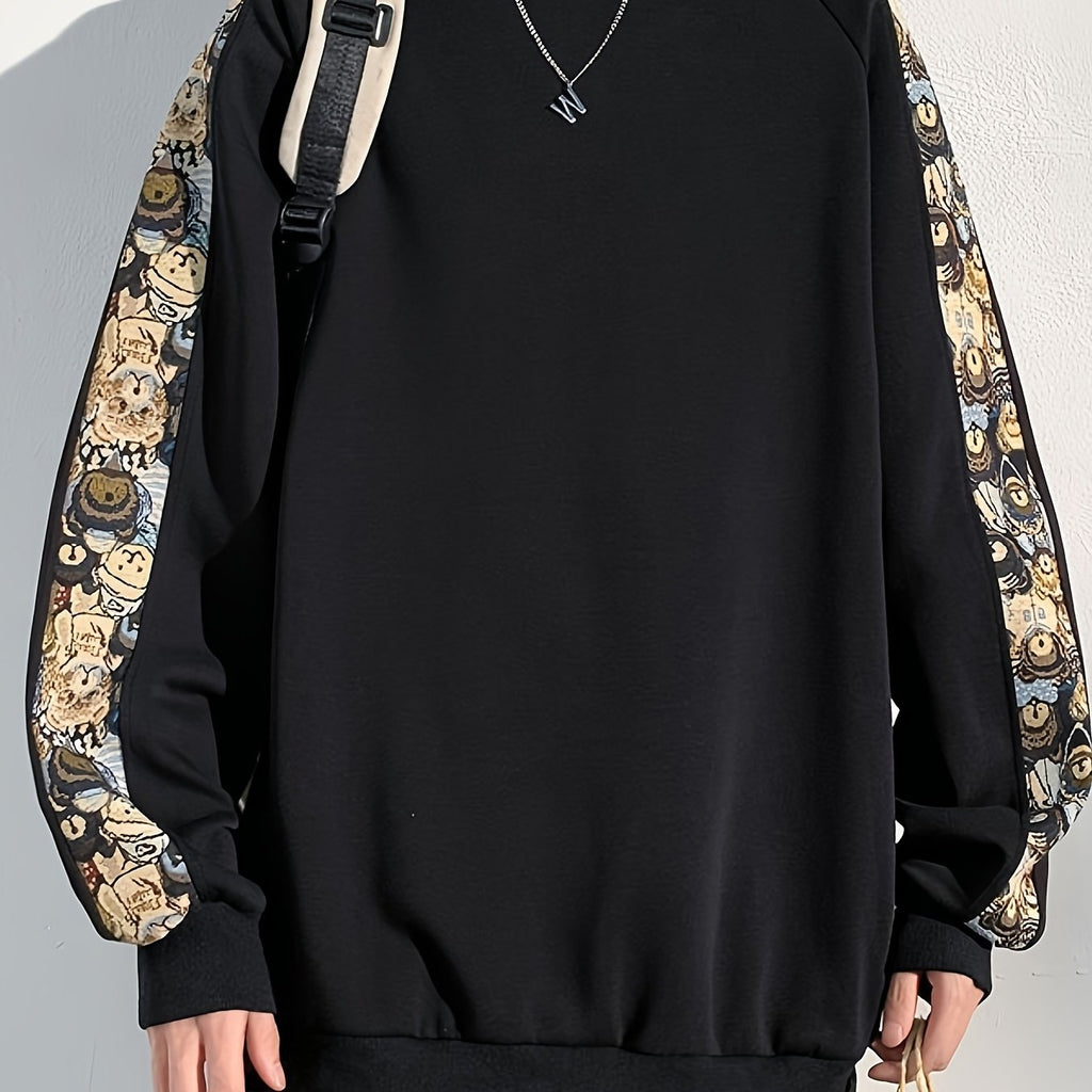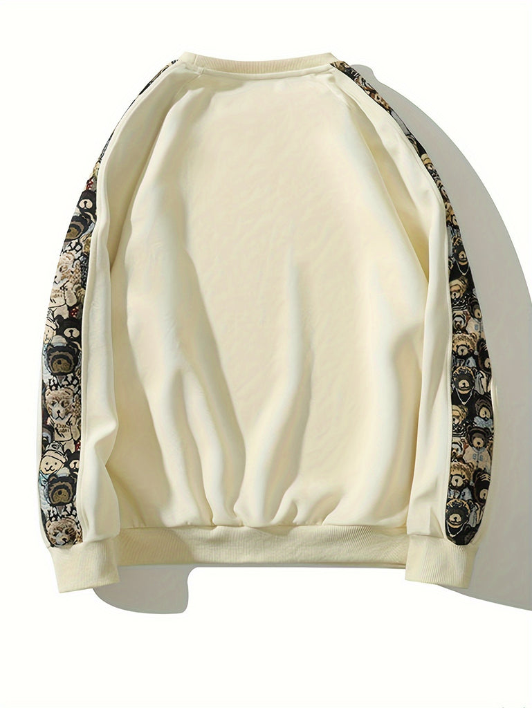 kkboxly Men's Stylish Loose Bear Pattern Comfy Sweatshirt, Casual Slightly Stretch Breathable Long Sleeve Crew Neck Top For City Walk Street Hanging Outdoor Activities