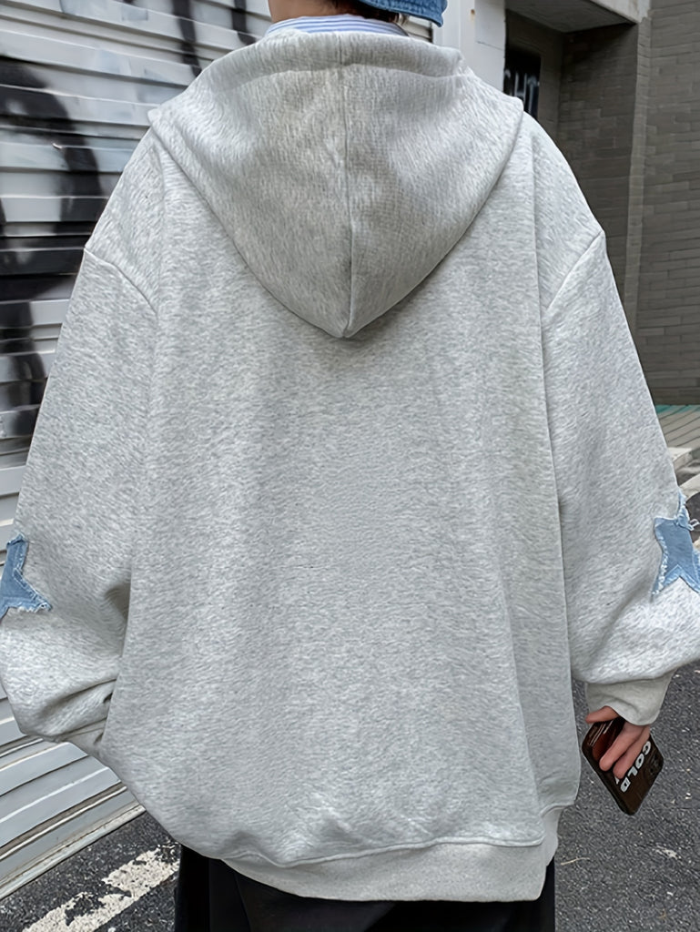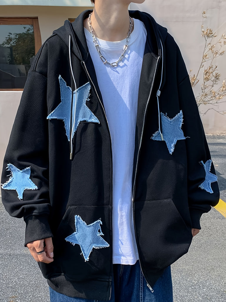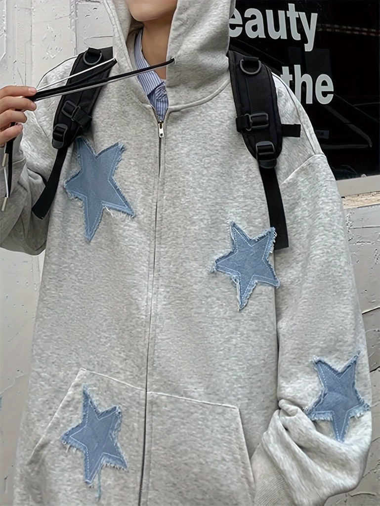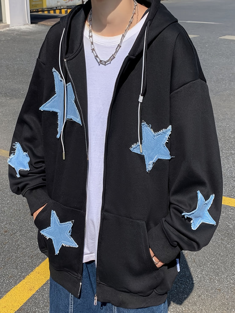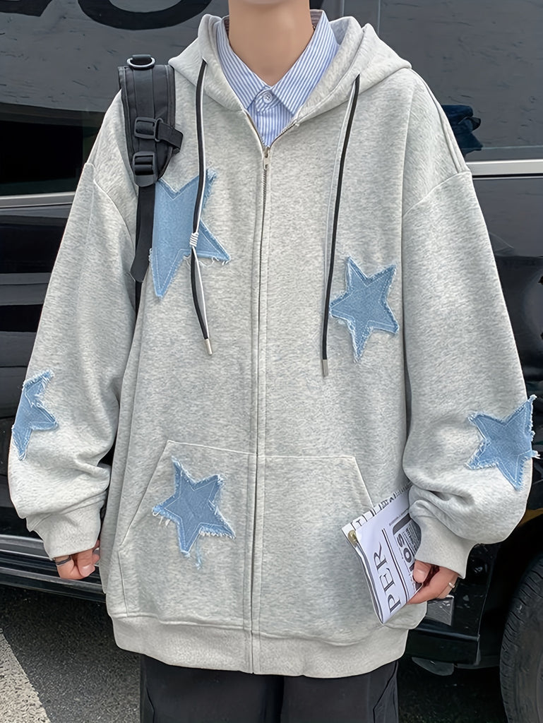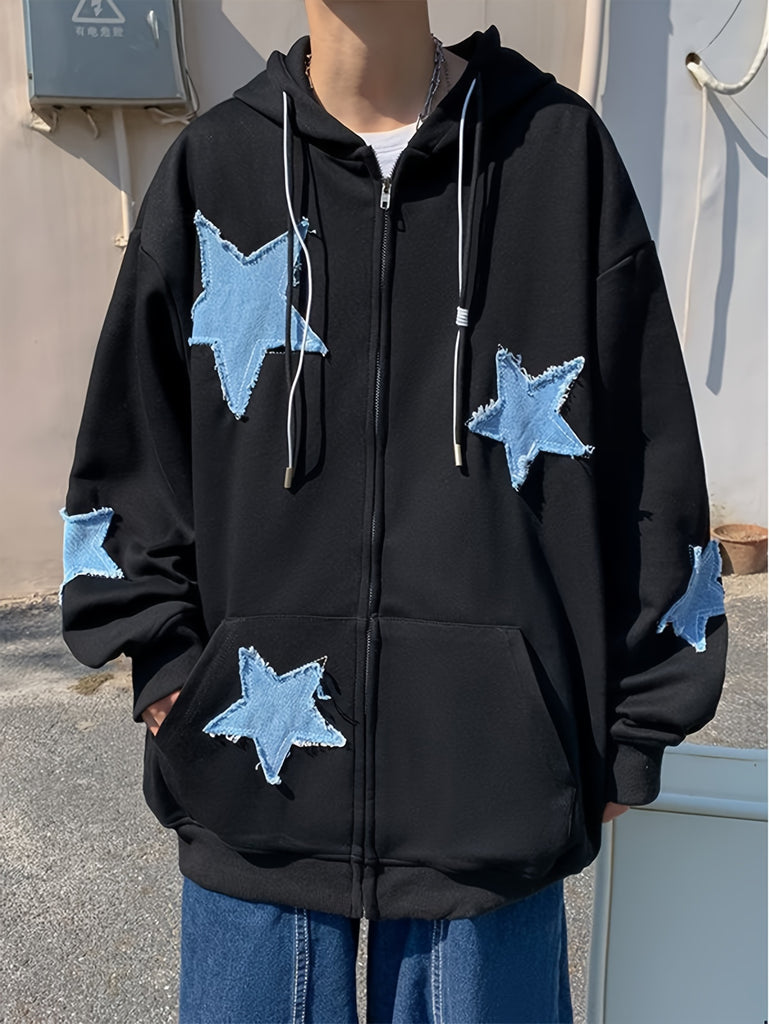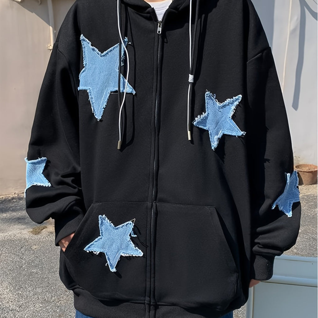 kkboxly Men's Stylish Loose Stars Pattern Hoodie With Pockets, Casual Mid Stretch Breathable Zip Up Long Sleeve Hooded Sweatshirt For City Walk Street Hanging Outdoor Activities