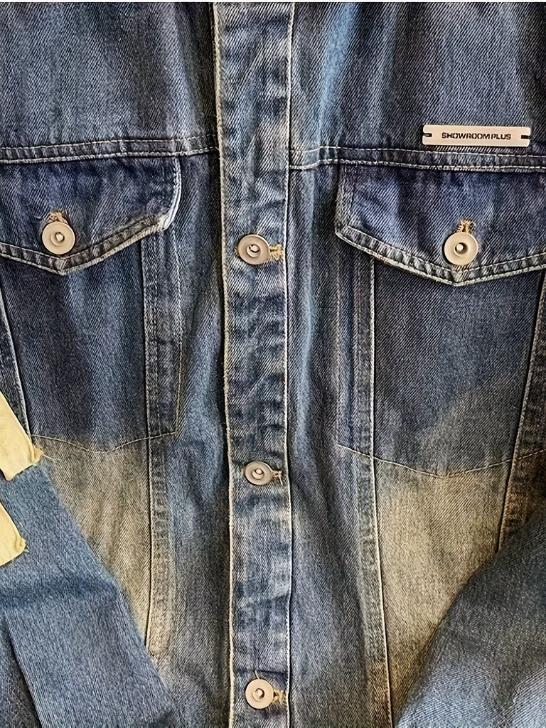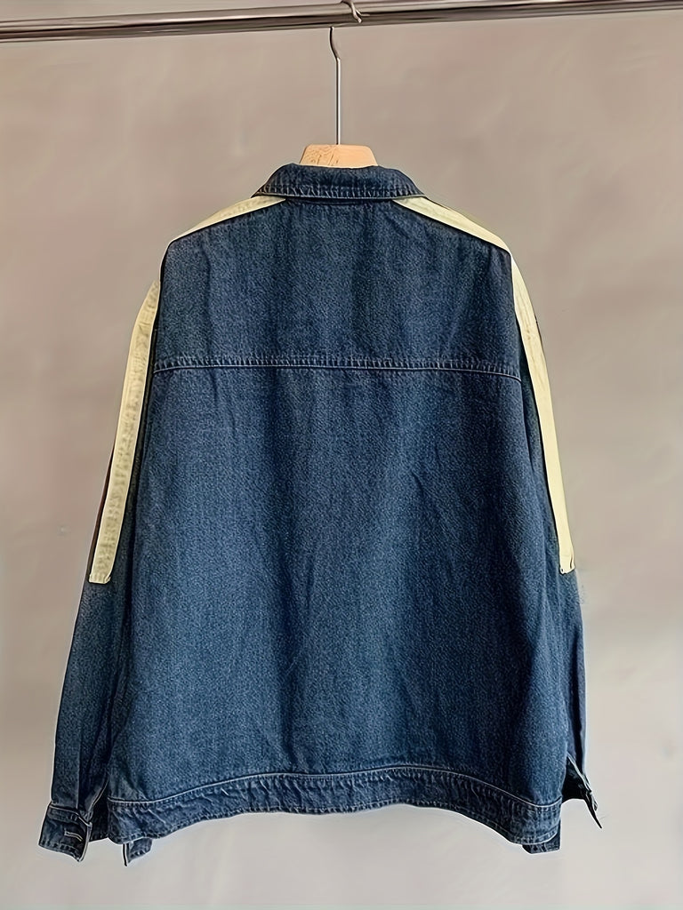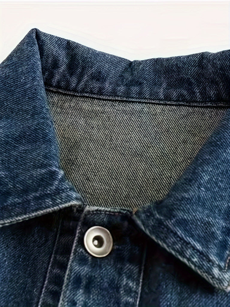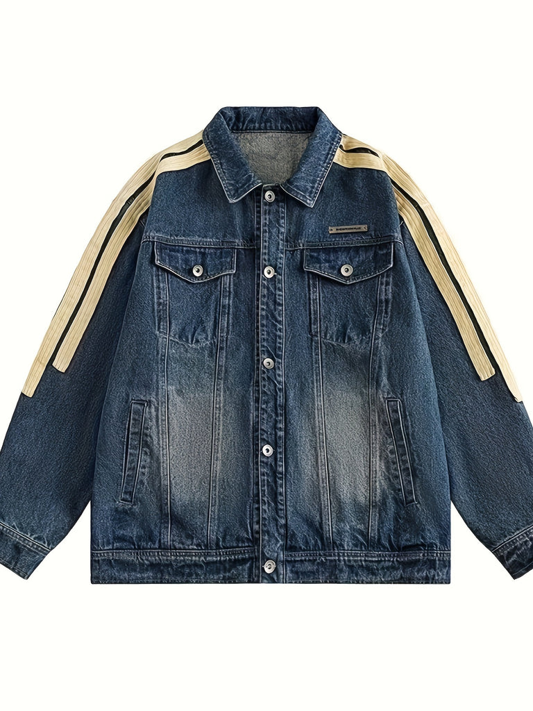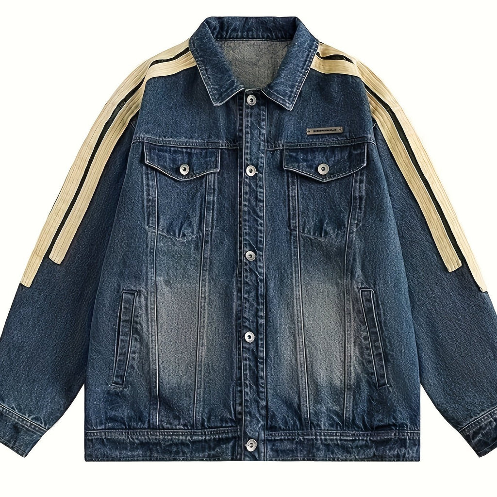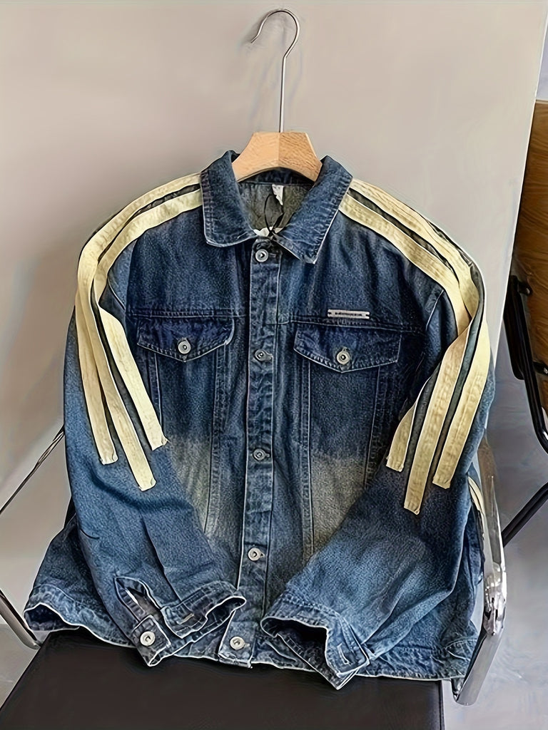 kkboxly Men's Stylish Stripe Pattern Comfy Denim Jacket With Pockets, Casual Breathable Lapel Button Up Long Sleeve Top For City Walk Street Hanging Outdoor Activities