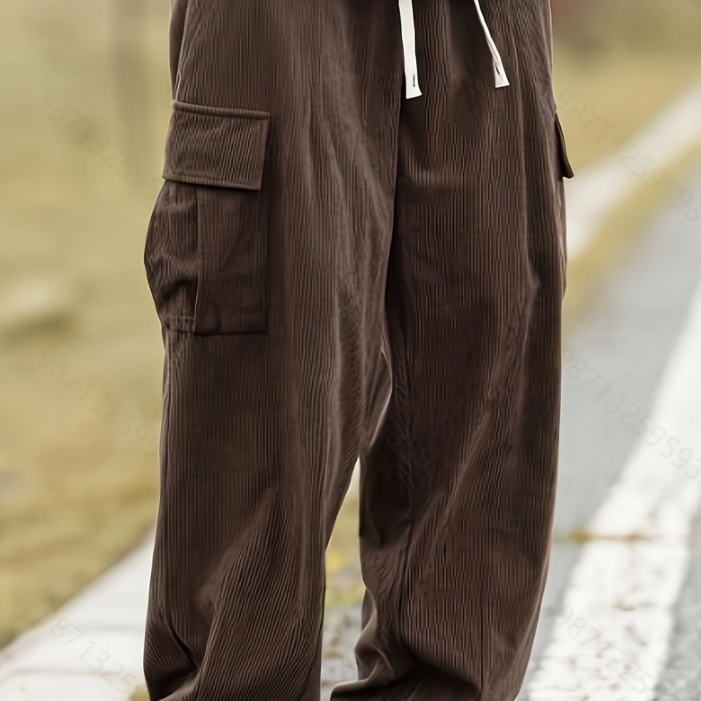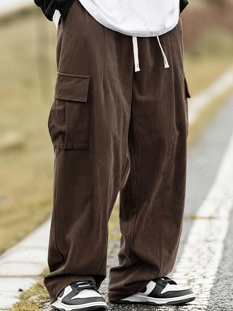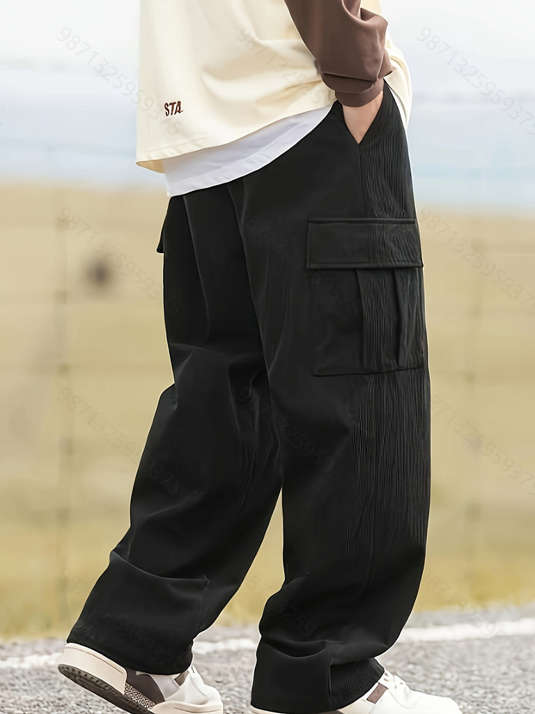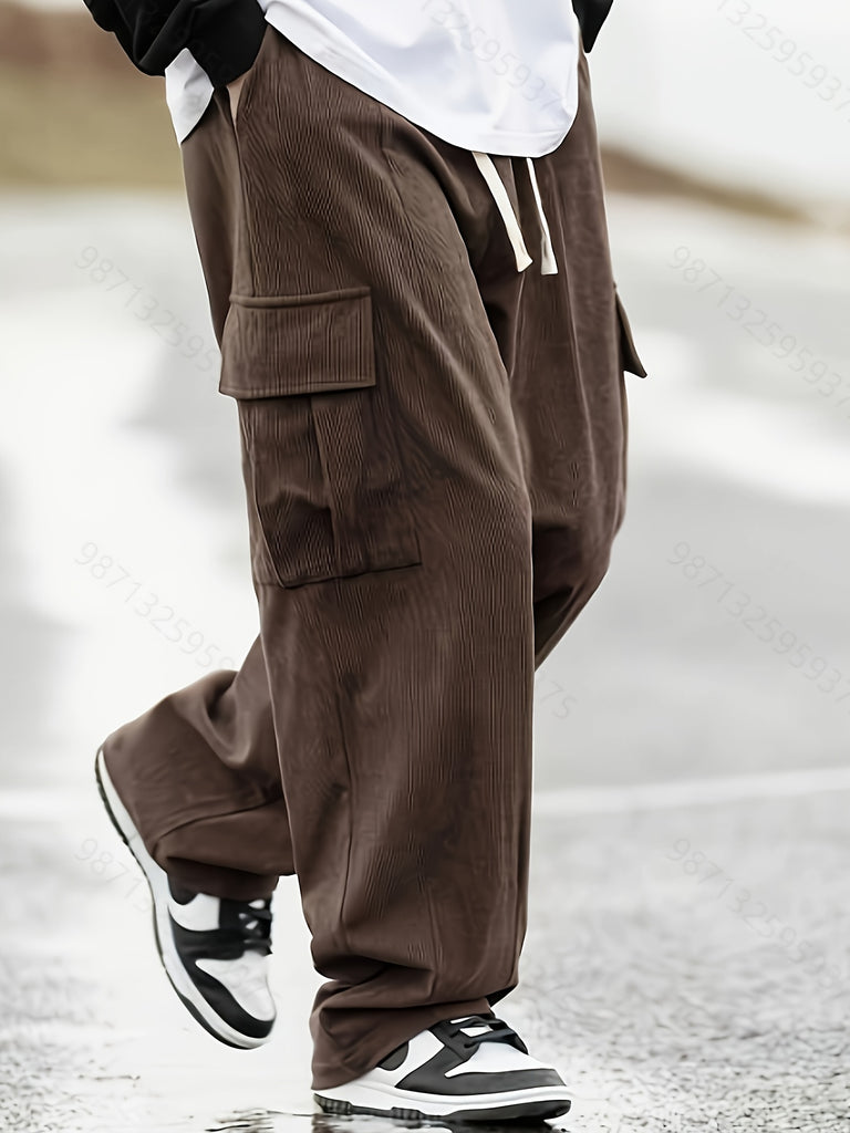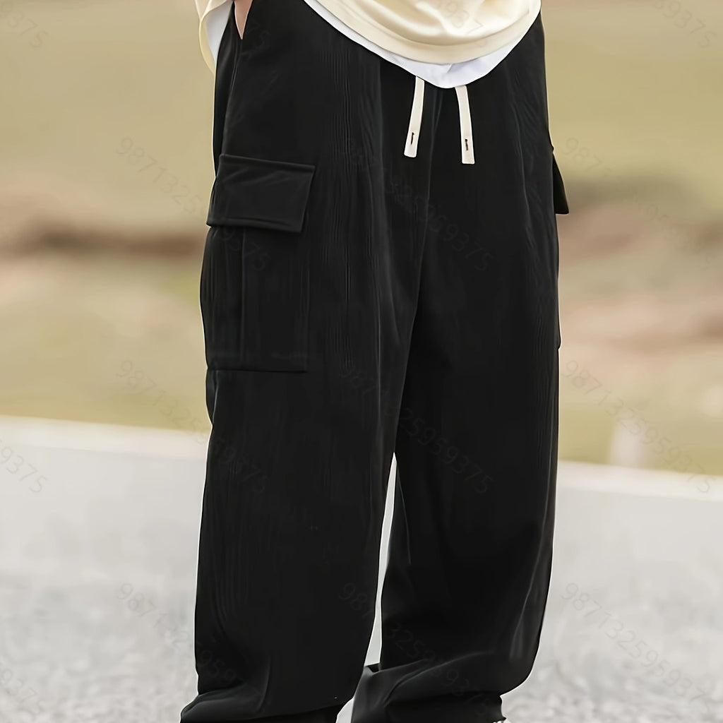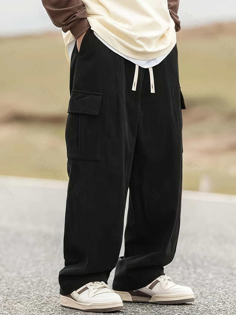 kkboxly Men's Stylish Vintage Style Loose Solid Cargo Pants With Pockets, Causal Breathable Straight Leg Drawstring Men's Bottom Clothing For City Walk Street Hanging Outdoor Activities