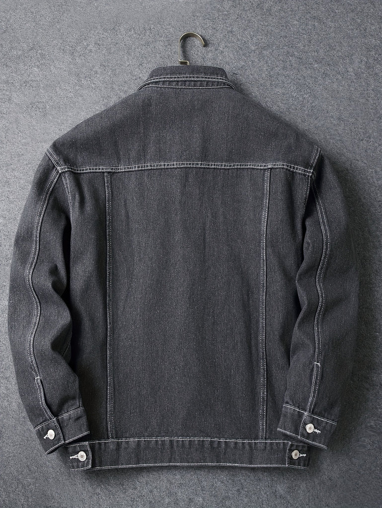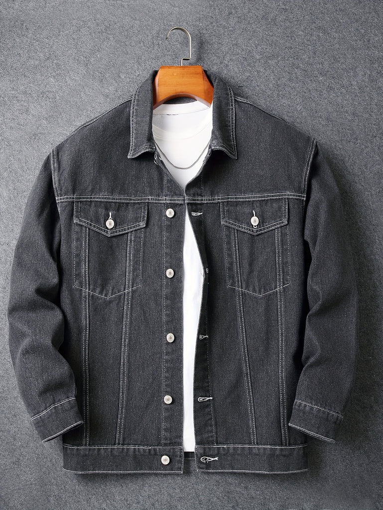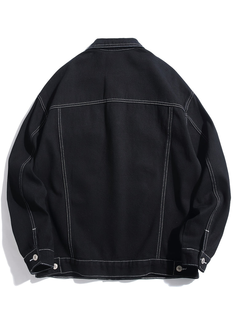 kkboxly Men's Trendy White Line Double Pocket Loose Denim Jacket