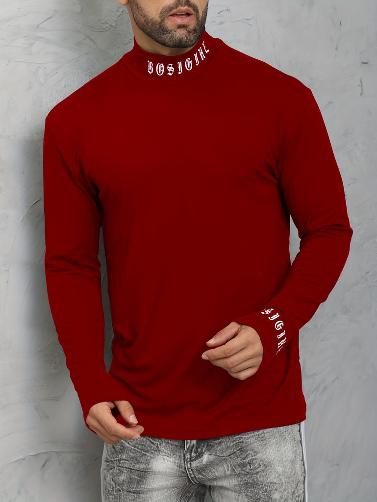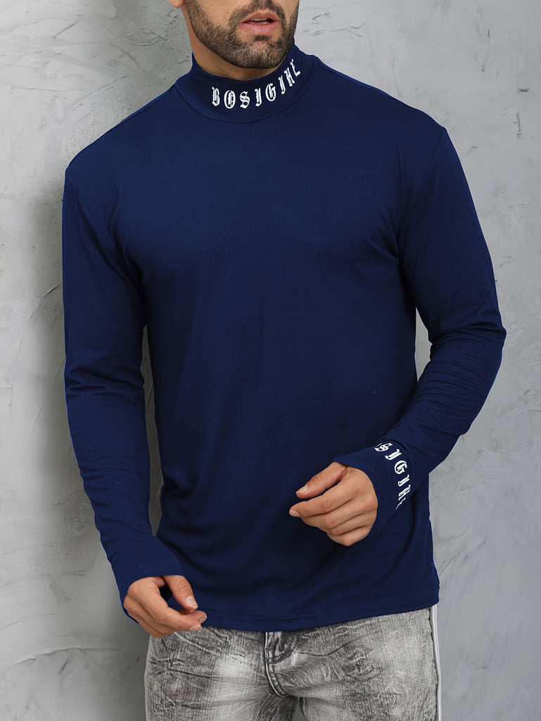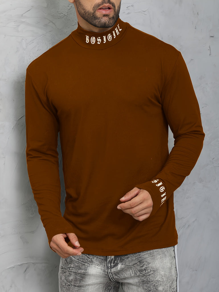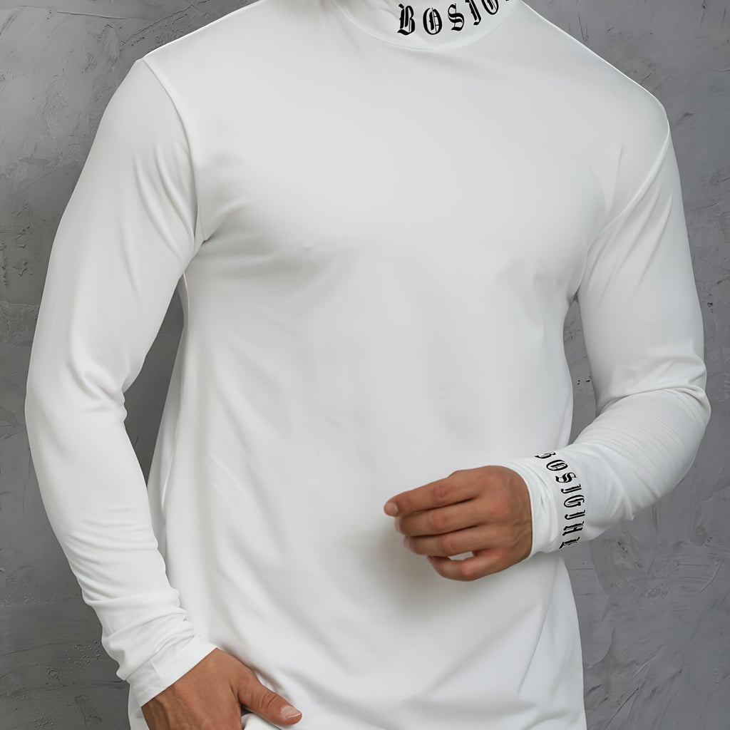 kkboxly Men's Turtleneck Long Sleeve T-Shirt, Casual Stretch Sports Tops For Spring Fall
