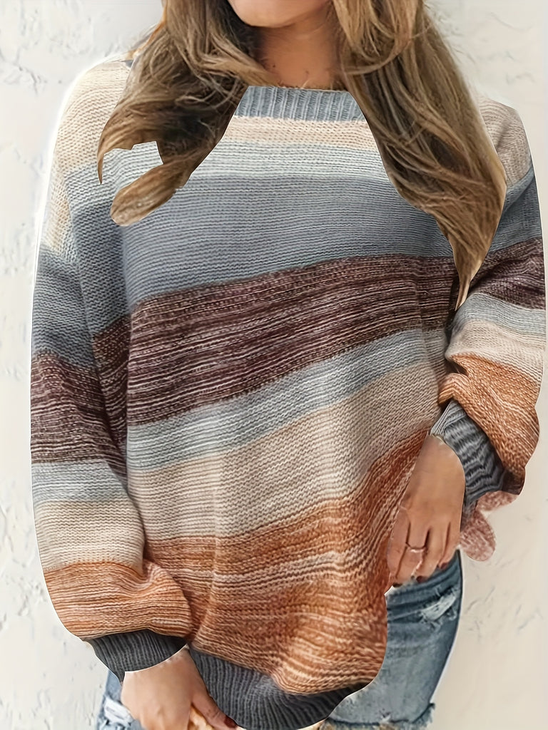 kkboxly Plus Size Casual Sweater, Women's Plus Colorblock Long Sleeve Round Neck High Stretch Jumper