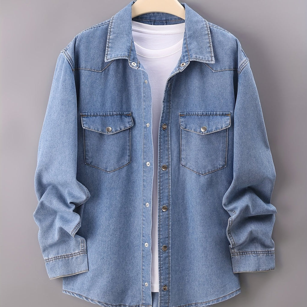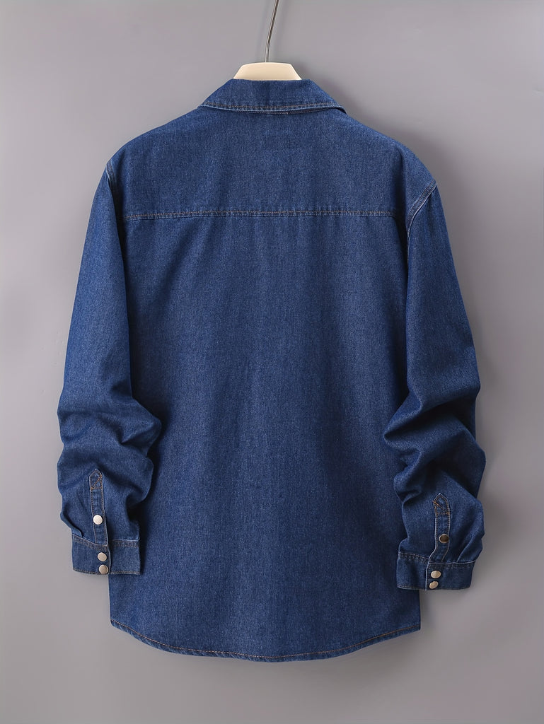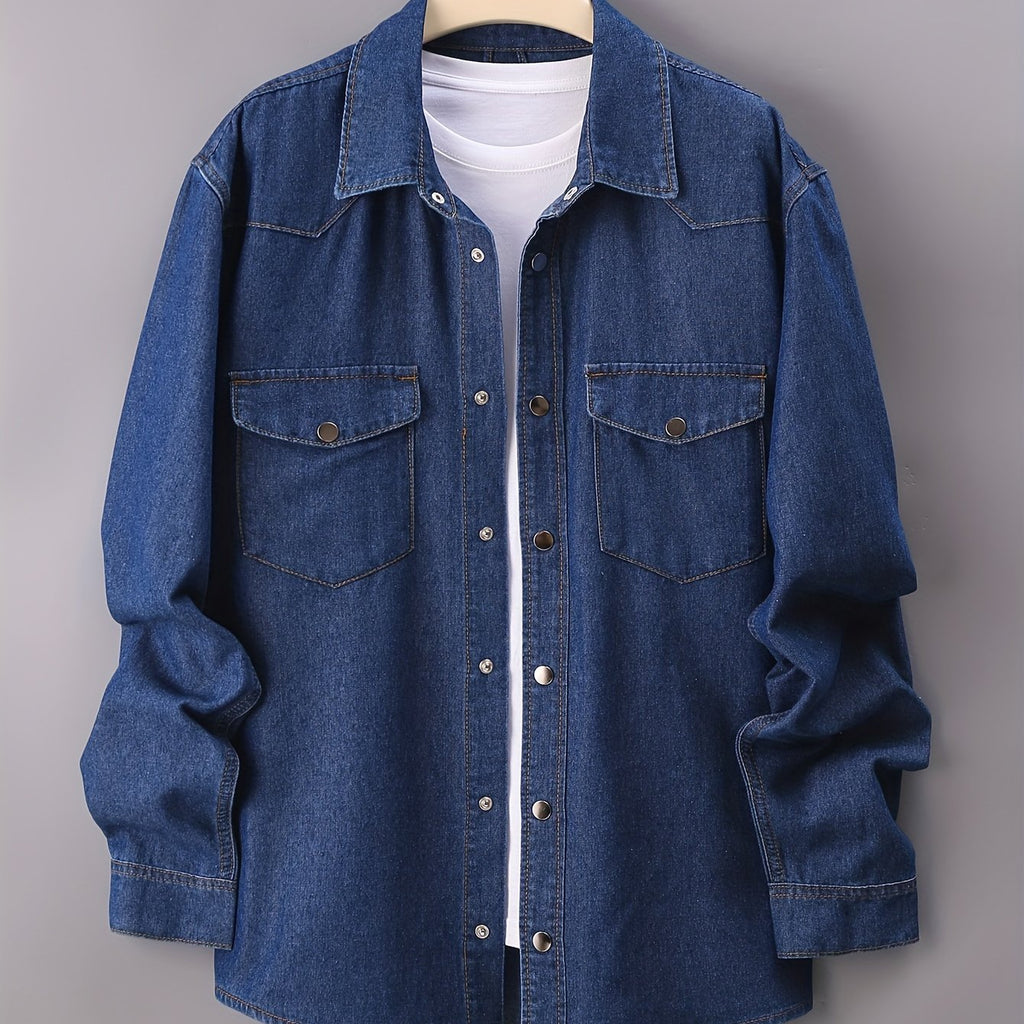 kkboxly Plus Size Men's Denim Shirt With Pockets For Spring & Autumn, Fashion Casual Long Sleeve Shirt For Big & Tall Guys