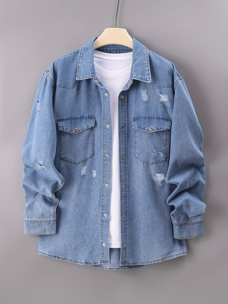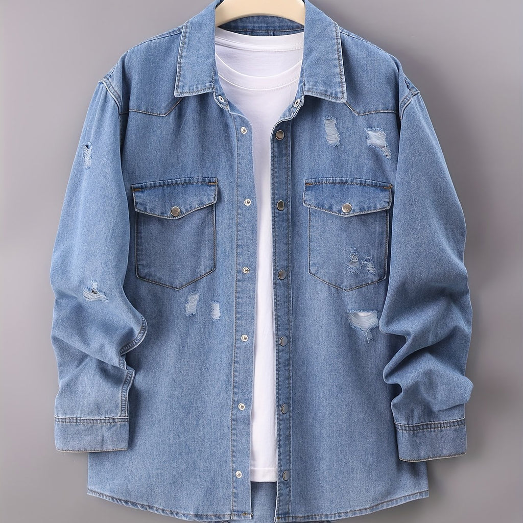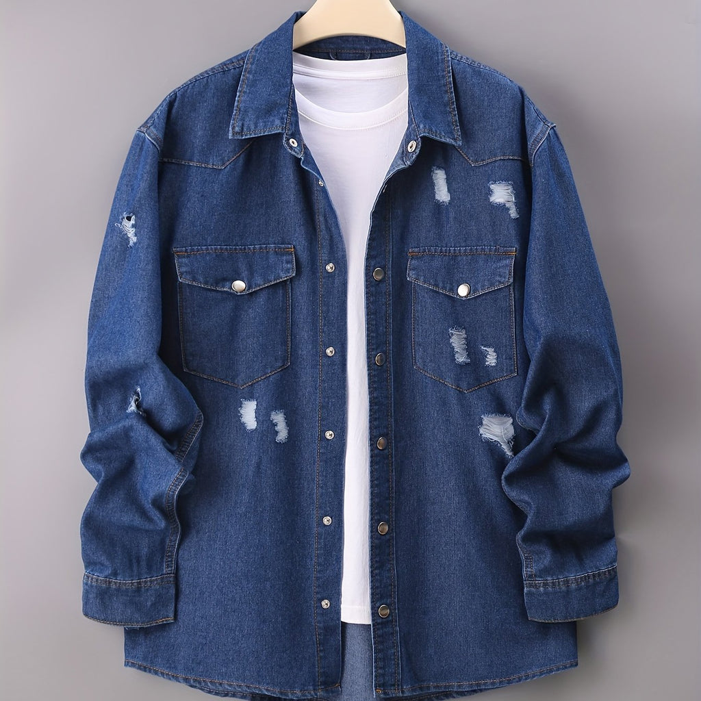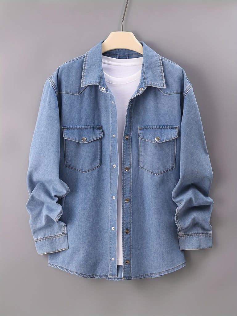 kkboxly Plus Size Men's Denim Shirt With Pockets For Spring & Autumn, Fashion Casual Long Sleeve Shirt For Big & Tall Guys