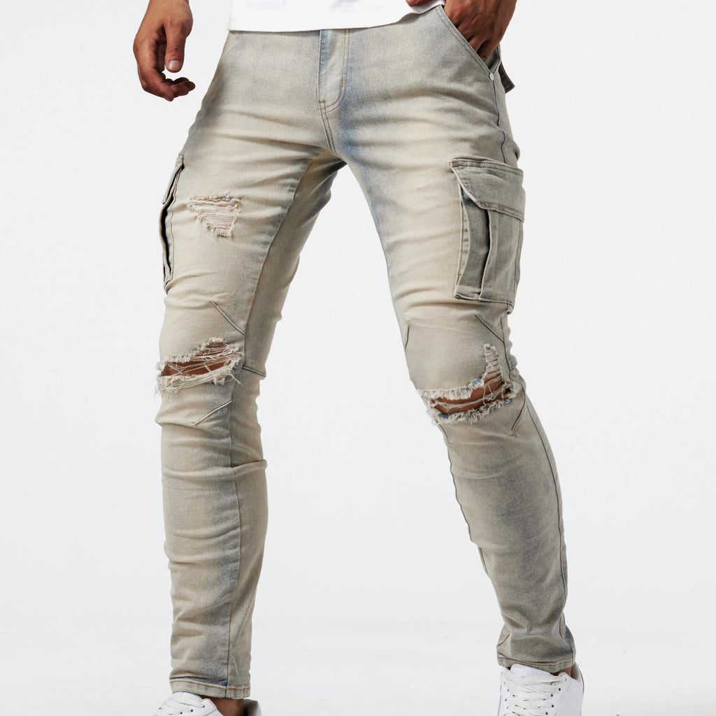 kkboxly Slim Fit Cargo Jeans, Men's Casual Street Style Multi Pocket High Stretch Denim Pants For Spring Summer