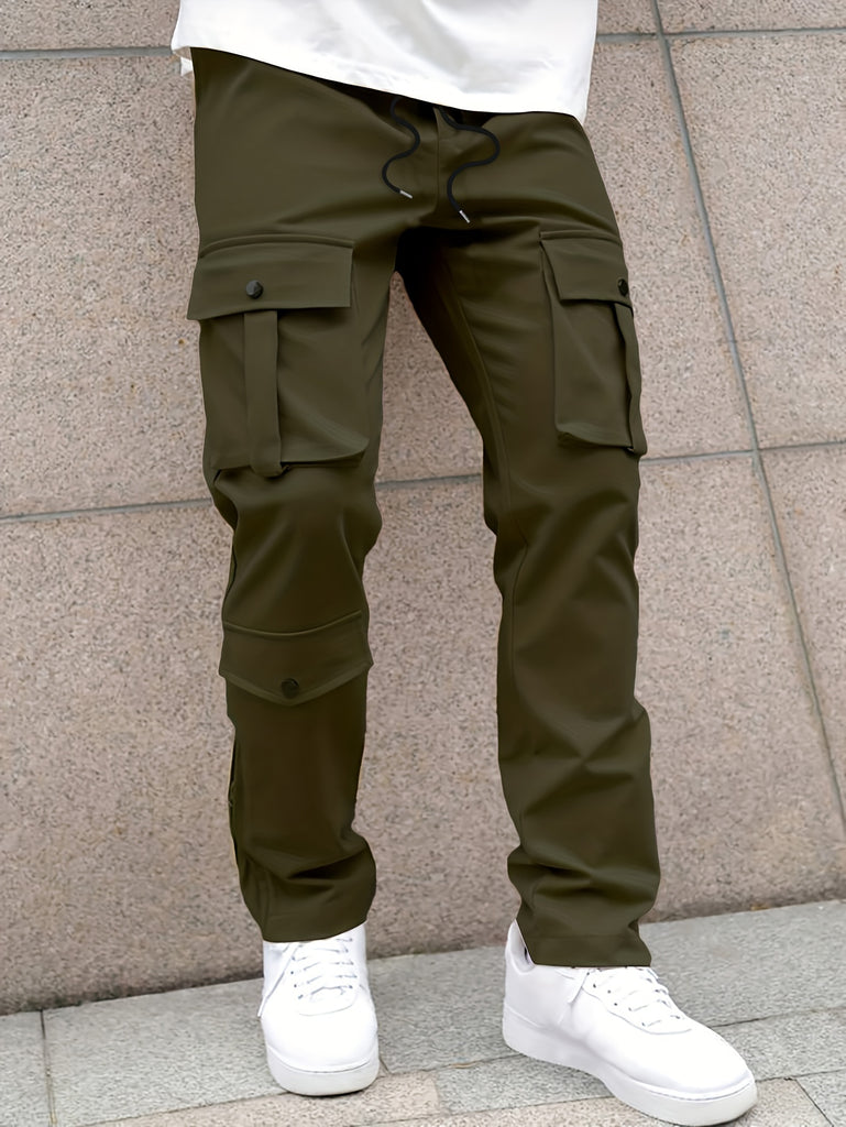 kkboxly Solid Multi Flap Pockets Men's Straight Leg Cargo Pants, Loose Casual Outdoor Pants, Men's Work Pants Streetwear
