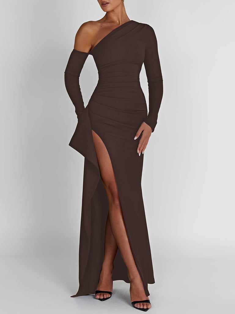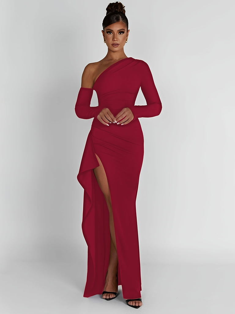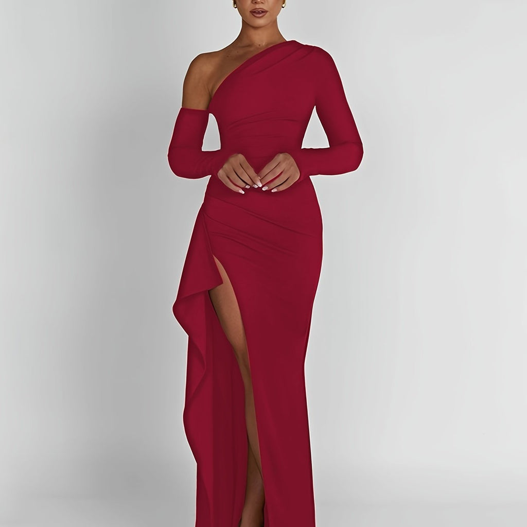 kkboxly Solid One-shoulder Split Hem Dress, Elegant Long Sleeve Ruffle Trim Slim Dress For Party & Banquet, Women's Clothing