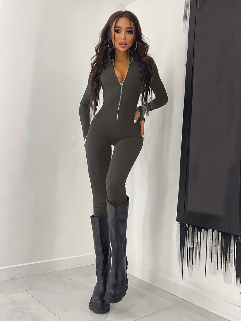 kkboxly Solid Zip Up Long Sleeve Bodycon Nightclub Jumpsuit, Sexy Long Length High Waist Jumpsuit, Women's Clothing