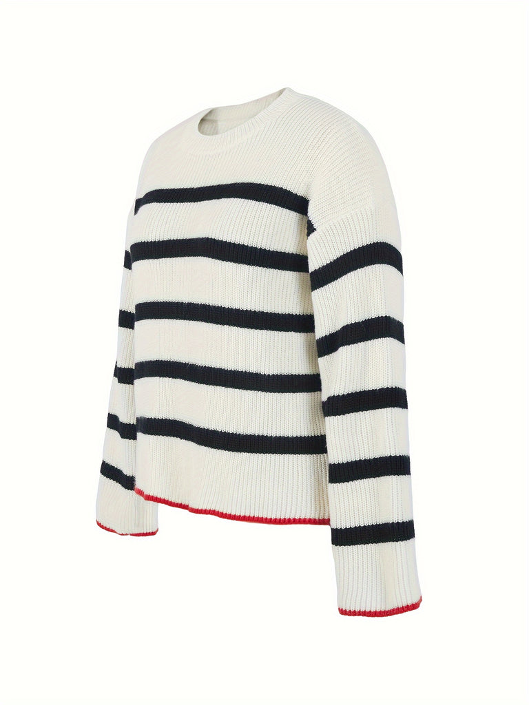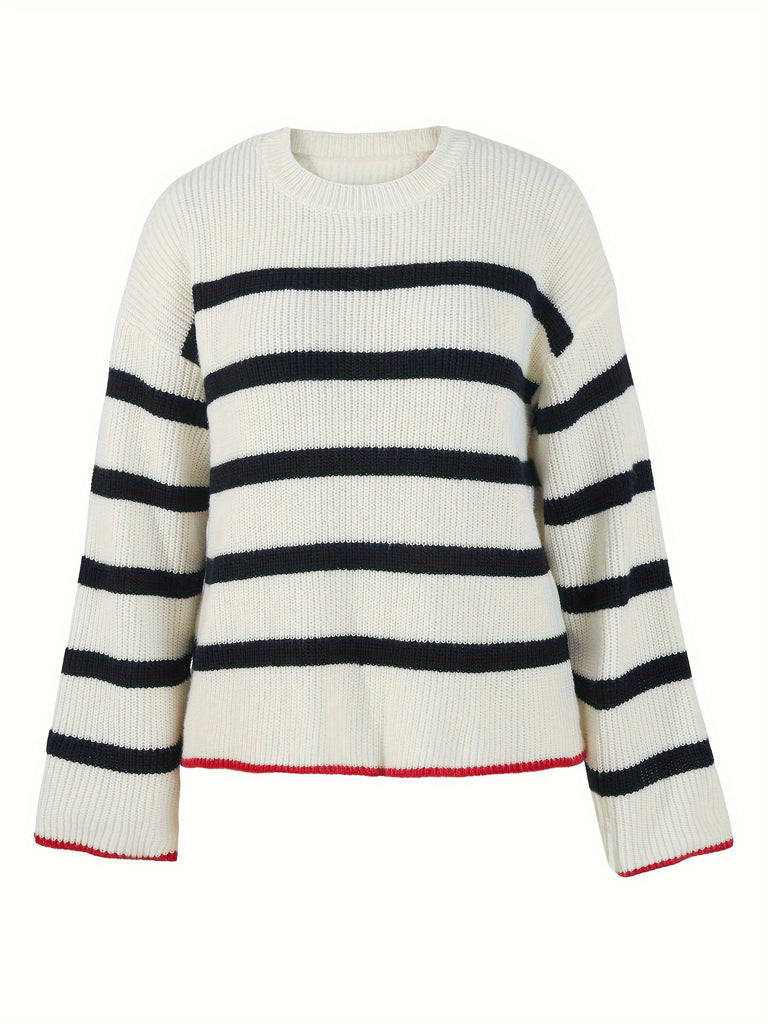 kkboxly Striped Crew Neck Loose Sweater, Elegant Long Sleeve Sweater For Fall & Winter, Women's Clothing